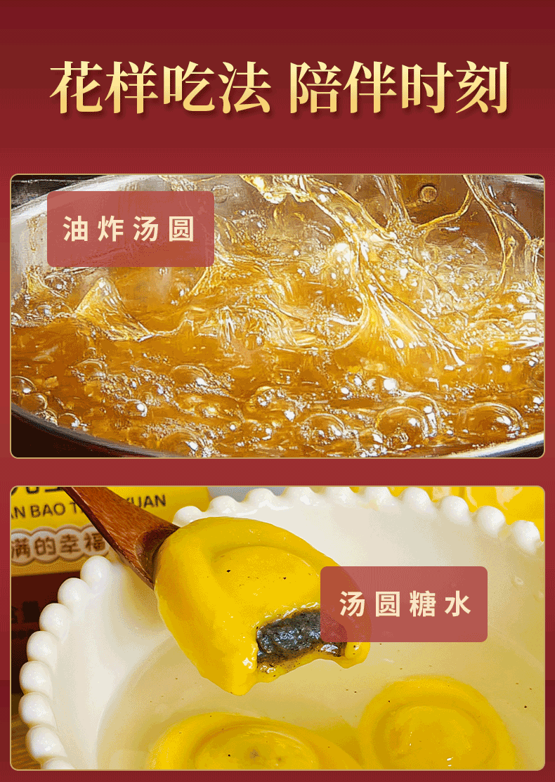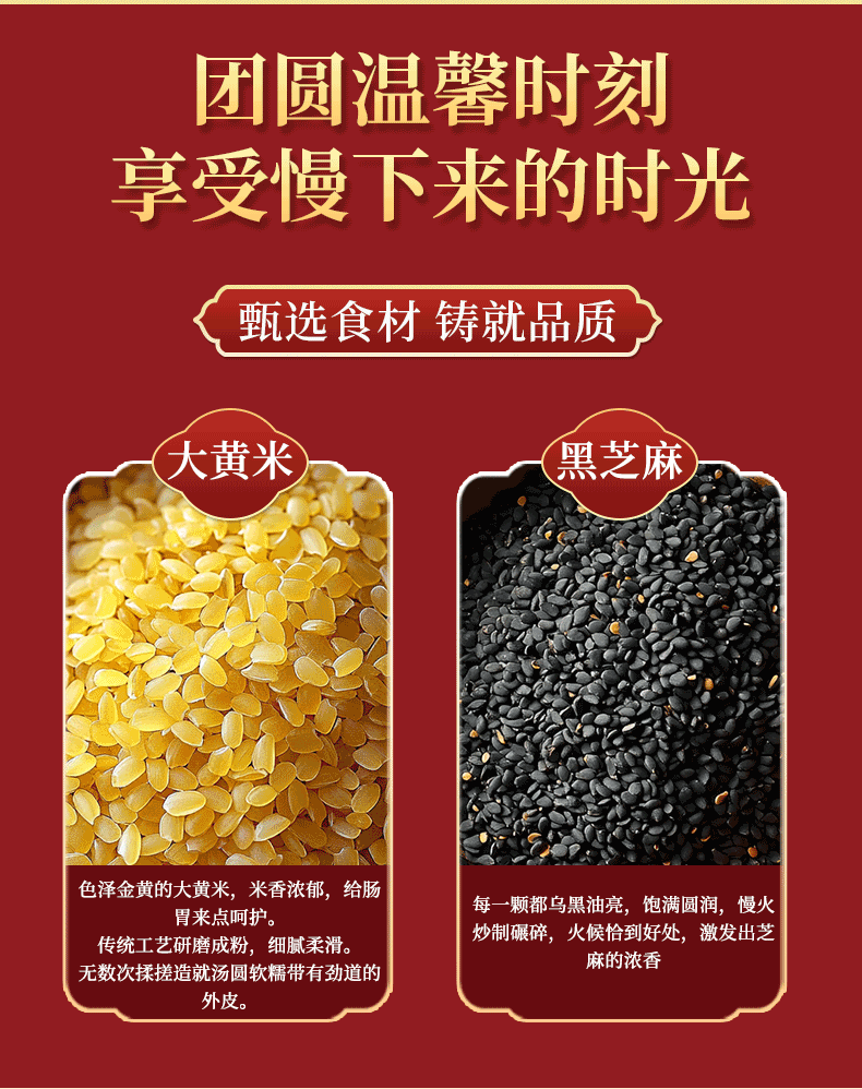 ① 严选原材料好原料,大黄米+糯米,精心配比,传统工艺研磨成粉,细腻柔滑,揉搓造就汤圆软糯带有劲道的外皮