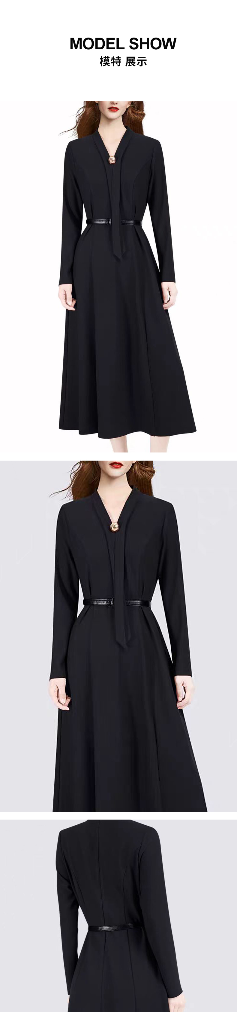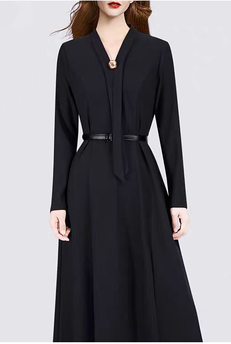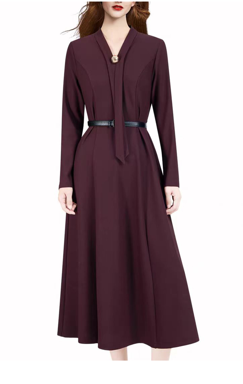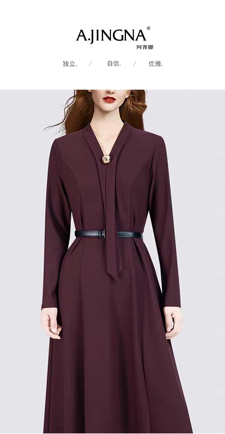 【飘带领】阿菁娜冬季新款飘带领收腰连衣裙酒红复古黑简约一键切换多场合穿搭F31C212006