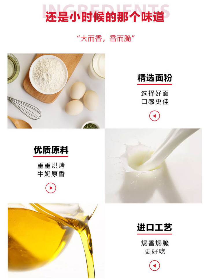 【配料】:小麦粉、白砂糖、食用植物油、葡萄糖浆、黄油、全脂乳粉、巴氏杀菌乳、食用盐、食品添加剂(碳酸氢钠、碳酸氢铵、乙基麦芽酚、食用香精、焦亚硫酸钠)