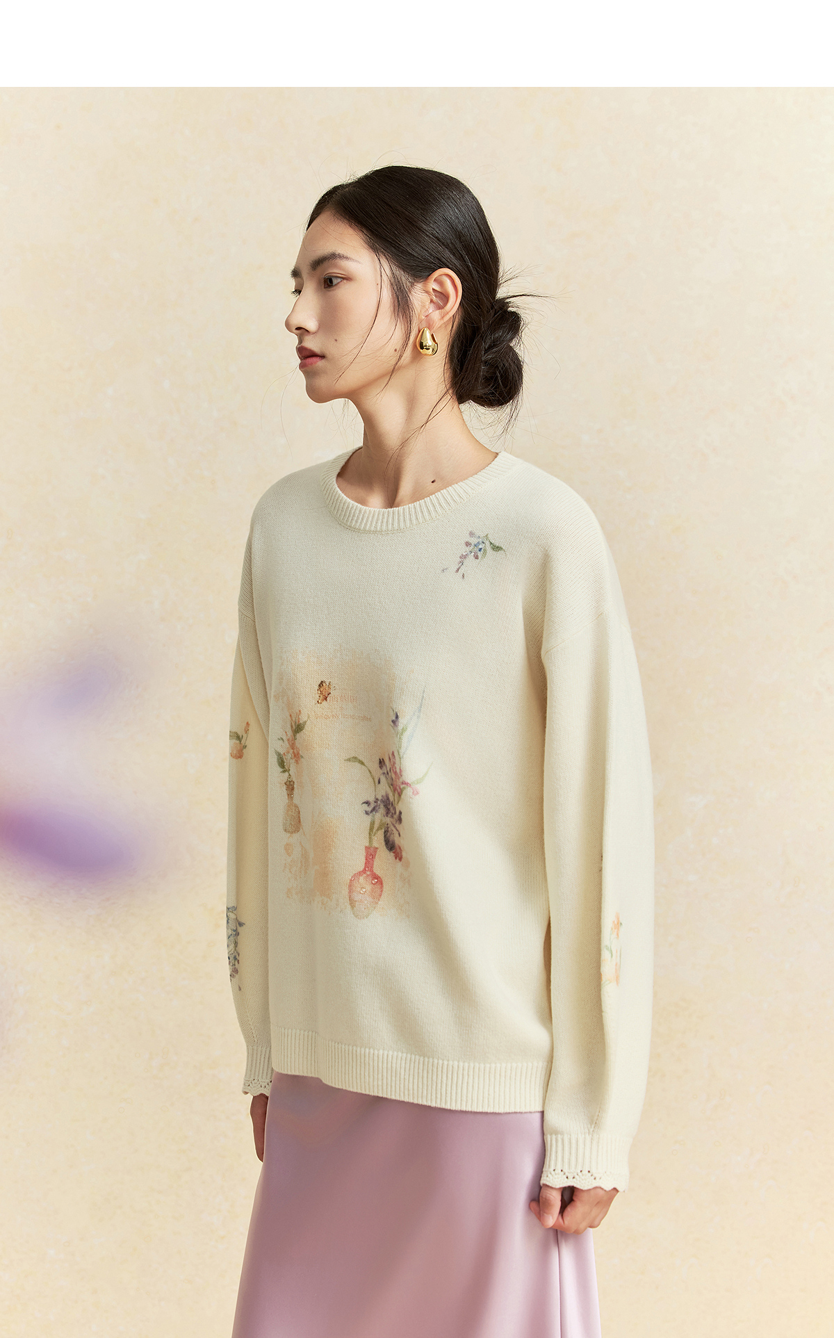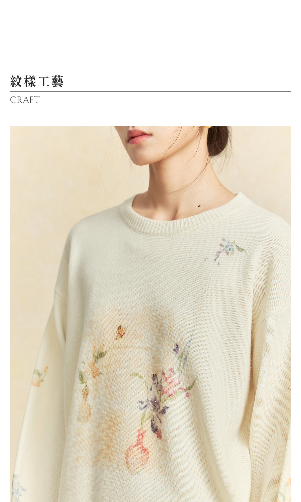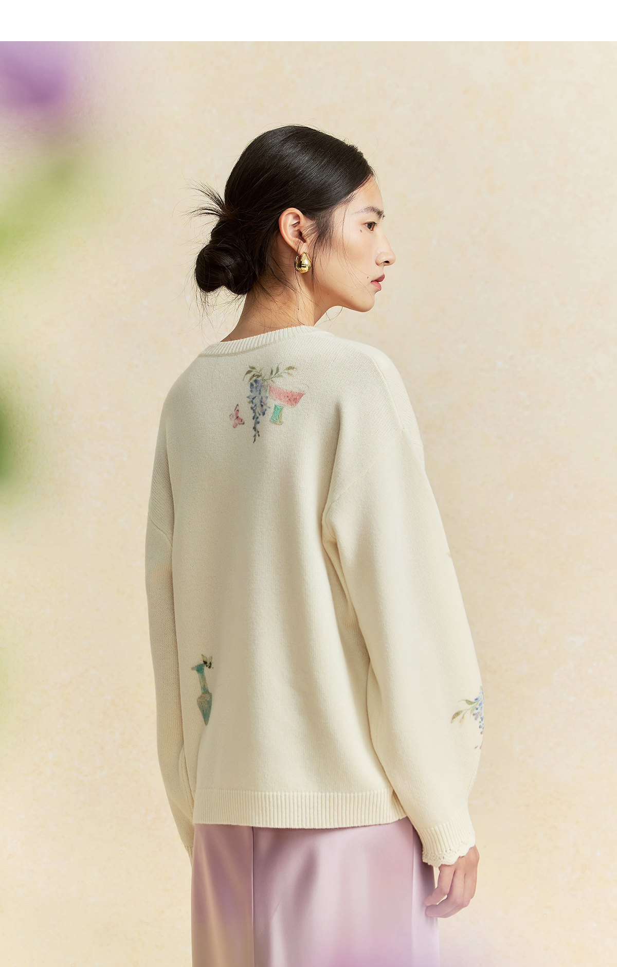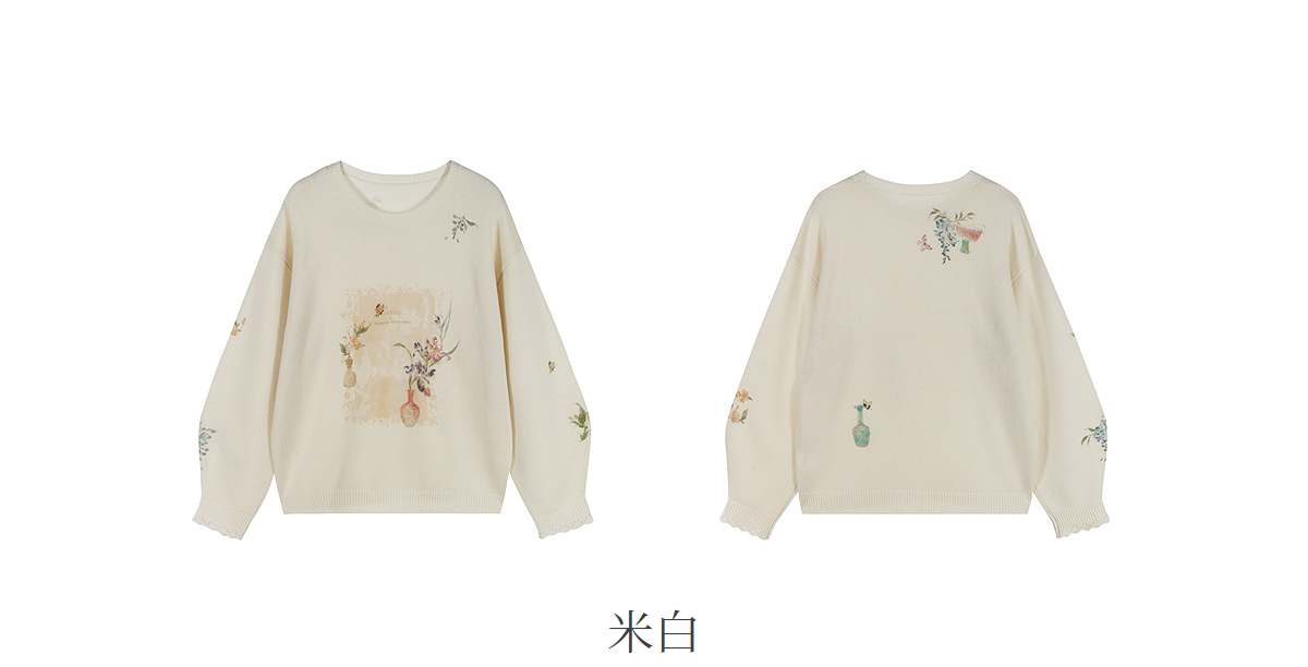 【林栖设计小店】宋瓷雅画|绵羊毛印花米白宽松新中式2026春新款毛织上衣1961049