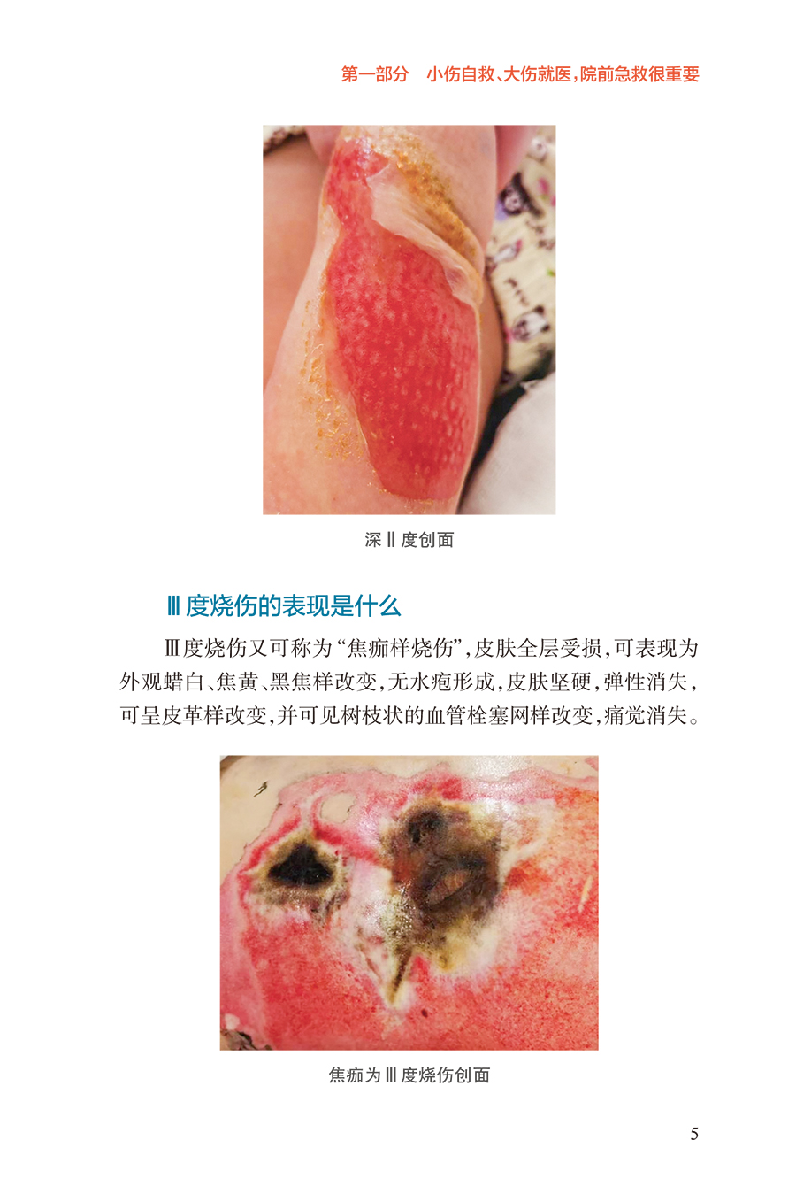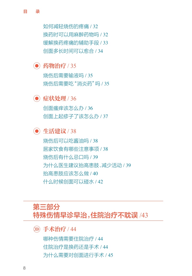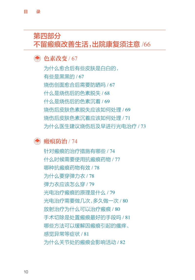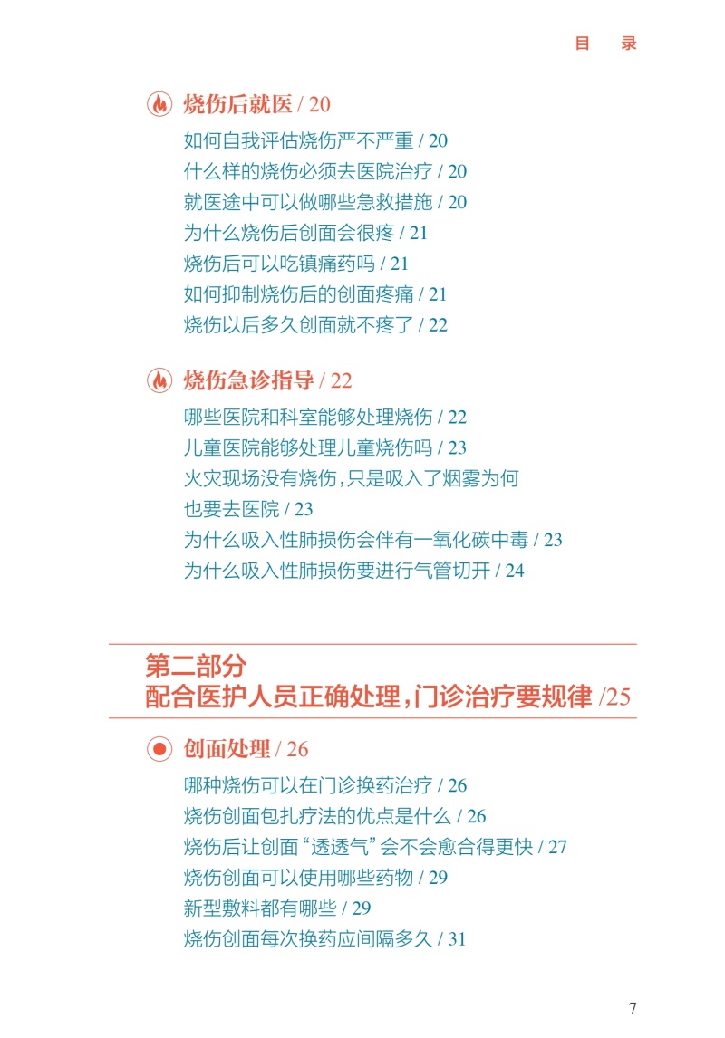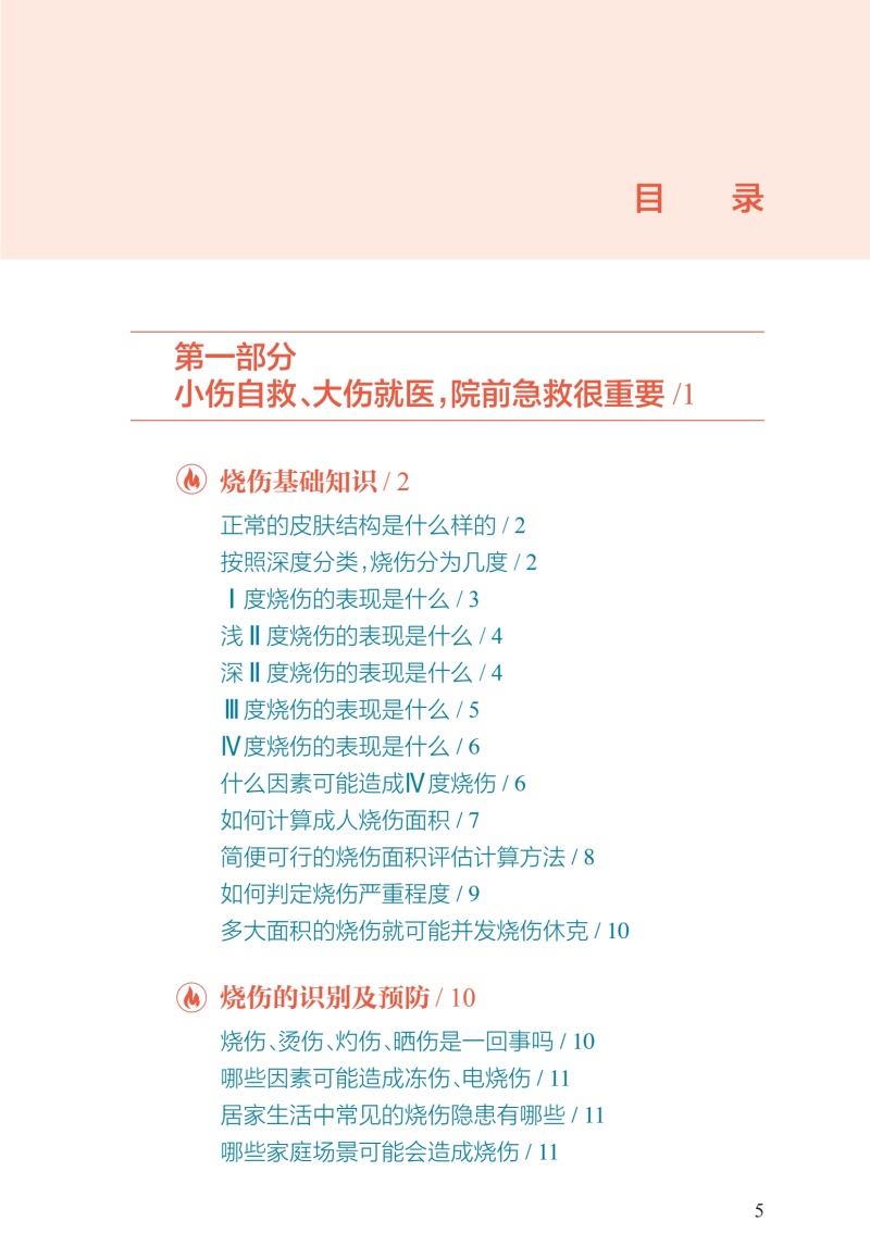 第一部分小伤自救、大伤就医,院前急救很重要/1 烧伤基础知识/2 正常的皮肤结构是什么样的/2 按照深度分类,烧伤分为几度/2 Ⅰ度烧伤的表现是什么/3 浅Ⅱ度烧伤的表现是什么/4 深Ⅱ度烧伤的表现是什么/4 Ⅲ度烧伤的表现是什么/5 Ⅳ度烧伤的表现是什么/6 什么因素可能造成Ⅳ度烧伤/6 如何计算成人烧伤面积/7 简便可行的烧伤面积评估计算方法/8 如何判定烧伤严重程度/9 多大面积的烧伤就可能并发烧伤休克/10 烧伤的识别及预防/10 烧伤、烫伤、灼伤、晒伤是一回事吗/10 哪些因素可能造成冻伤、电烧伤/11 居家生活中常见的烧伤隐患有哪些/11 哪些家庭场景可能会造成烧伤/11 哪些工作场景可能会造成烧伤/12 哪些户外场景可能会造成烧伤/12 哪些家庭物品可能造成化学烧伤/13 如何避免家庭中的化学烧伤/13 哪些家庭情景可能造成小儿烫伤/13 如何预防家庭小儿烫伤/14 哪些户外情景可能造成小儿烧伤/14 什么是低热烫伤/15 哪些情况可能造成低热烫伤/15 烧伤早期急救处置/15 烧伤发生后的第一时间应该 采取哪些措施/15 火灾现场能做哪些自我保护措施/16 烧伤后如何进行正确冲洗/16 哪些方法可以尽可能减轻烧伤的程度/16 烧伤后,院前急救的可行措施有哪些/17 在家中应该准备哪些物品和 药品来应对烧伤后的现场急救/17 烧伤后能用“民间偏方”吗/17 火灾现场,如何减少吸入性 肺损伤的发生/18 如何自我判断是否发生吸入性肺损伤/18 烧伤的居家处理/19 水疱到底要不要戳破/19 水疱皮要不要保留/19 在家中如何对烧伤创面进行换药/19 烧伤后就医/20 如何自我评估烧伤严不严重/20 什么样的烧伤必须去医院治疗/20 就医途中可以做哪些急救措施/20 为什么烧伤后创面会很疼/21 烧伤后可以吃镇痛药吗/21 如何抑制烧伤后的创面疼痛/21 烧伤以后多久创面就不疼了/22 烧伤急诊指导/22 哪些医院和科室能够处理烧伤/22 儿童医院能够处理儿童烧伤吗/23 火灾现场没有烧伤,只是吸入了烟雾为何 也要去医院/23 为什么吸入性肺损伤会伴有一氧化碳中毒/23 为什么吸入性肺损伤要进行气管切开/24 第二部分配合医护人员正确处理,门诊治疗要规律/25 创面处理/26 哪种烧伤可以在门诊换药治疗/26 烧伤创面包扎疗法的优点是什么/26 烧伤后让创面“透透气”会不会愈合得更快/27 烧伤创面可以使用哪些药物/29 新型敷料都有哪些/29 烧伤创面每次换药应间隔多久/31 如何减轻烧伤的疼痛/32 换药时可以用麻醉药物吗/32 缓解换药疼痛的辅助手段/33 创面多长时间可以愈合/34 药物治疗/35 烧伤后需要输液吗/35 烧伤后需要吃“消炎药”吗/35 症状处理/36 创面瘙痒该怎么办/36 创面上起疹子了该怎么办/37 生活建议/38 烧伤后可以吃酱油吗/38 居家饮食有哪些注意事项/38 烧伤后有什么忌口吗/39 为什么医生建议抬高患肢、减少活动/39 抬高患肢应该怎么做/40 什么时候创面可以碰水/42 第三部分特殊伤情早诊早治,住院治疗不耽误/43 手术治疗/44 哪种伤情需要住院治疗/44 住院治疗是换药还是手术/44 为什么需要对创面进行手术/45 哪些创面需要手术治疗/46 手术有哪些类型/46 手术治疗时,取皮会不会产生新的瘢痕/49 植皮术怎么做/50 烧伤创面有哪些治疗方案/51 烧伤后怎样才能不留瘢痕/52 为什么植皮的地方也会长瘢痕/53 植皮术后哪些治疗可以预防瘢痕增生/54 瘢痕是如何产生的/55 瘢痕体质患者如何更好地预防瘢痕增生/57 饮食建议/58 住院治疗期间什么能吃,什么不能吃/58 烧伤治疗期间可以吃鱼虾吗/58 鸽子汤、鲫鱼汤是否能够促进创面愈合/59 如何饮食可以帮助烧伤创面愈合/59 特殊治疗/60 为什么有些严重烧伤患者需要进行气管切开/60 气管切开后还能说话吗/61 气管切开后是不是就只能带管生存了/62 气管切开是不是意味着病情很严重了/62 为什么呼吸道损伤后会出现声音嘶哑/63 呼吸道损伤有什么后遗症/63 严重烧伤早期为什么要导尿或记录小便情况/64 烧伤早期为什么要半卧位或半坐位/65 第四部分不留瘢痕改善生活,出院康复须注意/66 色素改变/67 为什么愈合后有些皮肤是白白的, 有些是黑黑的/67 烧伤创面愈合后需要防晒吗/67 什么是烧伤后的色素脱失/68 什么是烧伤后的色素沉着/69 烧伤后皮肤色素脱失应该如何处理/69 烧伤后皮肤色素沉着应该如何处理/71 为什么医生建议烧伤后及早进行光电治疗/73 瘢痕防治/74 针对瘢痕的治疗措施有哪些/74 什么时候需要使用抗瘢痕药物/77 哪种抗瘢痕药物有效/78 为什么要穿弹力衣/78 弹力衣应该怎么穿/79 光电治疗瘢痕的原理是什么/79 光电治疗需要做几次,多久做一次/80 放射治疗为什么可以治疗瘢痕/80 手术切除是处置瘢痕最好的手段吗/81 哪些方法可以缓解因瘢痕引起的瘙痒、 感觉异常等症状/81 为什么关节处的瘢痕会影响活动/82 功能康复/82 为什么受伤的肢体变得僵硬了/82 烧伤后如何有效进行康复治疗/83 门诊随访/84 为什么要进行门诊复诊/84 烧伤创面愈合后多久复诊一次/84