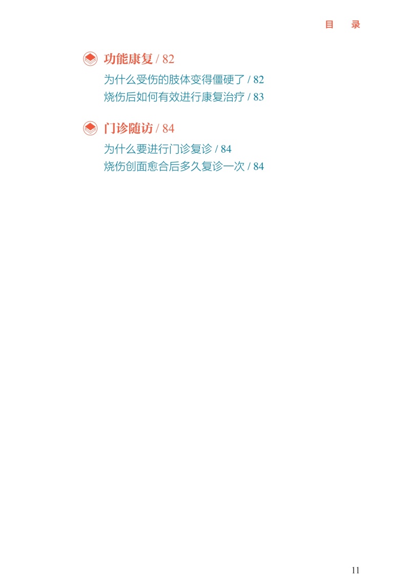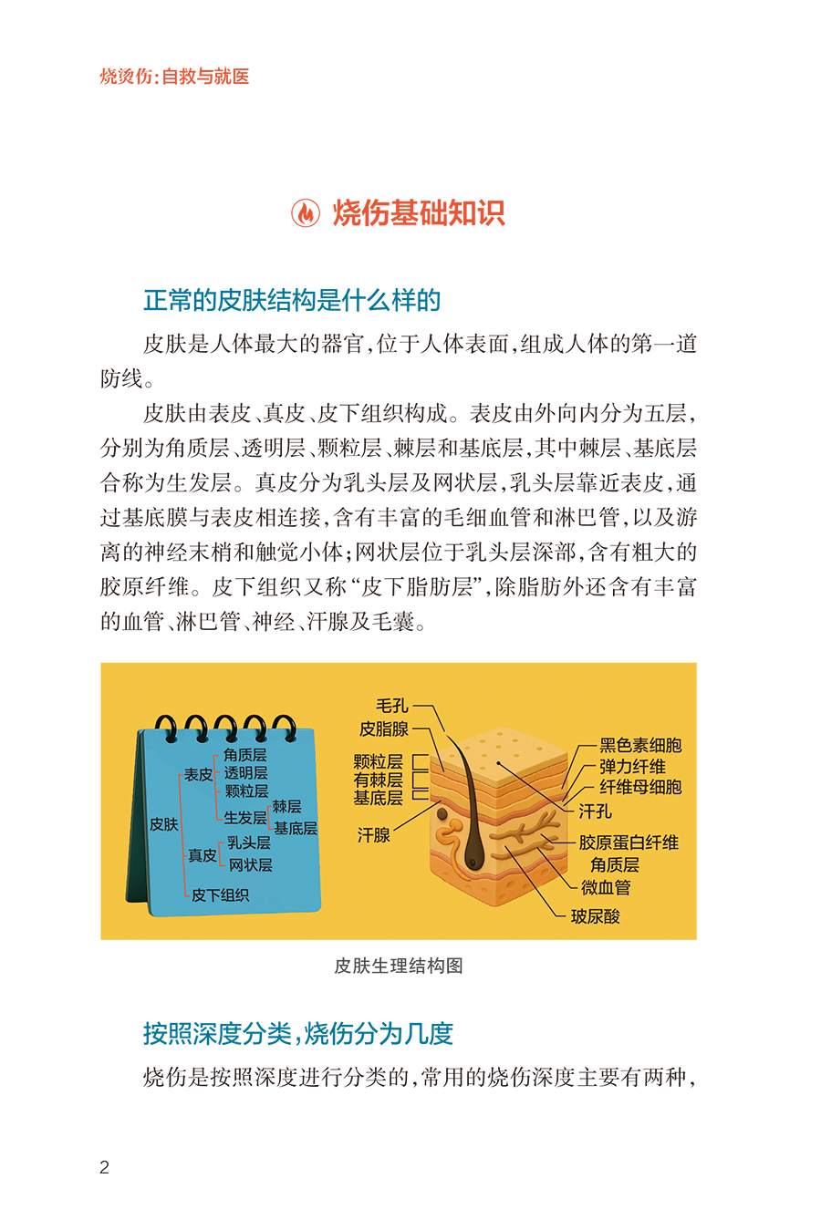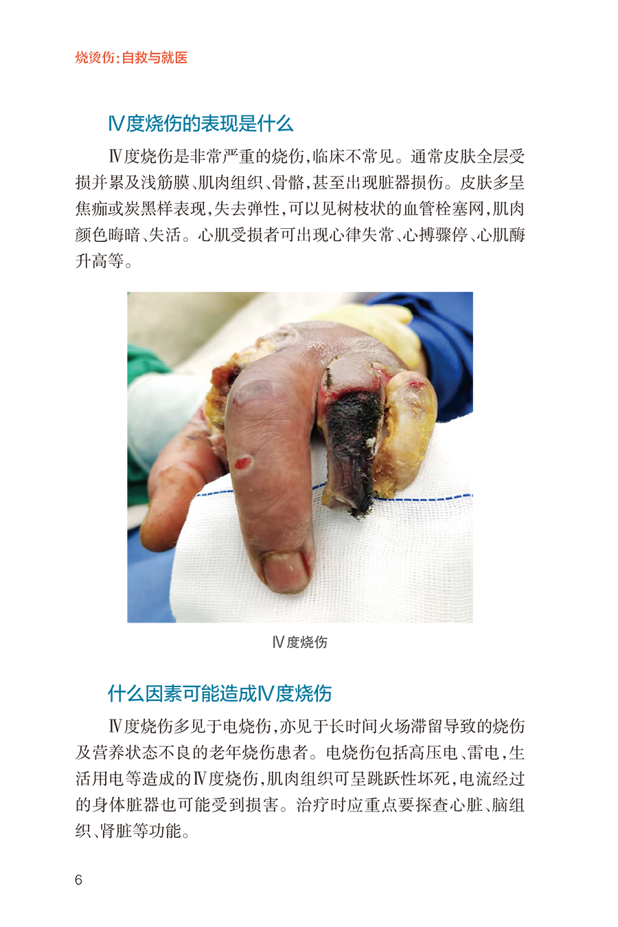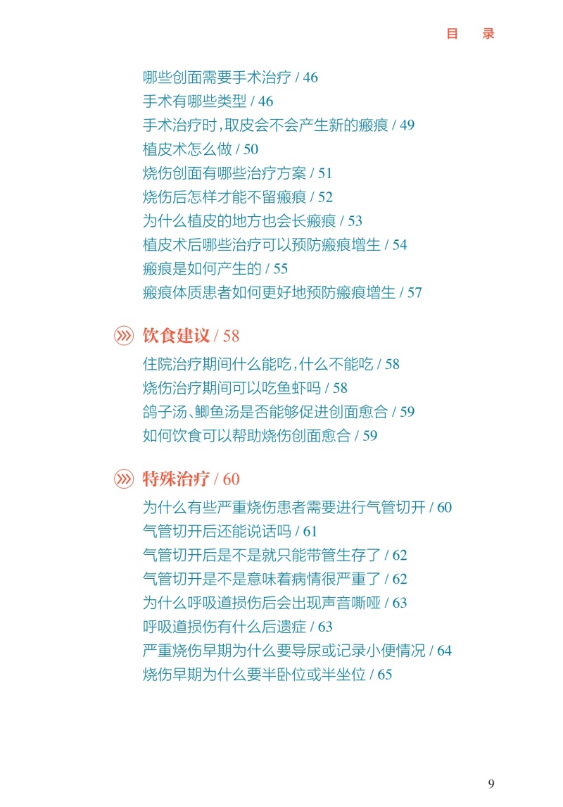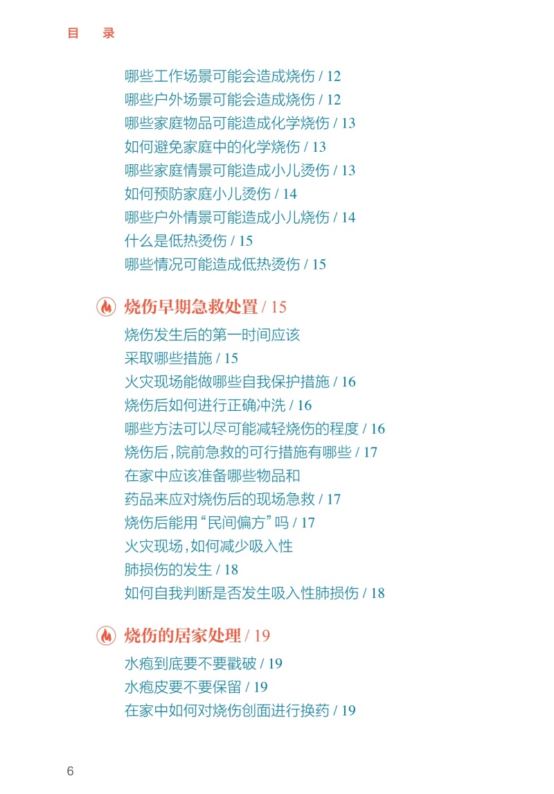 第一部分小伤自救、大伤就医,院前急救很重要/1 烧伤基础知识/2 正常的皮肤结构是什么样的/2 按照深度分类,烧伤分为几度/2 Ⅰ度烧伤的表现是什么/3 浅Ⅱ度烧伤的表现是什么/4 深Ⅱ度烧伤的表现是什么/4 Ⅲ度烧伤的表现是什么/5 Ⅳ度烧伤的表现是什么/6 什么因素可能造成Ⅳ度烧伤/6 如何计算成人烧伤面积/7 简便可行的烧伤面积评估计算方法/8 如何判定烧伤严重程度/9 多大面积的烧伤就可能并发烧伤休克/10 烧伤的识别及预防/10 烧伤、烫伤、灼伤、晒伤是一回事吗/10 哪些因素可能造成冻伤、电烧伤/11 居家生活中常见的烧伤隐患有哪些/11 哪些家庭场景可能会造成烧伤/11 哪些工作场景可能会造成烧伤/12 哪些户外场景可能会造成烧伤/12 哪些家庭物品可能造成化学烧伤/13 如何避免家庭中的化学烧伤/13 哪些家庭情景可能造成小儿烫伤/13 如何预防家庭小儿烫伤/14 哪些户外情景可能造成小儿烧伤/14 什么是低热烫伤/15 哪些情况可能造成低热烫伤/15 烧伤早期急救处置/15 烧伤发生后的第一时间应该 采取哪些措施/15 火灾现场能做哪些自我保护措施/16 烧伤后如何进行正确冲洗/16 哪些方法可以尽可能减轻烧伤的程度/16 烧伤后,院前急救的可行措施有哪些/17 在家中应该准备哪些物品和 药品来应对烧伤后的现场急救/17 烧伤后能用“民间偏方”吗/17 火灾现场,如何减少吸入性 肺损伤的发生/18 如何自我判断是否发生吸入性肺损伤/18 烧伤的居家处理/19 水疱到底要不要戳破/19 水疱皮要不要保留/19 在家中如何对烧伤创面进行换药/19 烧伤后就医/20 如何自我评估烧伤严不严重/20 什么样的烧伤必须去医院治疗/20 就医途中可以做哪些急救措施/20 为什么烧伤后创面会很疼/21 烧伤后可以吃镇痛药吗/21 如何抑制烧伤后的创面疼痛/21 烧伤以后多久创面就不疼了/22 烧伤急诊指导/22 哪些医院和科室能够处理烧伤/22 儿童医院能够处理儿童烧伤吗/23 火灾现场没有烧伤,只是吸入了烟雾为何 也要去医院/23 为什么吸入性肺损伤会伴有一氧化碳中毒/23 为什么吸入性肺损伤要进行气管切开/24 第二部分配合医护人员正确处理,门诊治疗要规律/25 创面处理/26 哪种烧伤可以在门诊换药治疗/26 烧伤创面包扎疗法的优点是什么/26 烧伤后让创面“透透气”会不会愈合得更快/27 烧伤创面可以使用哪些药物/29 新型敷料都有哪些/29 烧伤创面每次换药应间隔多久/31 如何减轻烧伤的疼痛/32 换药时可以用麻醉药物吗/32 缓解换药疼痛的辅助手段/33 创面多长时间可以愈合/34 药物治疗/35 烧伤后需要输液吗/35 烧伤后需要吃“消炎药”吗/35 症状处理/36 创面瘙痒该怎么办/36 创面上起疹子了该怎么办/37 生活建议/38 烧伤后可以吃酱油吗/38 居家饮食有哪些注意事项/38 烧伤后有什么忌口吗/39 为什么医生建议抬高患肢、减少活动/39 抬高患肢应该怎么做/40 什么时候创面可以碰水/42 第三部分特殊伤情早诊早治,住院治疗不耽误/43 手术治疗/44 哪种伤情需要住院治疗/44 住院治疗是换药还是手术/44 为什么需要对创面进行手术/45 哪些创面需要手术治疗/46 手术有哪些类型/46 手术治疗时,取皮会不会产生新的瘢痕/49 植皮术怎么做/50 烧伤创面有哪些治疗方案/51 烧伤后怎样才能不留瘢痕/52 为什么植皮的地方也会长瘢痕/53 植皮术后哪些治疗可以预防瘢痕增生/54 瘢痕是如何产生的/55 瘢痕体质患者如何更好地预防瘢痕增生/57 饮食建议/58 住院治疗期间什么能吃,什么不能吃/58 烧伤治疗期间可以吃鱼虾吗/58 鸽子汤、鲫鱼汤是否能够促进创面愈合/59 如何饮食可以帮助烧伤创面愈合/59 特殊治疗/60 为什么有些严重烧伤患者需要进行气管切开/60 气管切开后还能说话吗/61 气管切开后是不是就只能带管生存了/62 气管切开是不是意味着病情很严重了/62 为什么呼吸道损伤后会出现声音嘶哑/63 呼吸道损伤有什么后遗症/63 严重烧伤早期为什么要导尿或记录小便情况/64 烧伤早期为什么要半卧位或半坐位/65 第四部分不留瘢痕改善生活,出院康复须注意/66 色素改变/67 为什么愈合后有些皮肤是白白的, 有些是黑黑的/67 烧伤创面愈合后需要防晒吗/67 什么是烧伤后的色素脱失/68 什么是烧伤后的色素沉着/69 烧伤后皮肤色素脱失应该如何处理/69 烧伤后皮肤色素沉着应该如何处理/71 为什么医生建议烧伤后及早进行光电治疗/73 瘢痕防治/74 针对瘢痕的治疗措施有哪些/74 什么时候需要使用抗瘢痕药物/77 哪种抗瘢痕药物有效/78 为什么要穿弹力衣/78 弹力衣应该怎么穿/79 光电治疗瘢痕的原理是什么/79 光电治疗需要做几次,多久做一次/80 放射治疗为什么可以治疗瘢痕/80 手术切除是处置瘢痕最好的手段吗/81 哪些方法可以缓解因瘢痕引起的瘙痒、 感觉异常等症状/81 为什么关节处的瘢痕会影响活动/82 功能康复/82 为什么受伤的肢体变得僵硬了/82 烧伤后如何有效进行康复治疗/83 门诊随访/84 为什么要进行门诊复诊/84 烧伤创面愈合后多久复诊一次/84