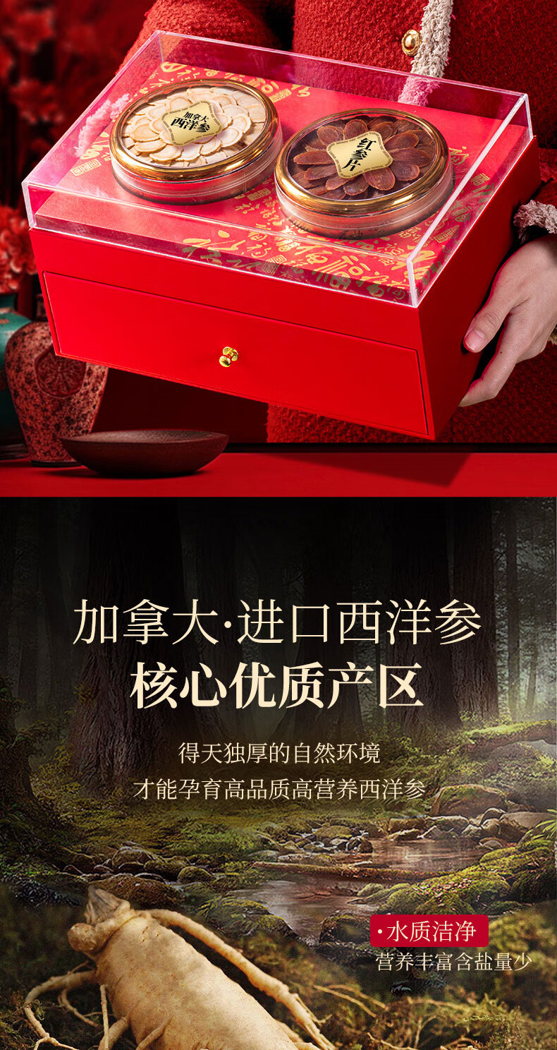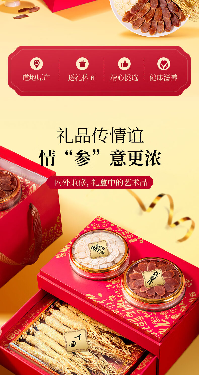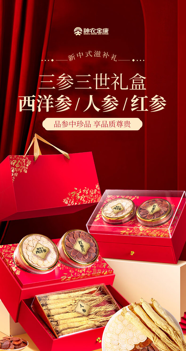 神农金康 人参西洋参红参三拼礼盒185g 营养品送礼父母长辈女神节礼物