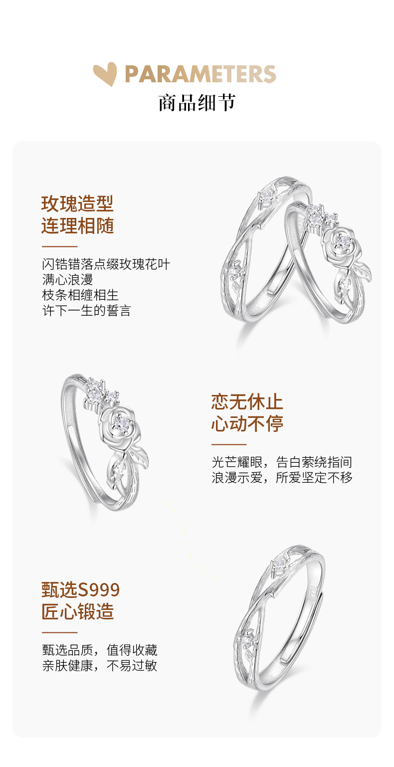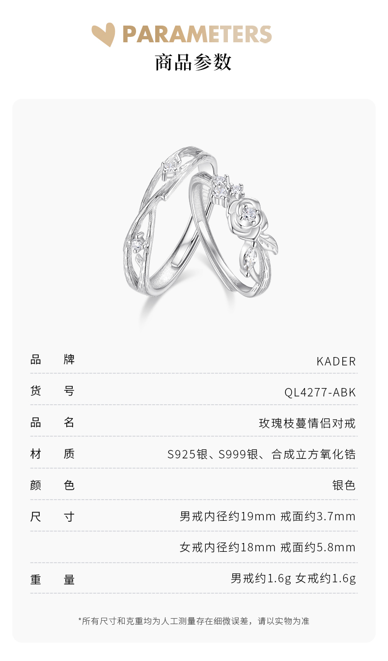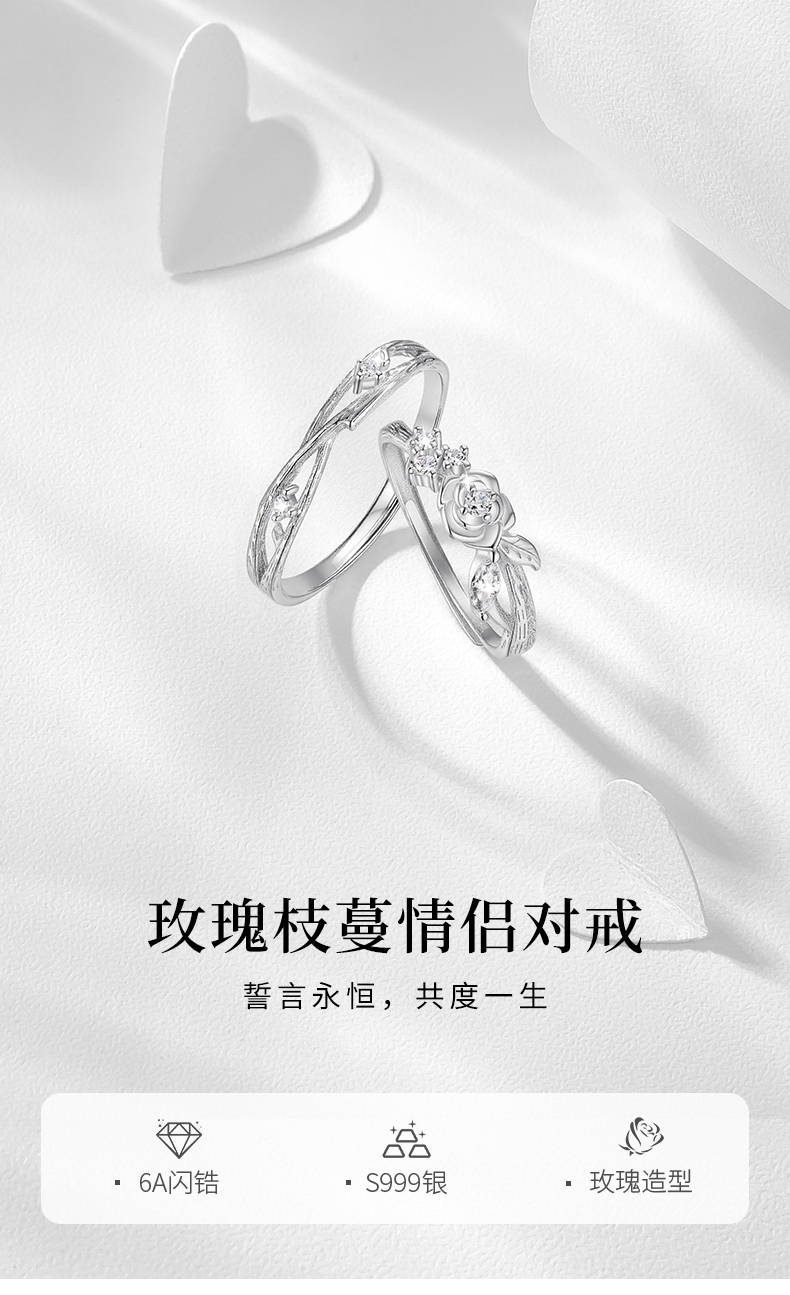卡蒂罗KADER 荆棘玫瑰情侣对戒 足银999/925银 轻奢小众精致浪漫男女友氛围感开口可调节一对 简约气质高级感钟爱久久恋爱告白炙热的爱意