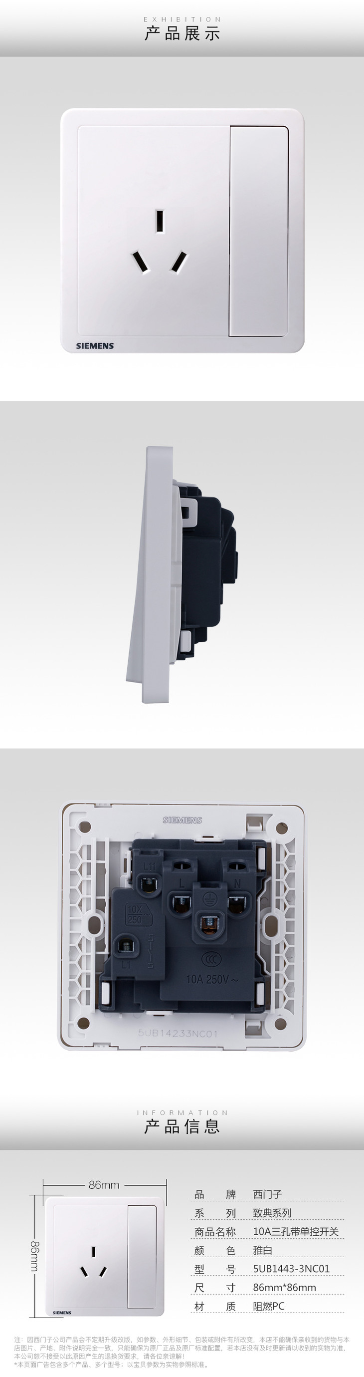 西门子开关插座面板致典雅白10A三孔插座带开关