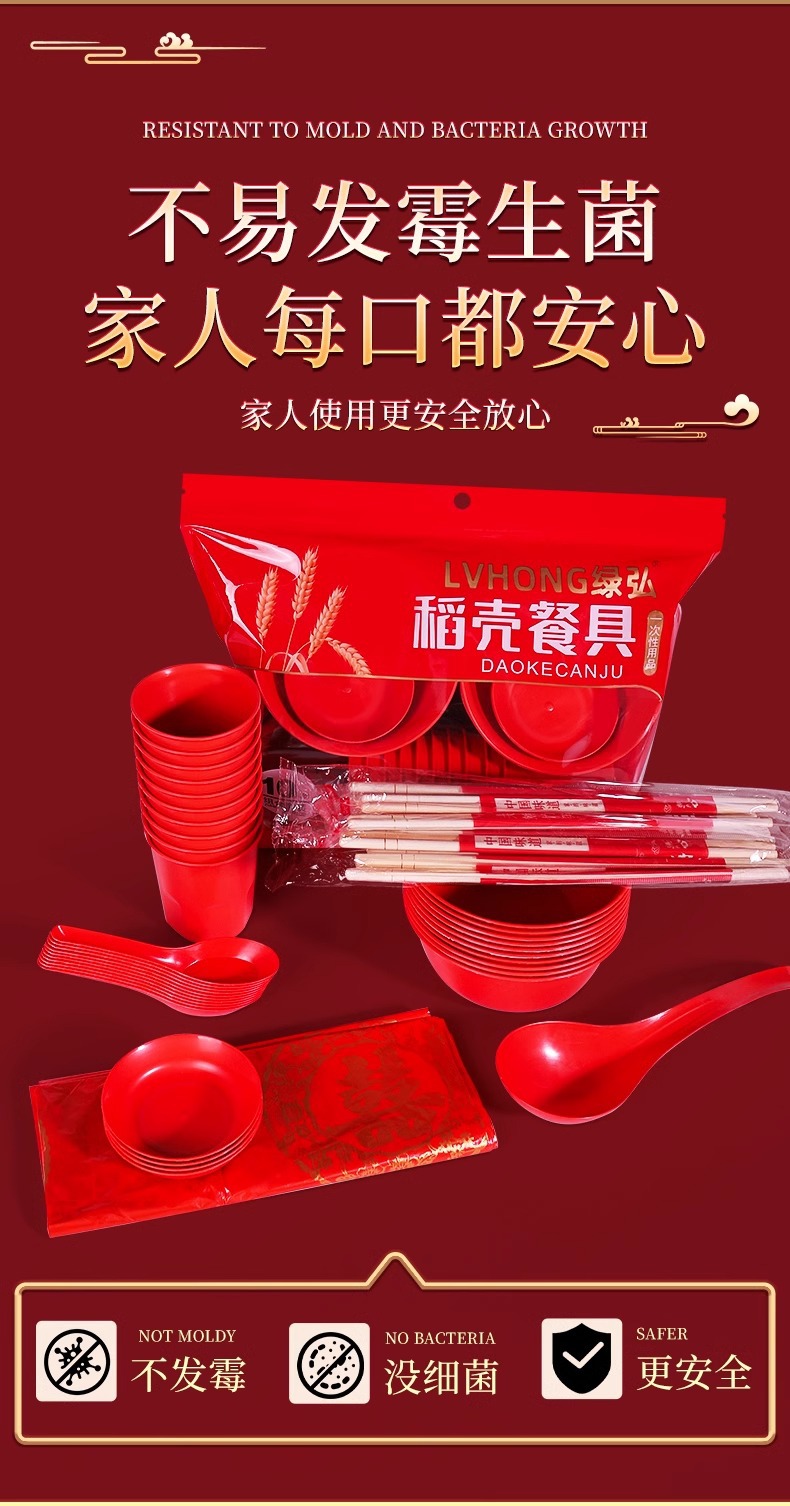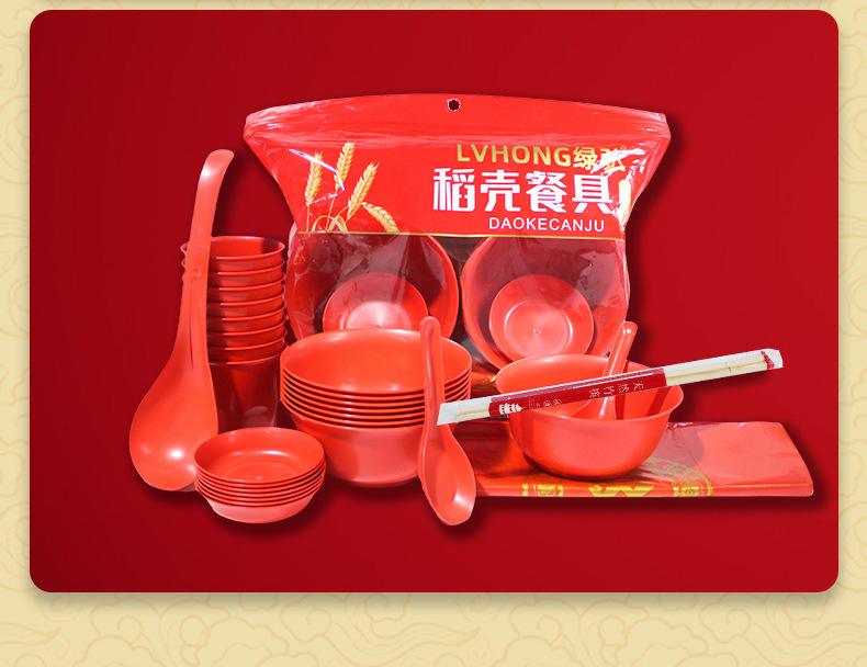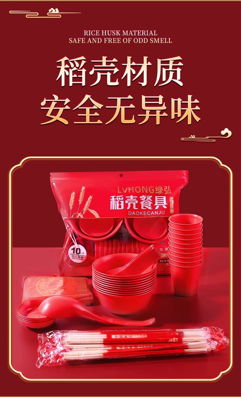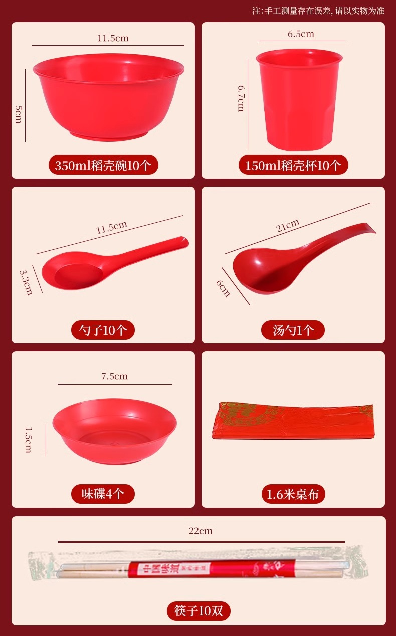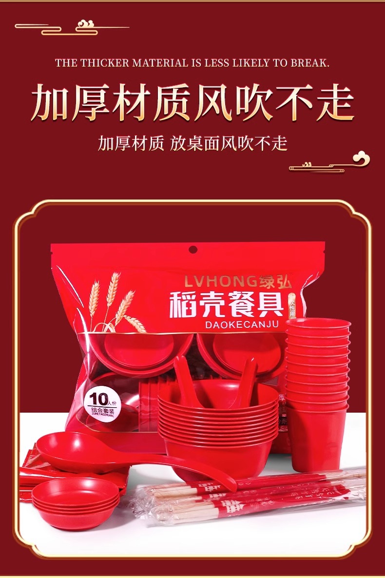 「19.9到手10人份!一次性套装」一次性碗筷杯三件套 组合酒席用红色婚宴新年过年家用套装稻壳餐具10人份餐饮用具