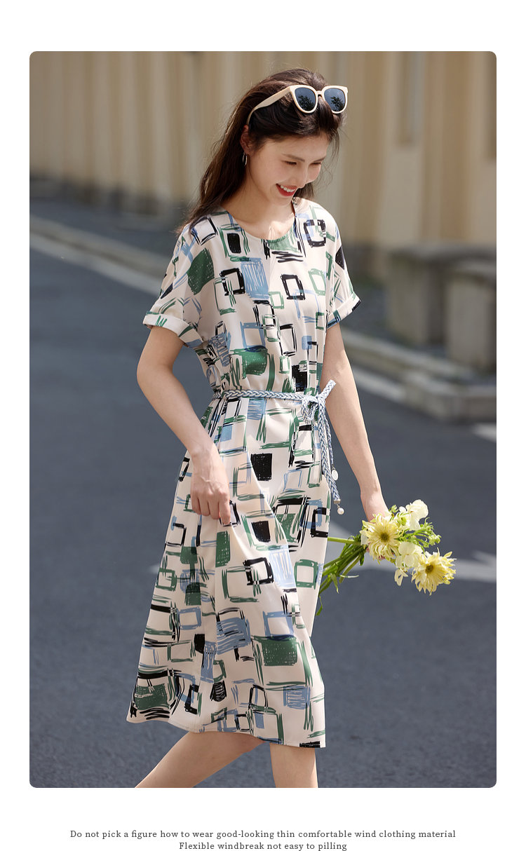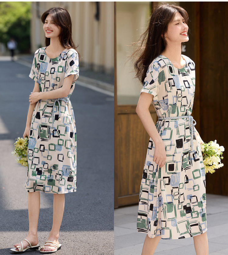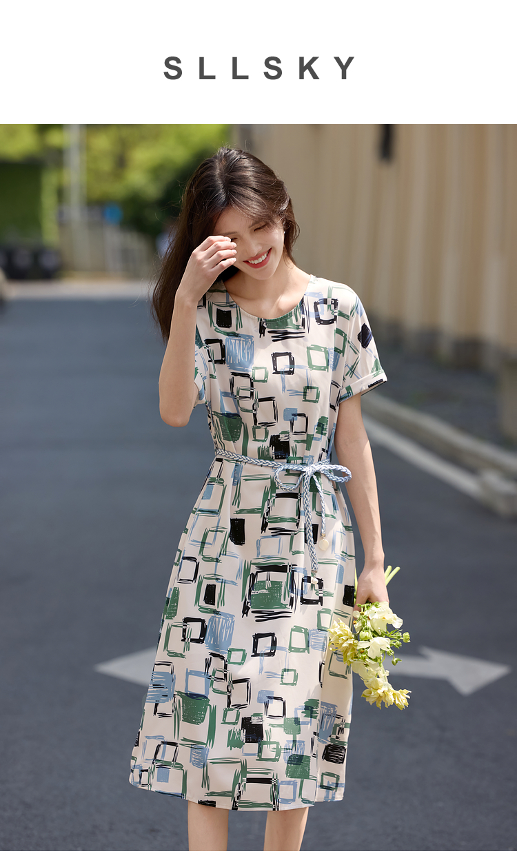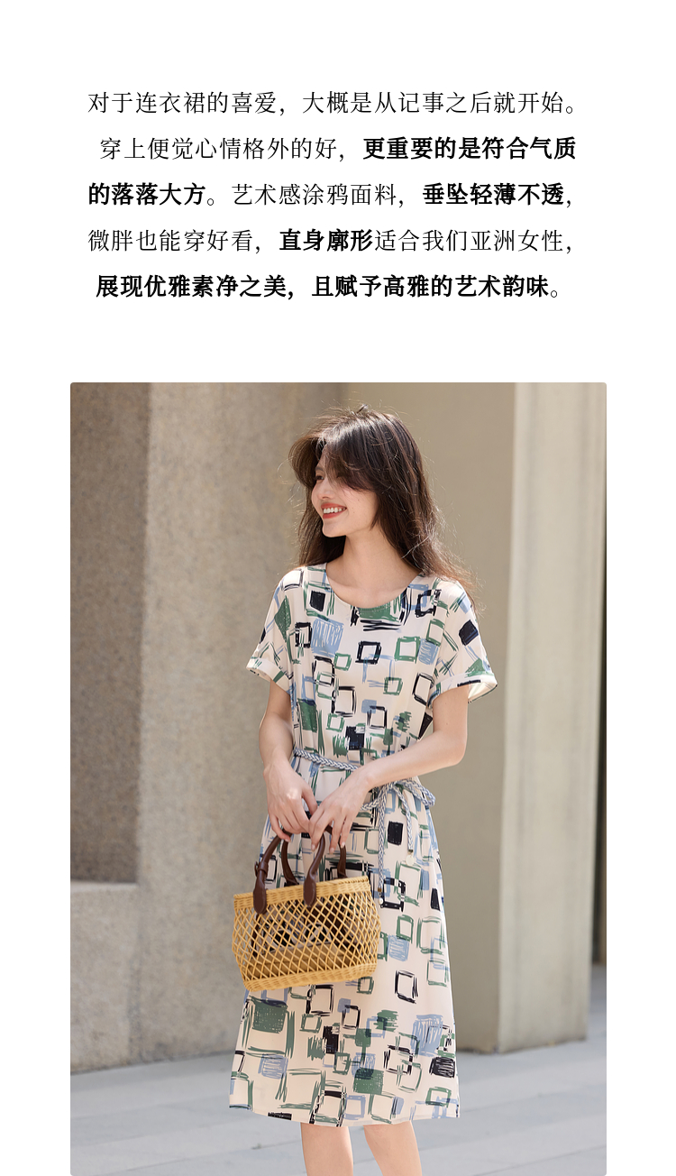 【专属特价】熙世界艺术感涂鸦格子印花连衣裙女夏新款气质度假风系带显瘦裙子
