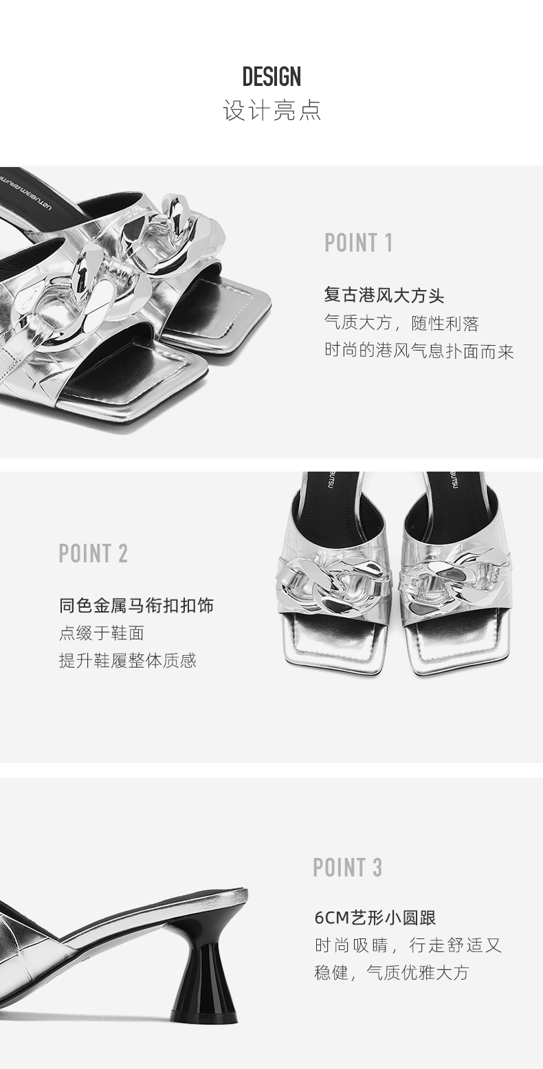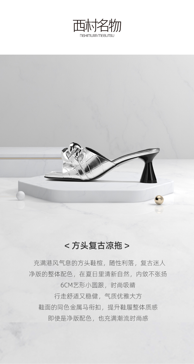 西村名物夏季新款石头纹方头大粗链酒杯跟中跟拖鞋露趾凉拖23771