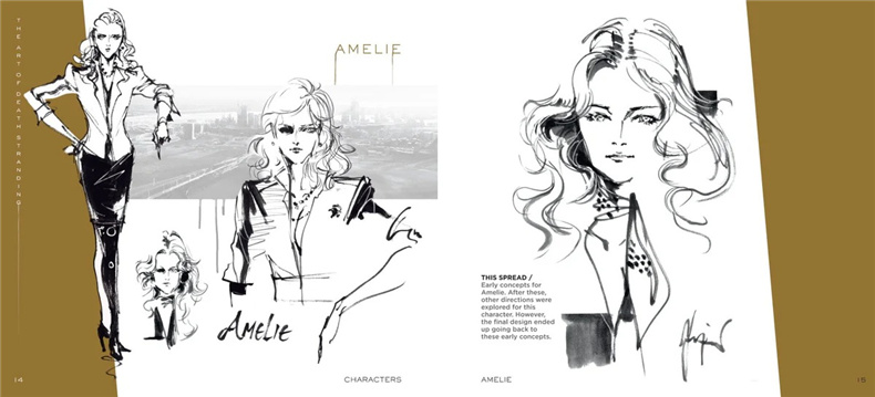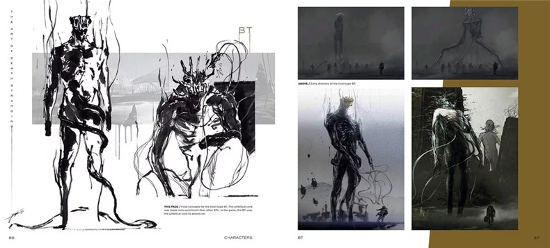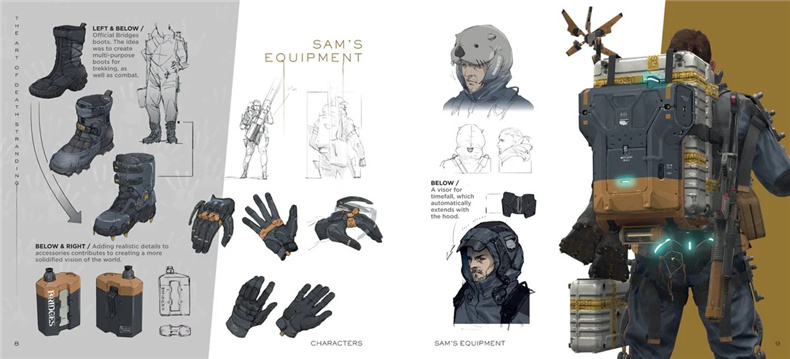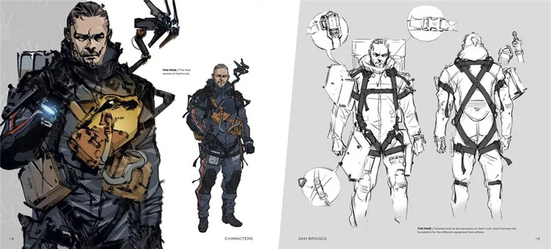 该书分为角色设定与地点设定两大部分,包含山姆·布里吉斯、亚美莉等主要人物设定图,中央结点城、冥滩等场景概念稿,以及末日准备者定居点等未采用场景草图。美术总监新川洋司延续《潜龙谍影》系列视觉风格,通过线条勾勒兼具未来感与实用性的设计,展示搁浅体(BT)从抽象到具象的迭代过程。书中收录早期概念图与设定对比、开发笔记及未实装载具设计。