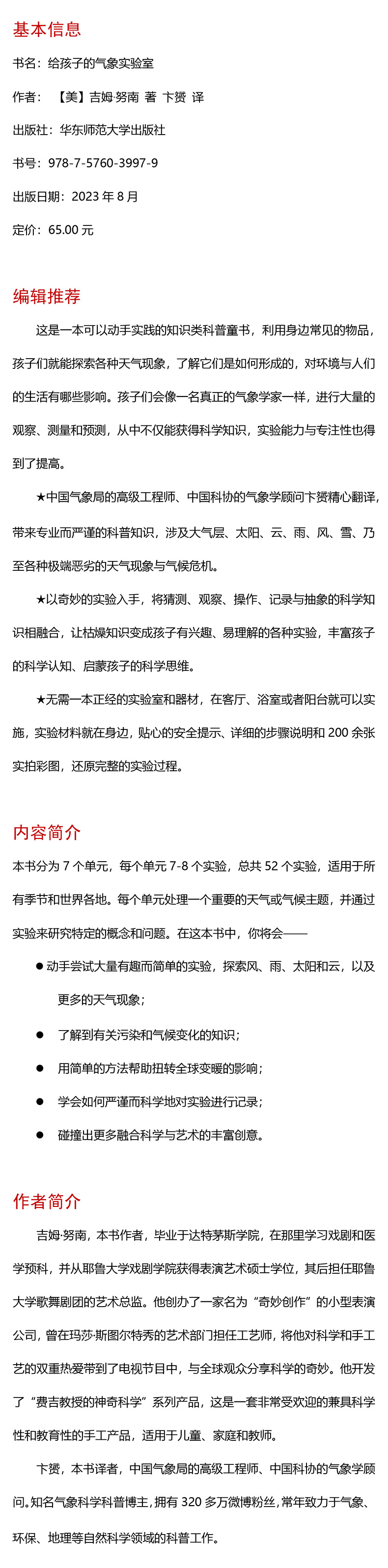 这是一本可以动手实践的知识类科普童书,利用身边常见的物品,孩子们就能探索各种天气现象,了解它们是如何形成的,对环境与人们的生活有哪些影响。孩子们会像一名真正的气象学家一样,进行大量的观察、测量和预测,从中不仅能获得科学知识,实验能力与专注性也得到了提高。★中国气象局的高级工程师、中国科协的气象学顾问卞赟精心翻译,带来专业而严谨的科普知识,涉及大气层、太阳、云、雨、风、雪、乃至各种特别恶劣的天气现象与气候危机。★以奇妙的实验入手,将猜测、观察、操作、记录与抽象的科学知识相融合,让枯燥知识变成孩子有兴趣、易理解的各种实验,丰富孩子的科学认知、启蒙孩子的科学思维。★无需一本正经的实验室和器材,在客厅、浴室或者阳台就可以实施,实验材料就在身边,贴心的安全提示、详细的步骤说明和200余张实拍彩图,还原完整的实验过程。
