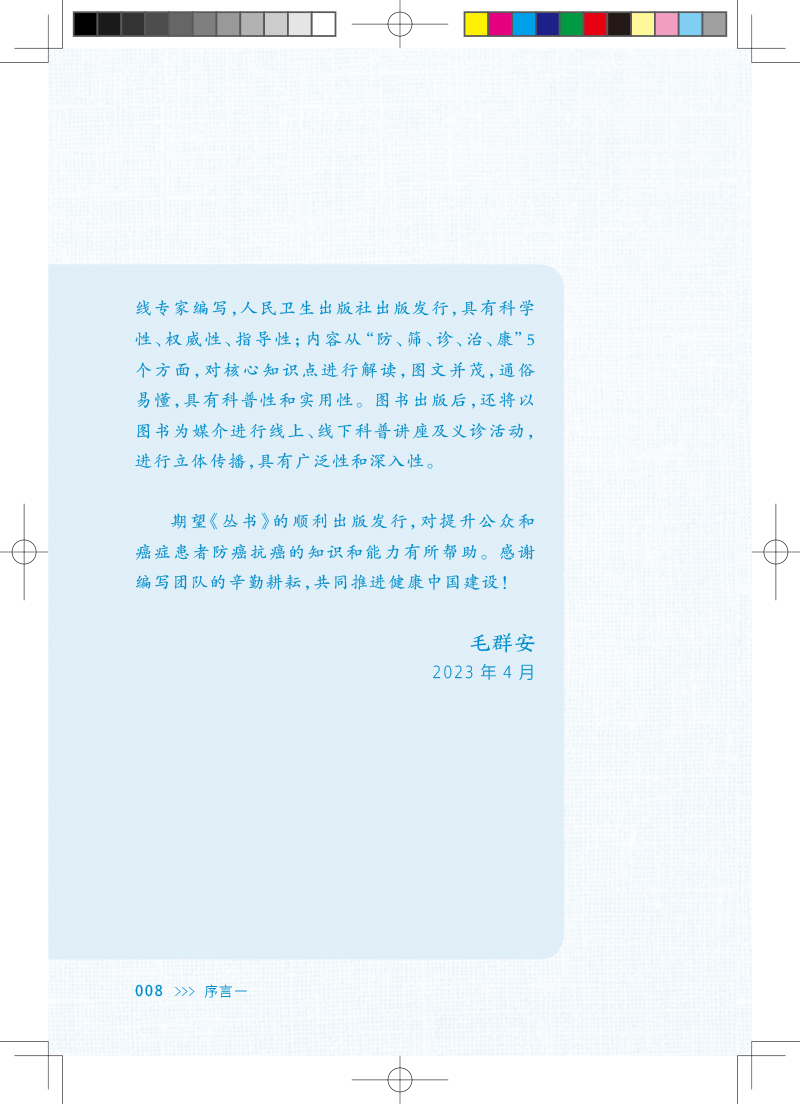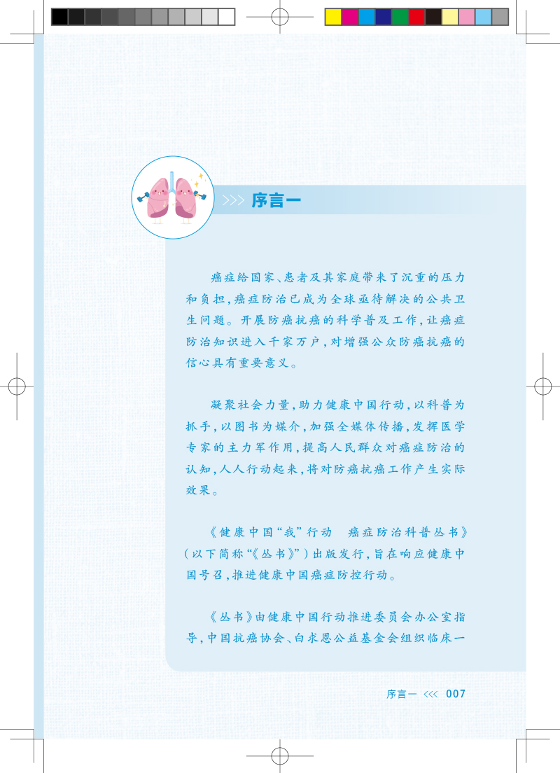 "本套丛书的编写风格统一,主要参照中国抗癌协会发布的《中国肿瘤防止核心科普知识(2021)》为模板进行编写,根据各个癌症的自身特点编写符合各分册的核心知识点,让读者在短时间内掌握最准确的观点,编写思路清晰、明了。