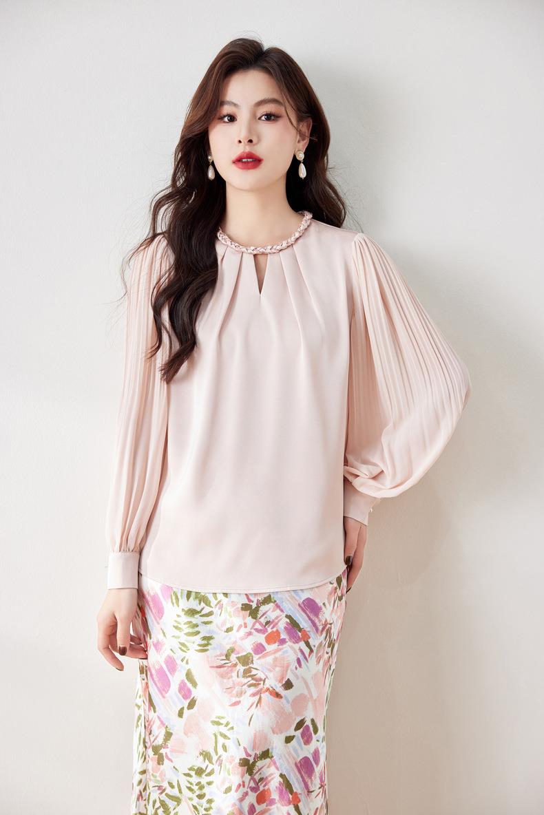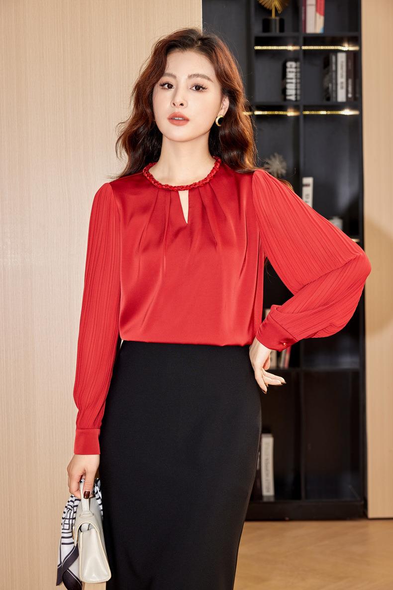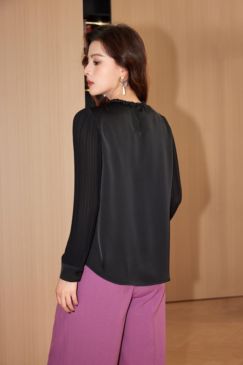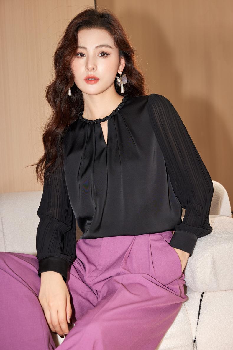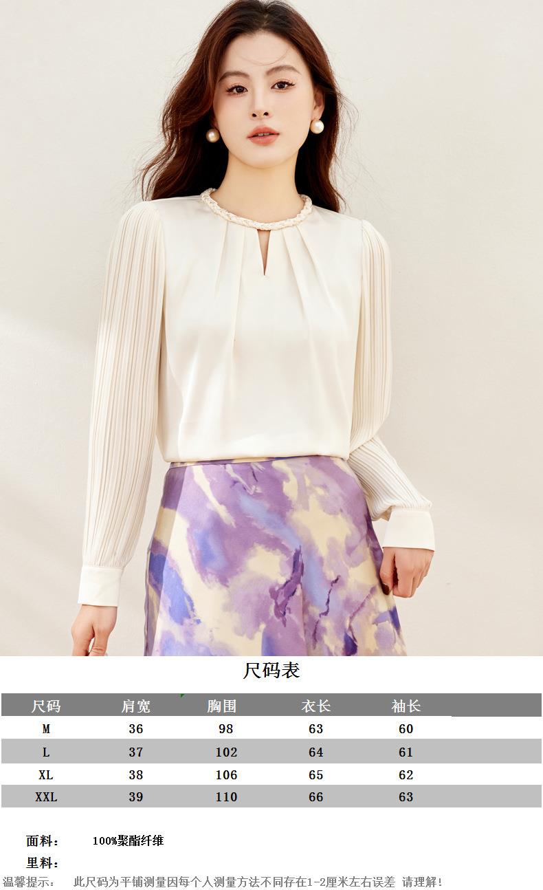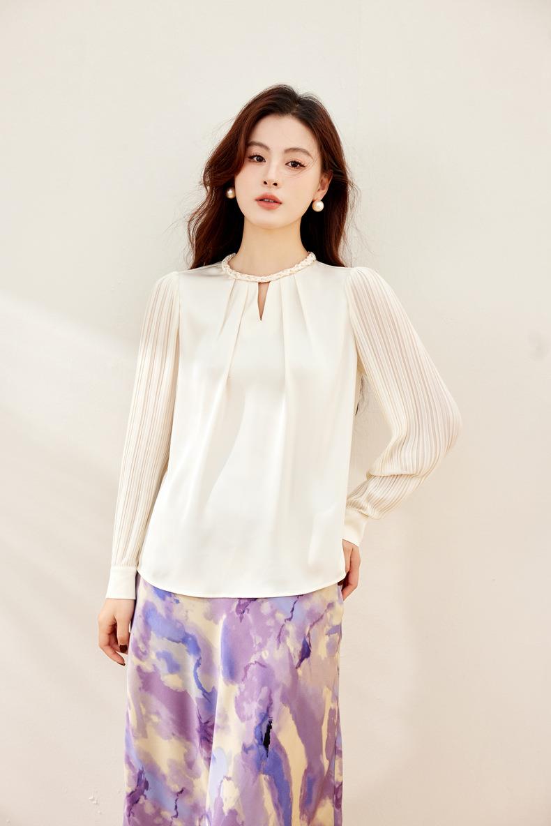 醋酸缎面雪纺衫女上衣2024春装新款小衫压皱长袖女衬衣8882