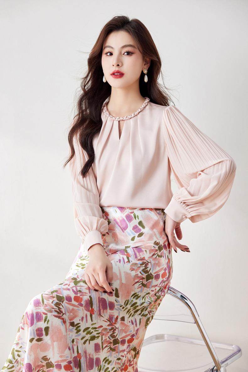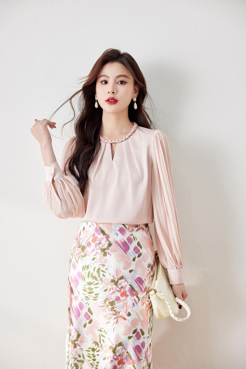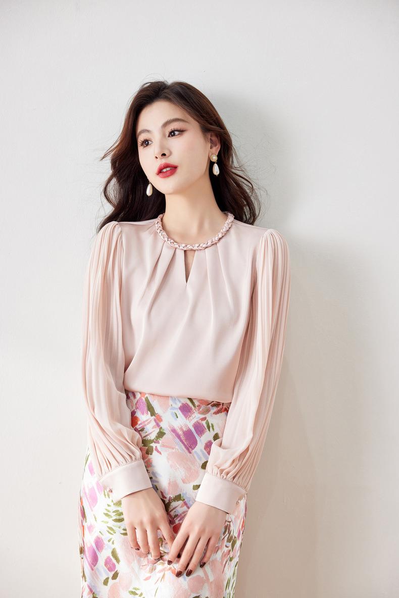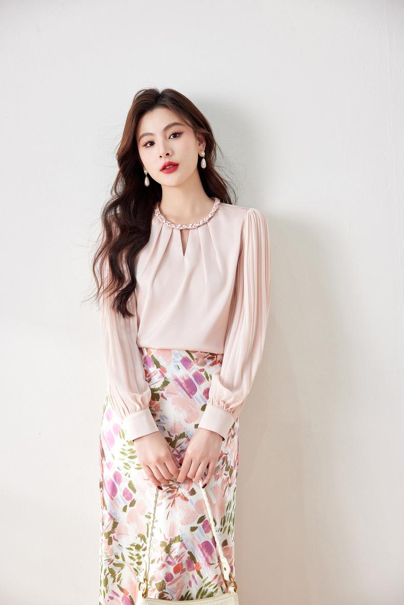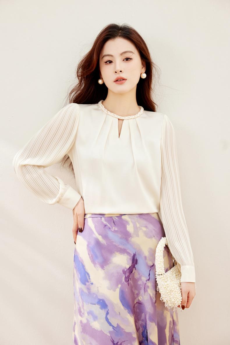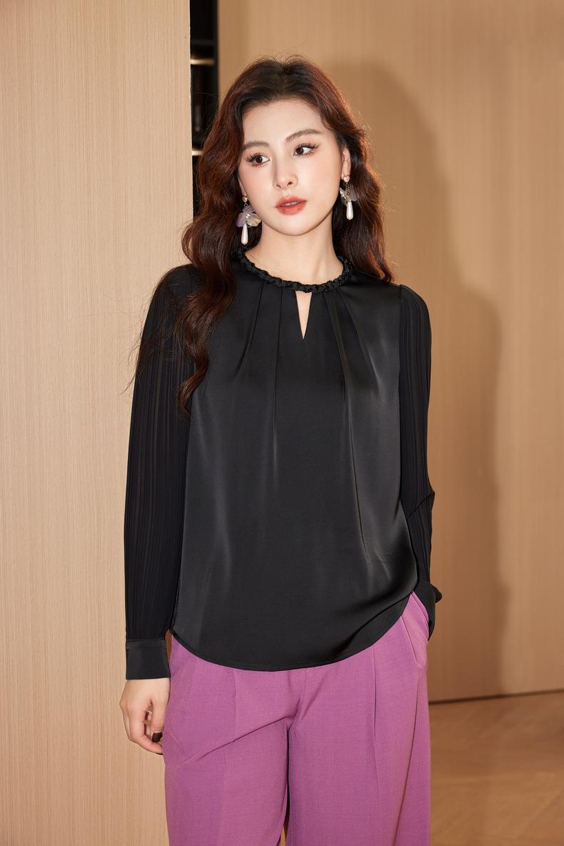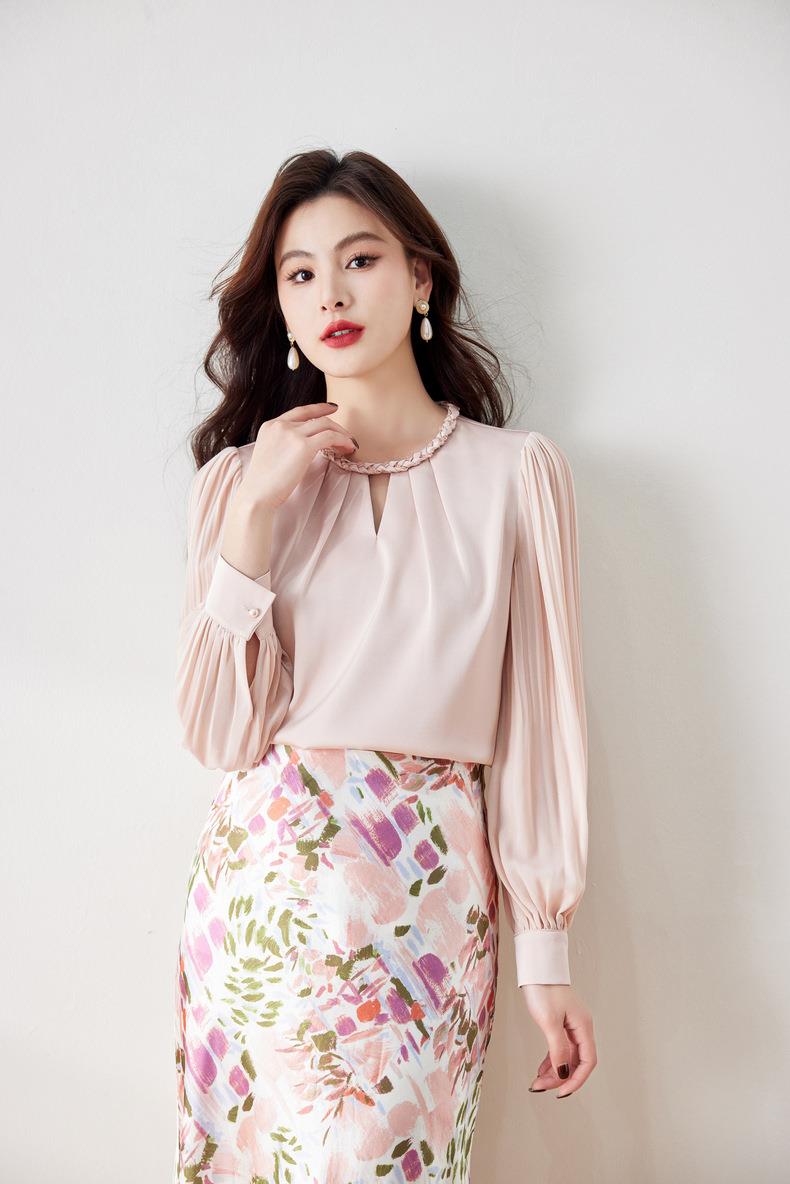 醋酸缎面雪纺衫女上衣2024春装新款小衫压皱长袖女衬衣8882
