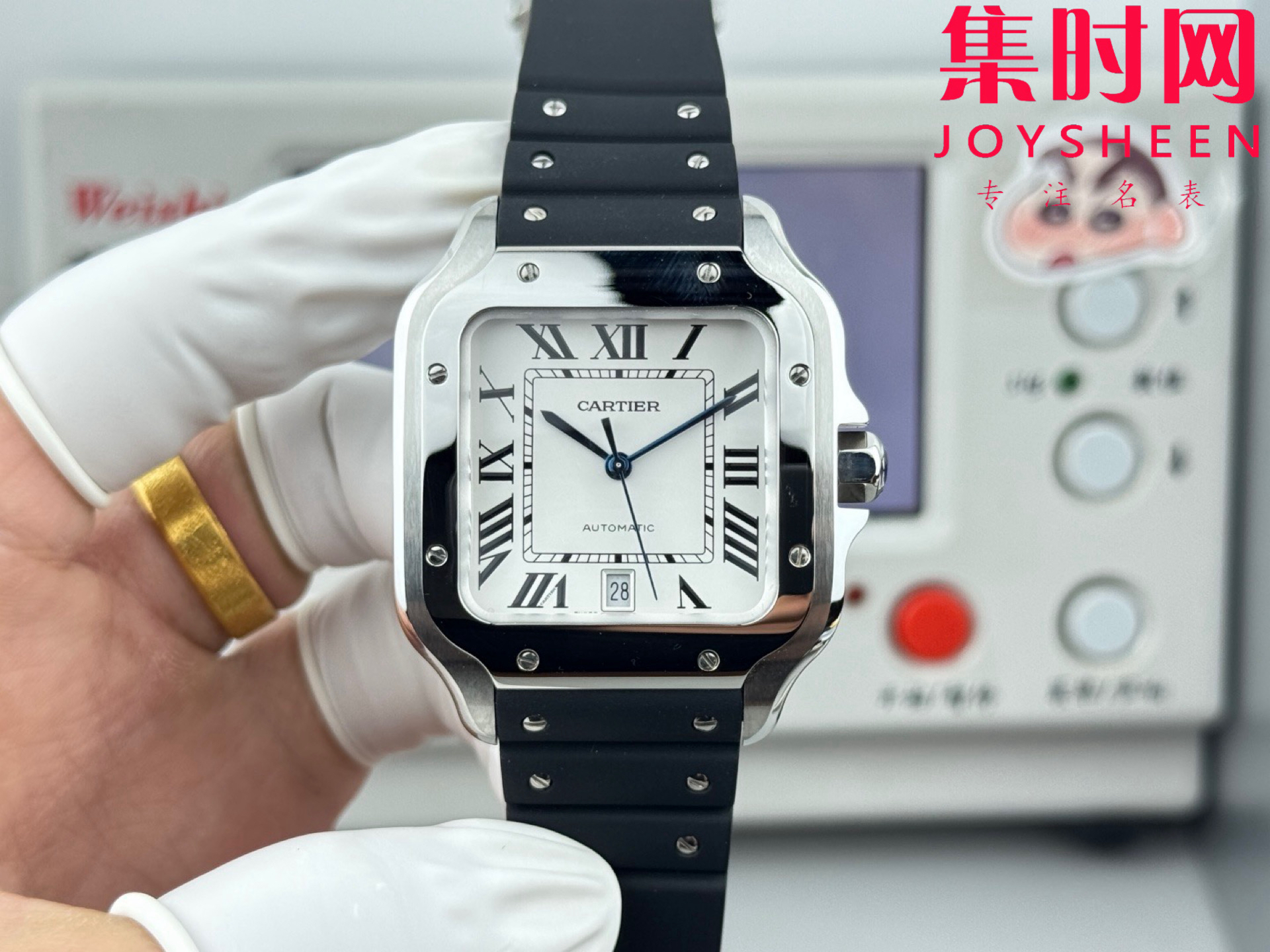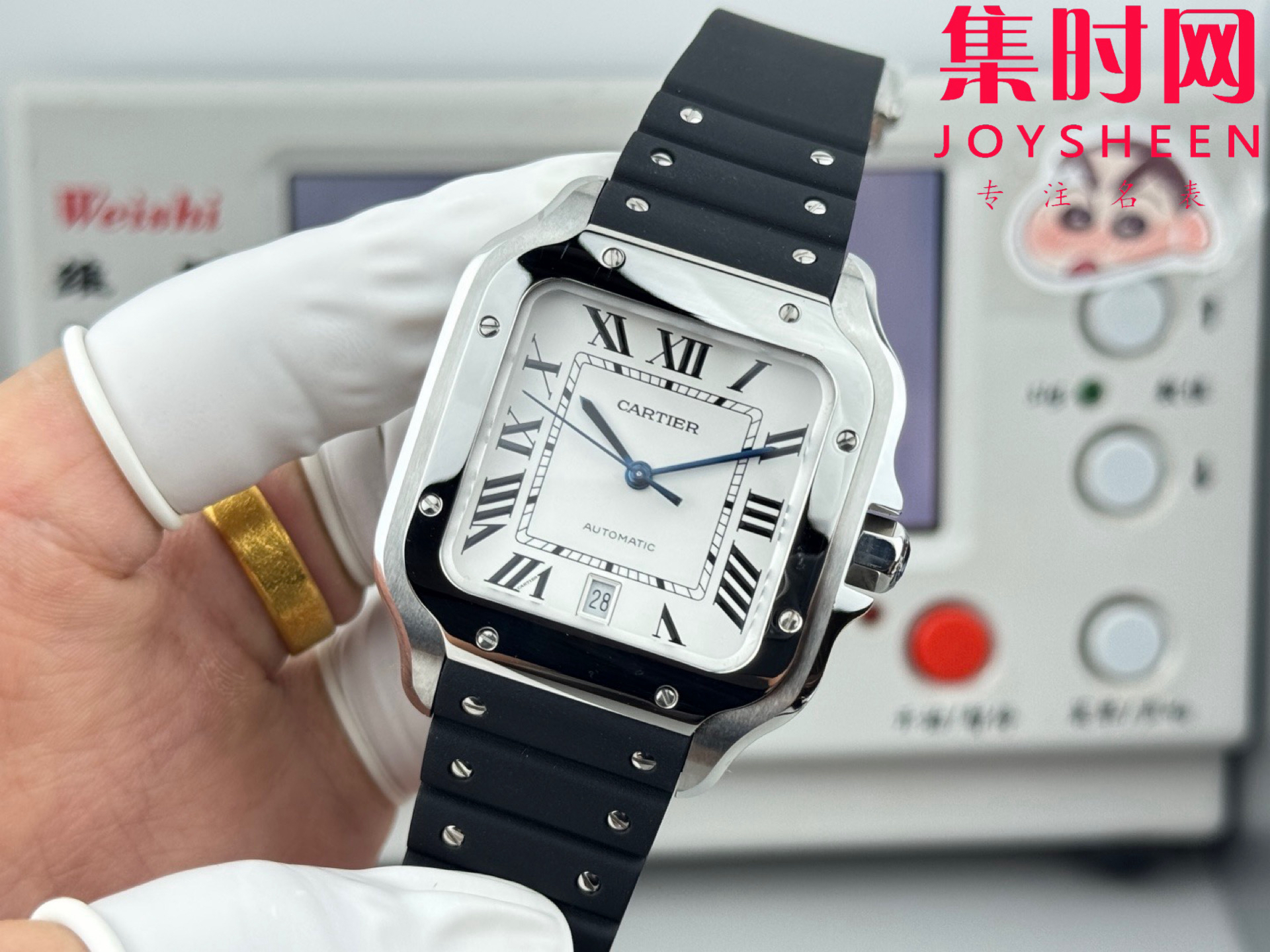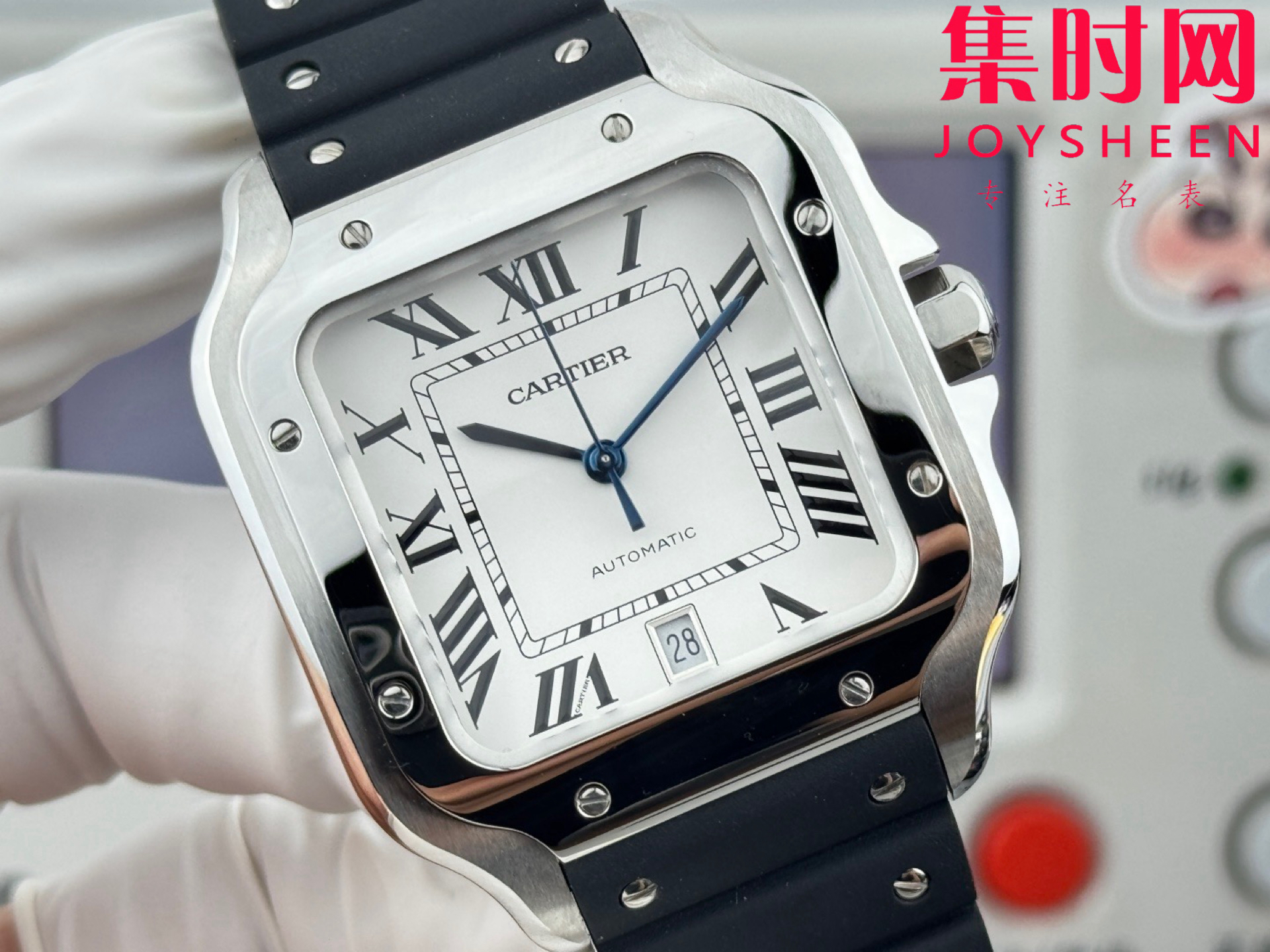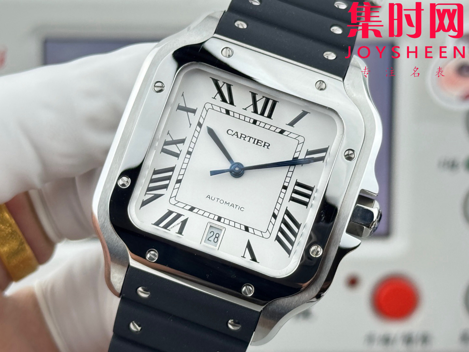 GF卡地亚山度士系列 山度士大号 雪山白面 方形男士腕表 绝对是绕不开的经典 表径39.8mm,舒适感很不错。从细节上看,表冠镶有蓝色合成多切面尖晶石,增添了许多精致感。6点钟还设置了日期显示窗口。采用进口9015改Cal.1847 MC自动上链机械机芯,在稳定性和日常佩戴的可靠性上没有问题。防水达到100米。总的来说,这款山度士更适合那些既看重品牌调性,又希望腕表能兼顾实用性的用户。