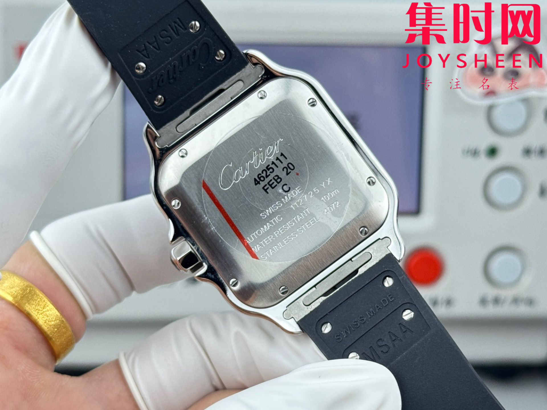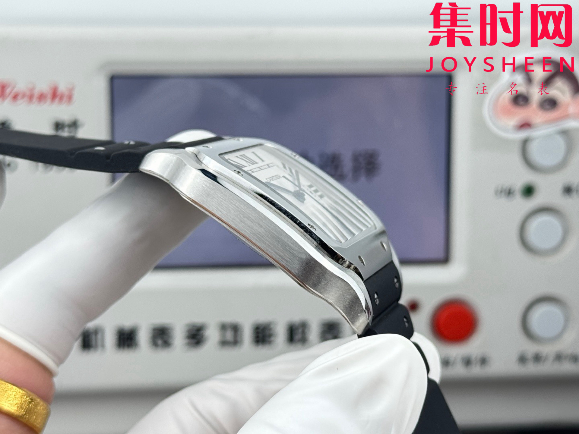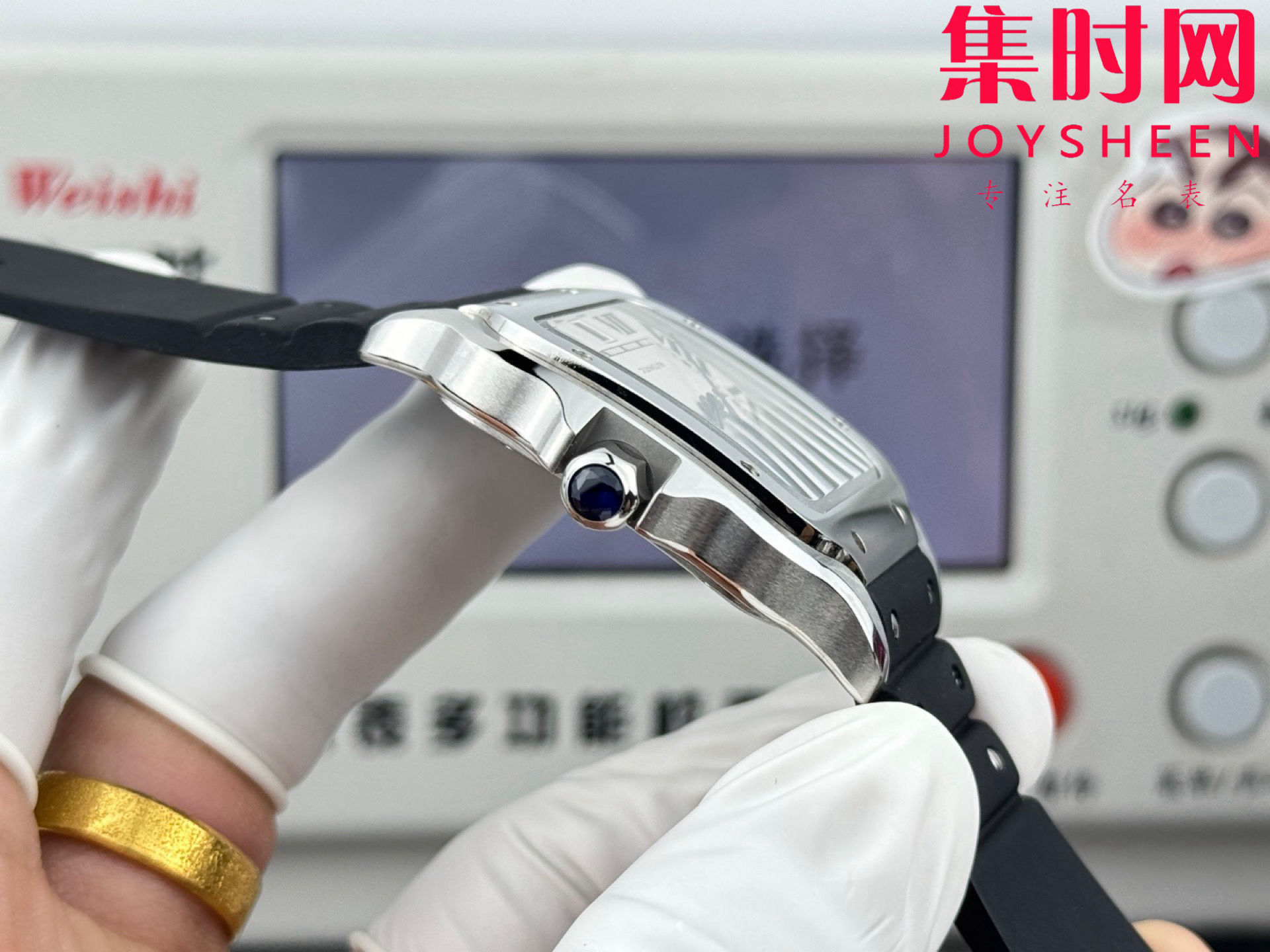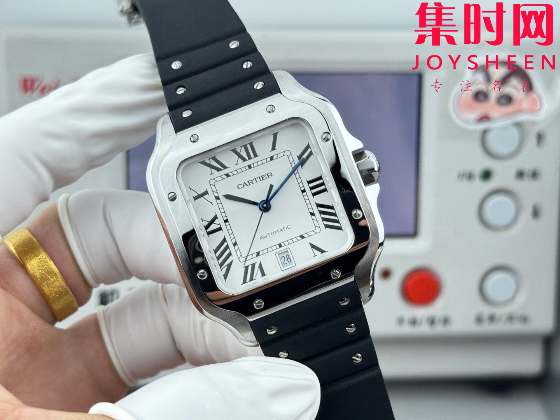GF卡地亚山度士系列 山度士大号 雪山白面 方形男士腕表 绝对是绕不开的经典 表径39.8mm,舒适感很不错。从细节上看,表冠镶有蓝色合成多切面尖晶石,增添了许多精致感。6点钟还设置了日期显示窗口。采用进口9015改Cal.1847 MC自动上链机械机芯,在稳定性和日常佩戴的可靠性上没有问题。防水达到100米。总的来说,这款山度士更适合那些既看重品牌调性,又希望腕表能兼顾实用性的用户。