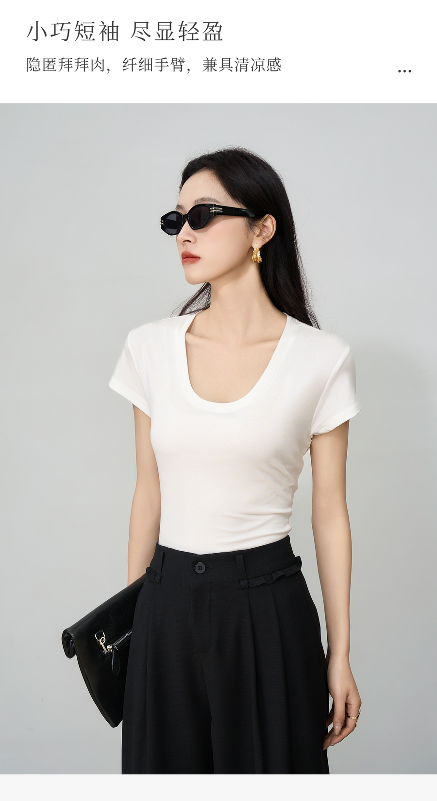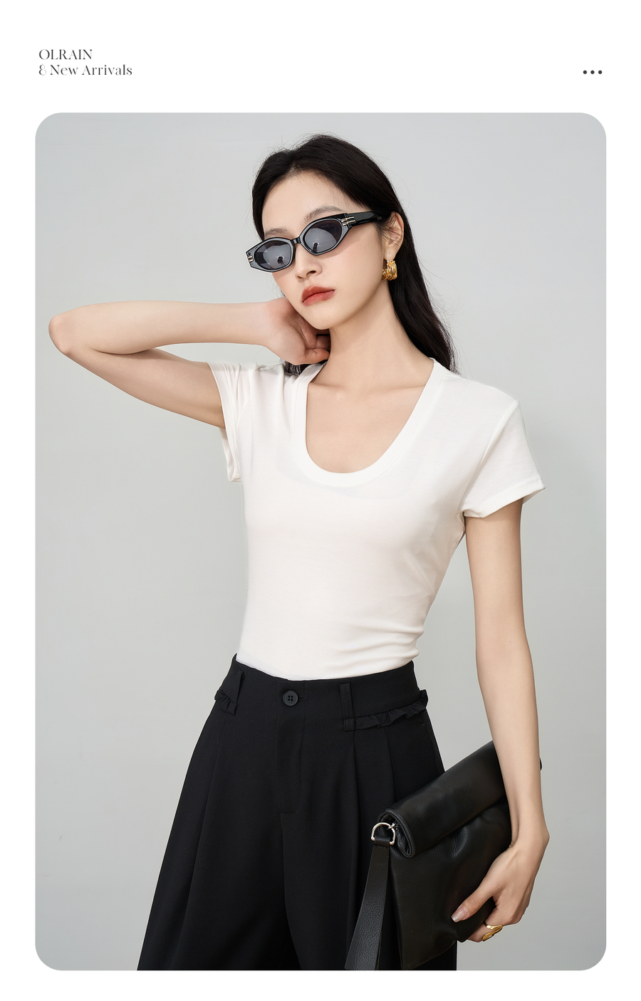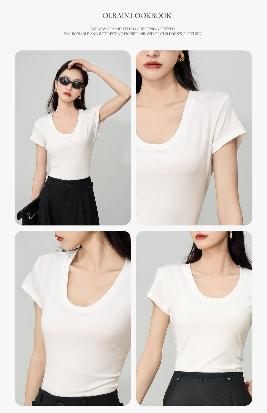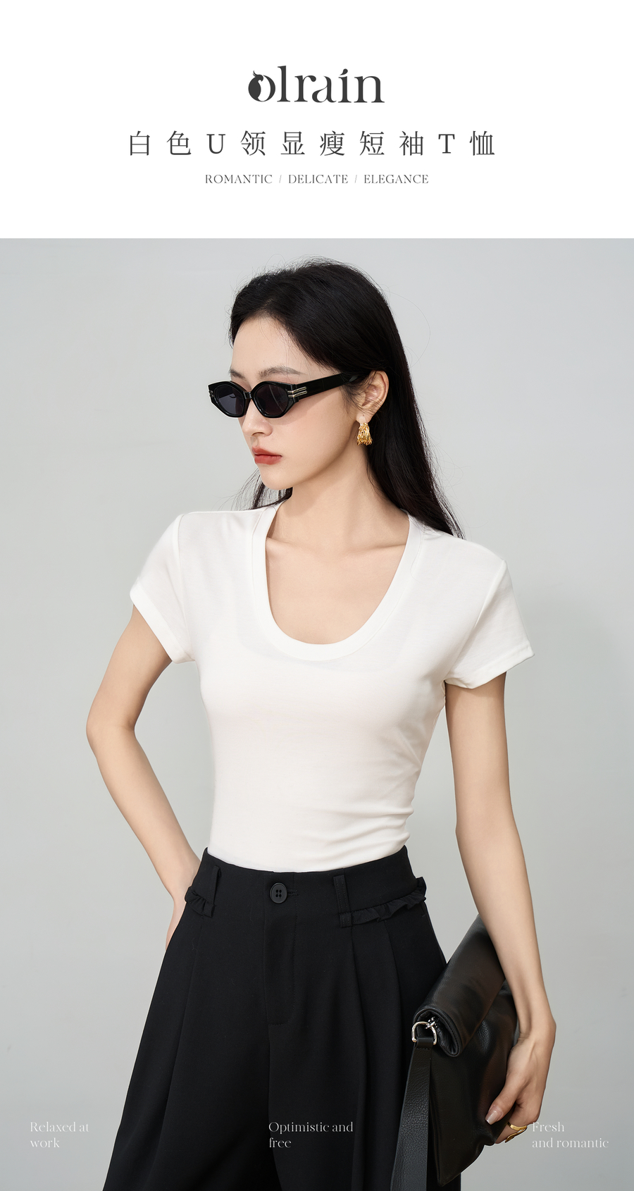 OLrain欧芮儿白色U领正肩百搭显瘦短袖T恤夏季2025新款小个子上衣