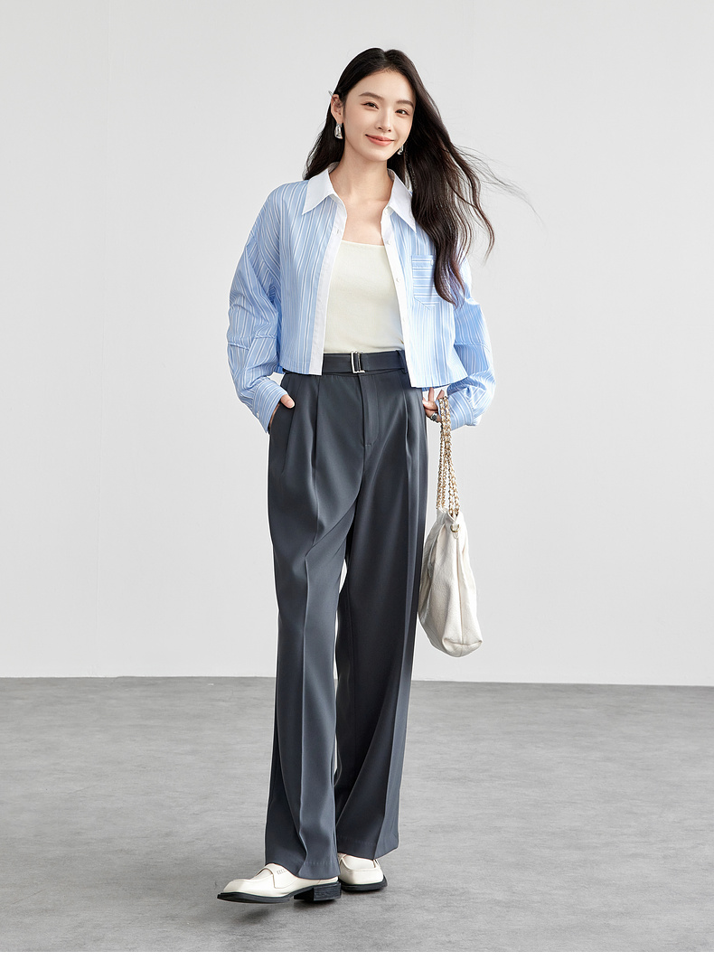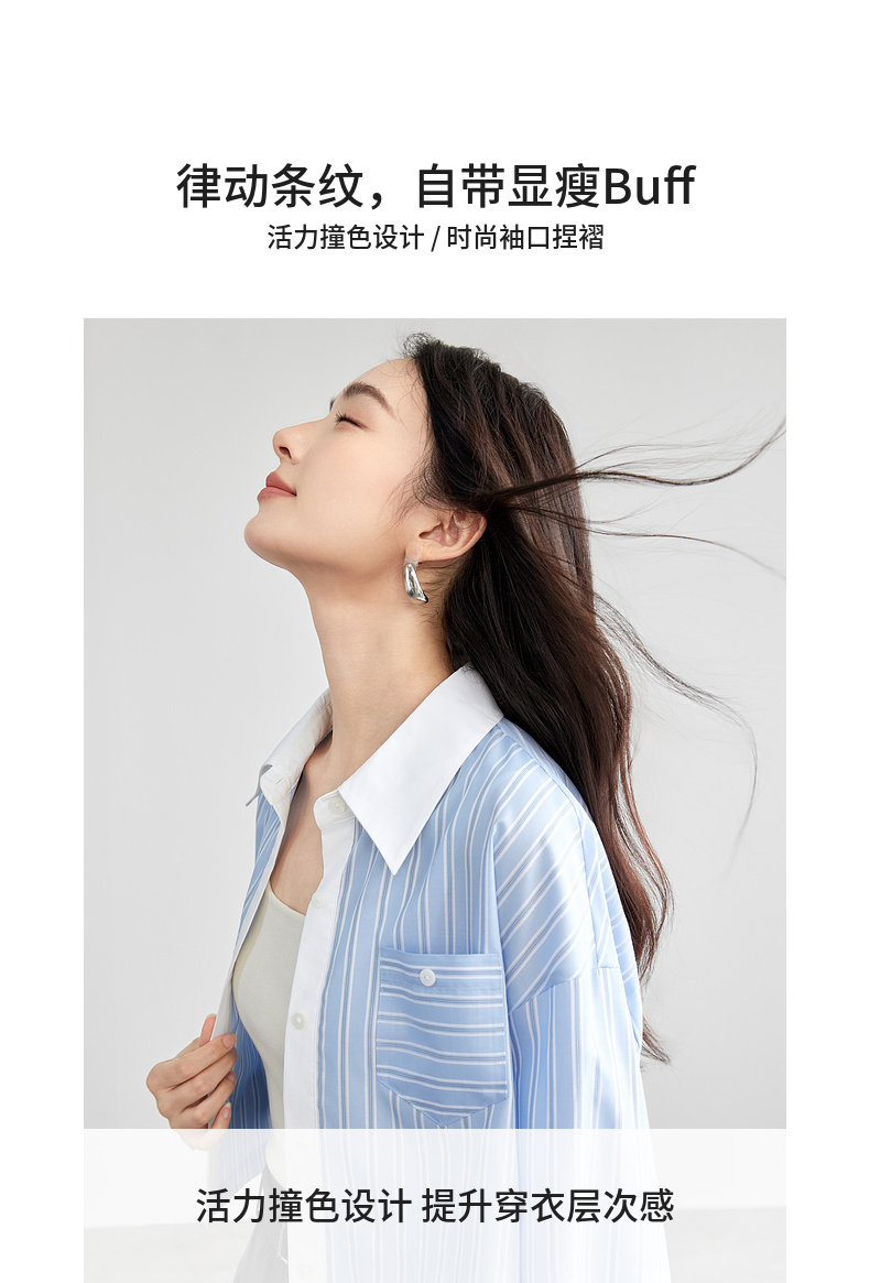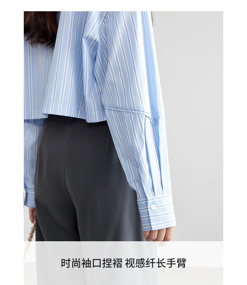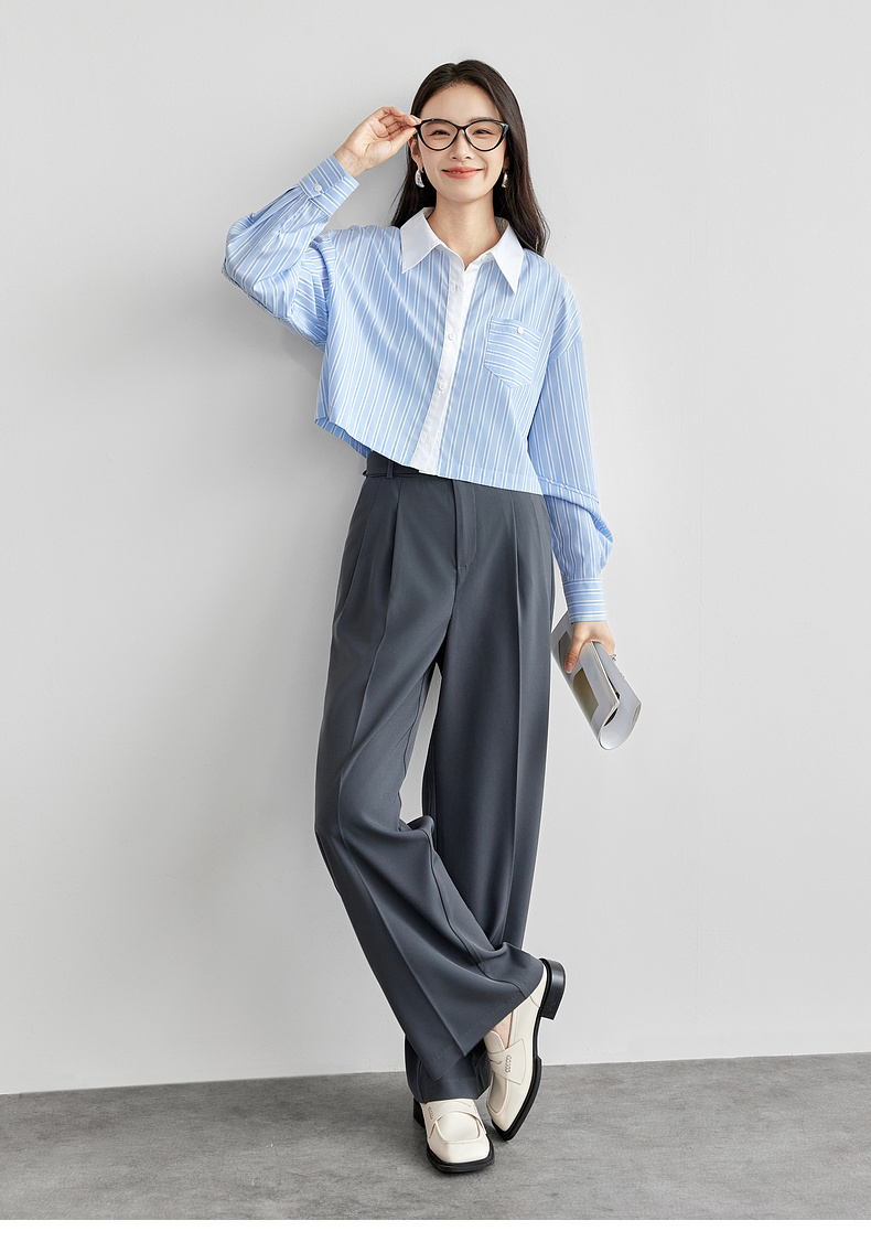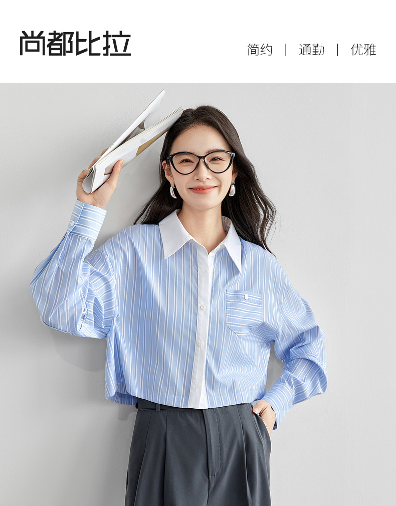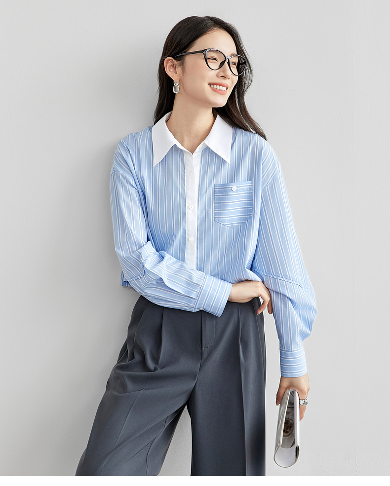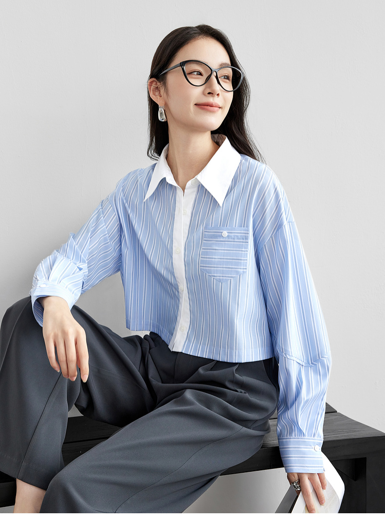 【内购】时尚通勤撞色翻领单排扣捏褶袖子单一口袋短款落肩衬衫-58084