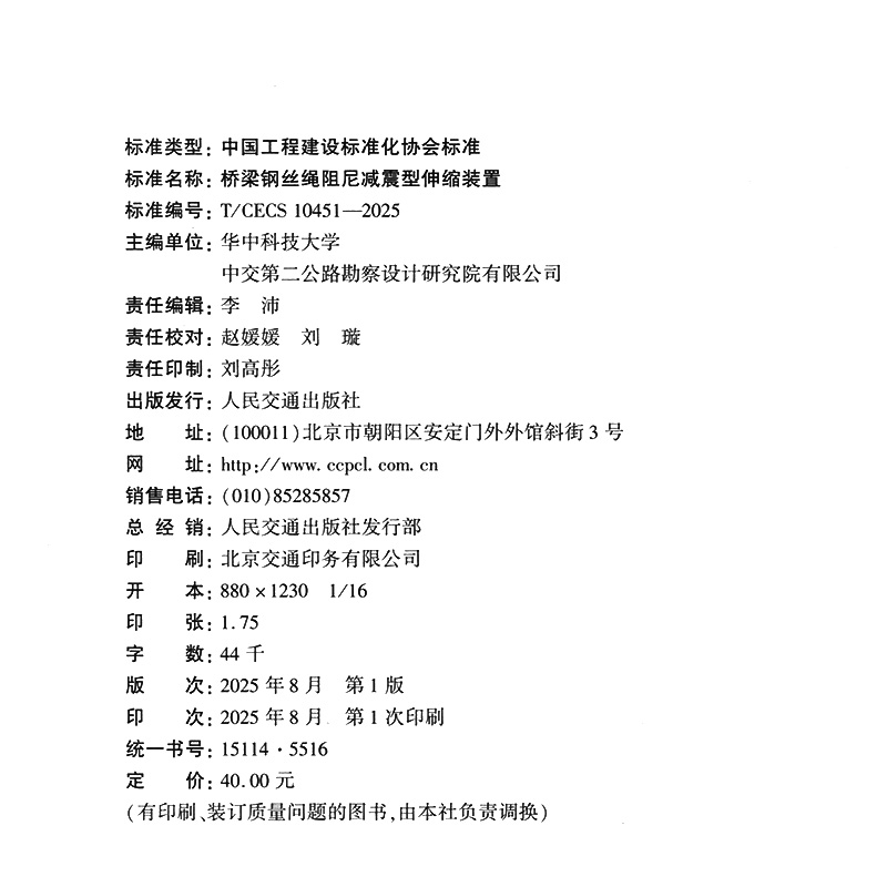 书名:桥梁钢丝绳阻尼减震型伸缩装置(T/CECS 10451—2025)