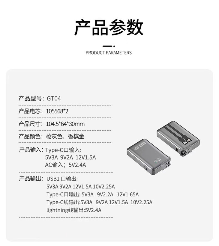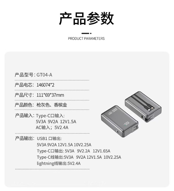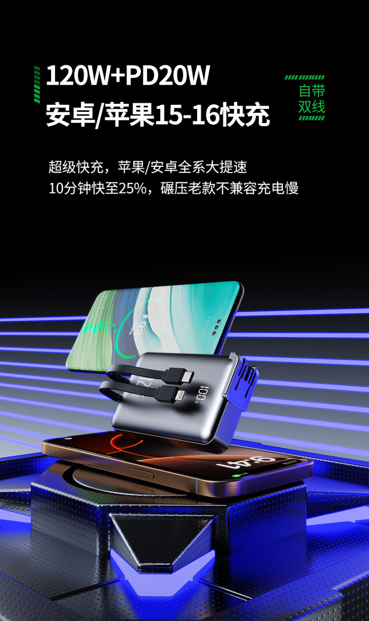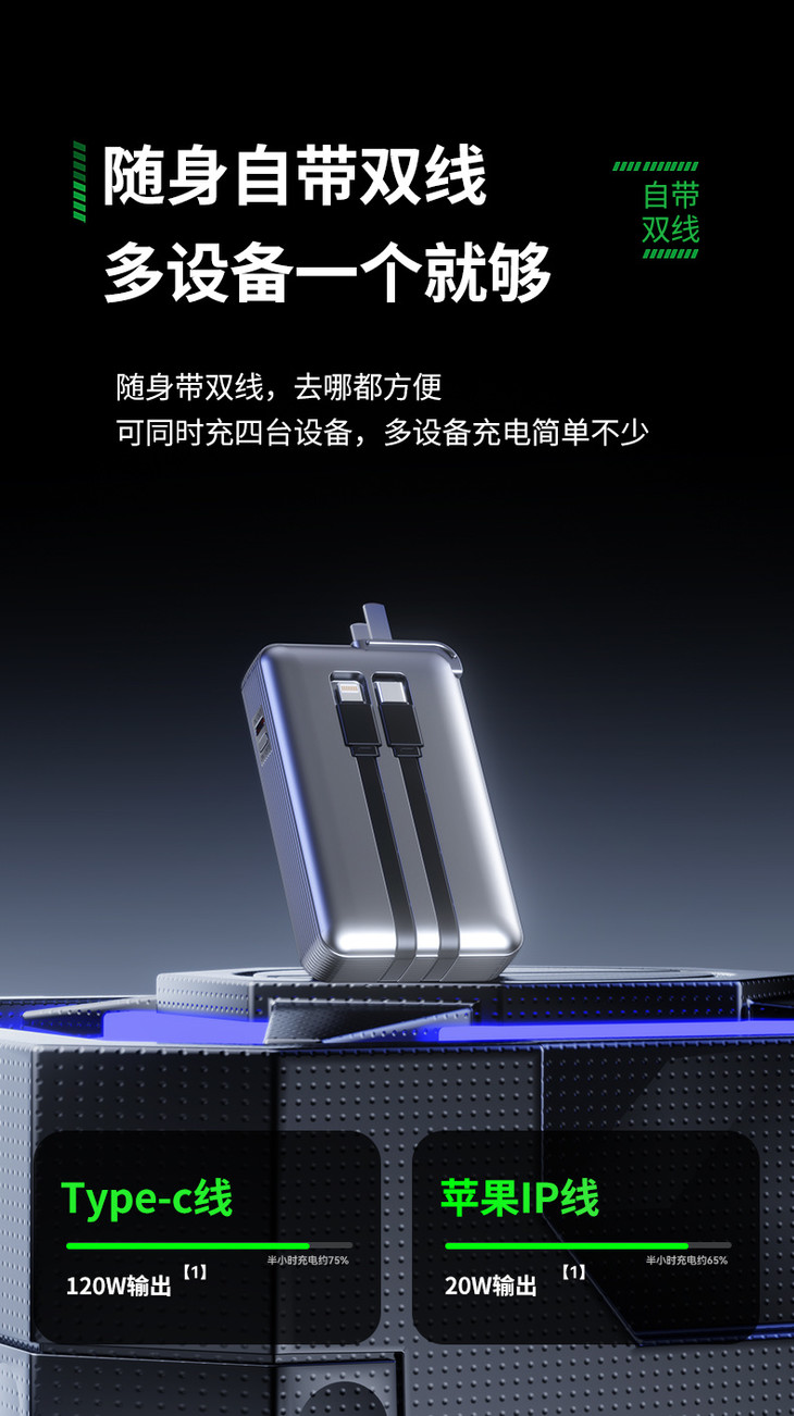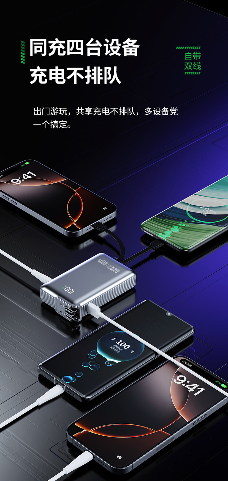 ✅全球首家研发安全固态电芯,不爆炸不起火,安全有保障 ✅自带快充双线:C线+L线,支持120W/PD20W双向快充,苹果安卓都可用 ✅自带双线+USB-A接口+TYPE-C接口,共四口输出,支持多设备同时充电 ✅自带充电插头:AC折叠插头,可直接上插座给充电宝自身充电,手机连上自带线就是一组充电器 ✅精确电量数显屏幕,拒绝电量焦虑,剩余电量一目了然 ✅符合国内/国际航空运输标准,3C认证,上飞机、坐高铁都OK