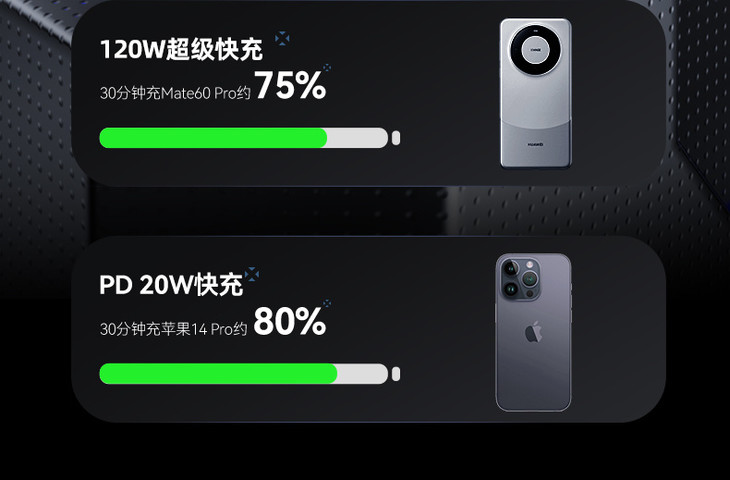 🔻华为120w快充、苹果20w快充 比起普通速度提升了一倍多❗ 通常情况下不到一小时手机就充满了 出门旅行的时候太赞了 充一会儿就可以塞回包里