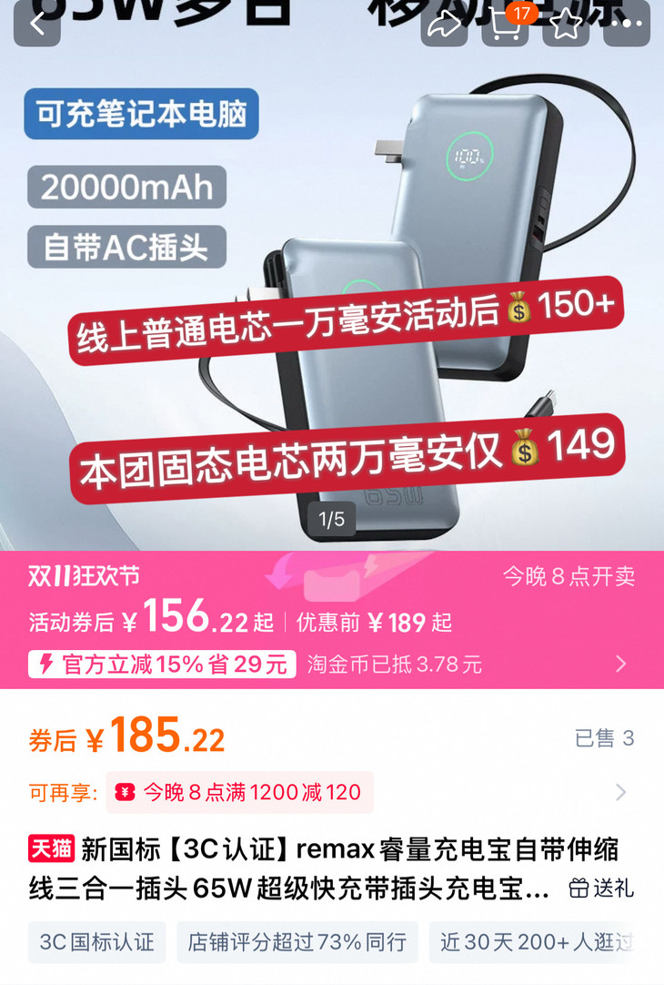 市面上普通电芯的一万毫安充电宝💰150+ 我们这次带来的全球首发固态电芯充电宝 开团10000mAh仅需💰129 20000mAh 💰149 三合一+超大容量+自带双线 容量、速度、安全一次拉满 用完只有一个反应:“不买错过一个亿”