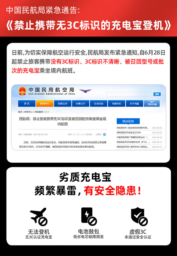 一定要认准有3C标识的移动电源! 自6月28日起禁止旅客携带没有3C标识 3C标识不清晰乘坐境内航班!