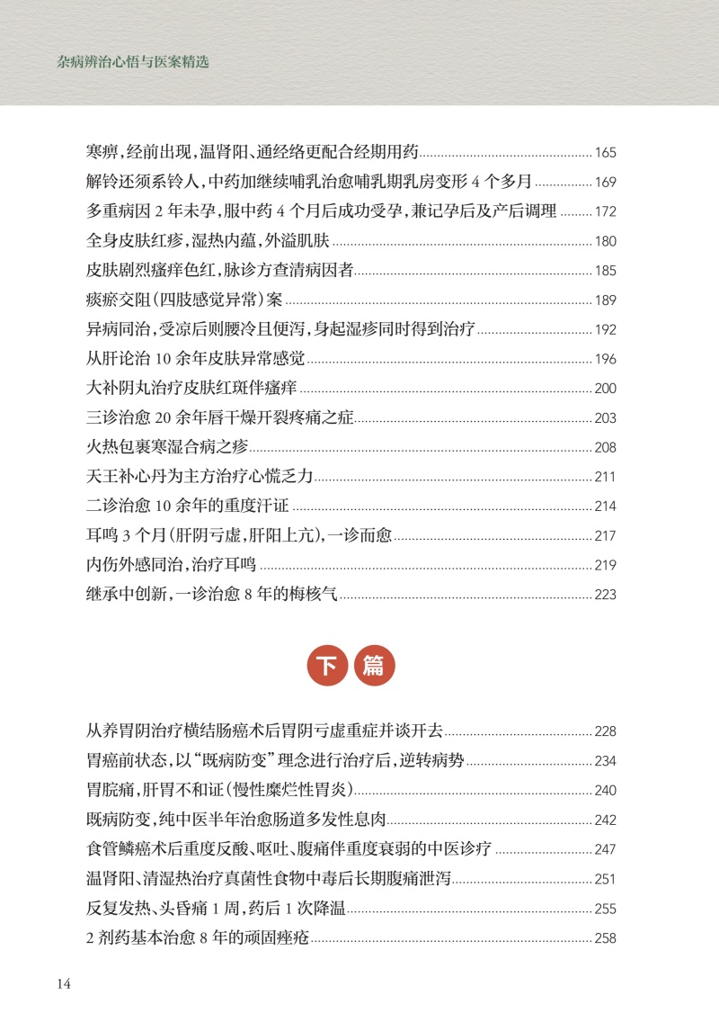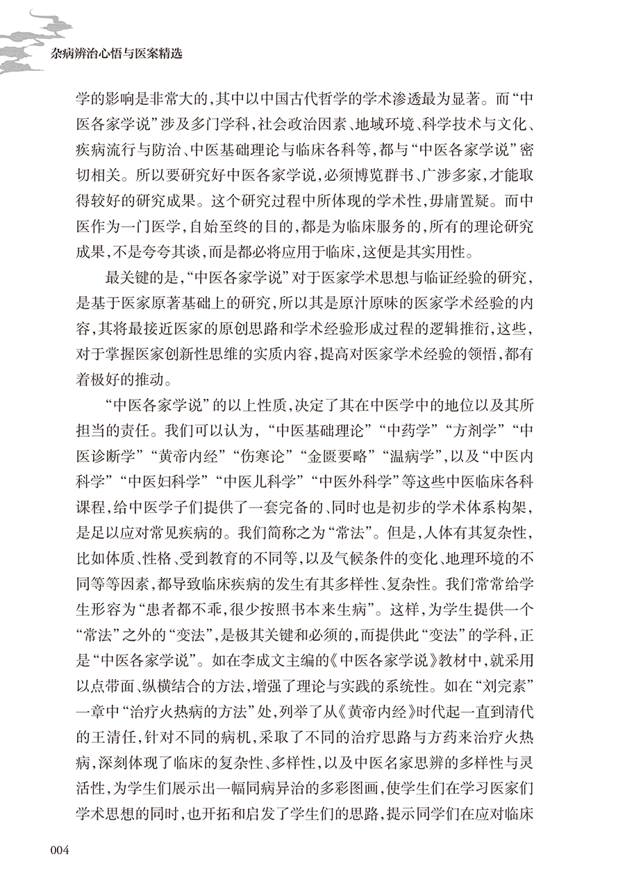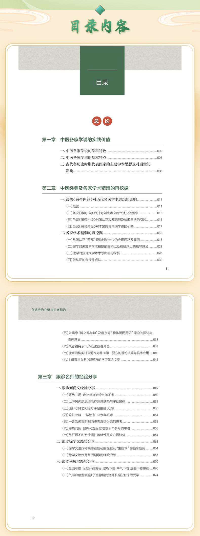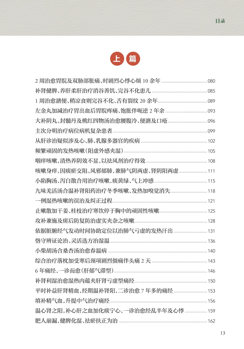 本书主要分总论、上篇、下篇、附篇及杂文五个部分。总论部分阐述了中医各家学说的实践价值、对四大经典以及各家学术精髓的再挖掘、跟诊名师的经验分享。上篇与下篇主要收集整理门诊医案并进行解析,上篇编入的,主要是做相关检查时无明显异常的阳性结果,但经中西医多方治疗无效的病例;下篇编入的,是患者前来时,即是以西医检查发现的病名前来就诊的,或者是西医病名更能体现其特色的,则以西医病名加上治疗特点冠名。杂文部分主要收录平时临证或教学过程中的一些片断或随想。附篇部分收载弟子跟诊时的医案及分析。