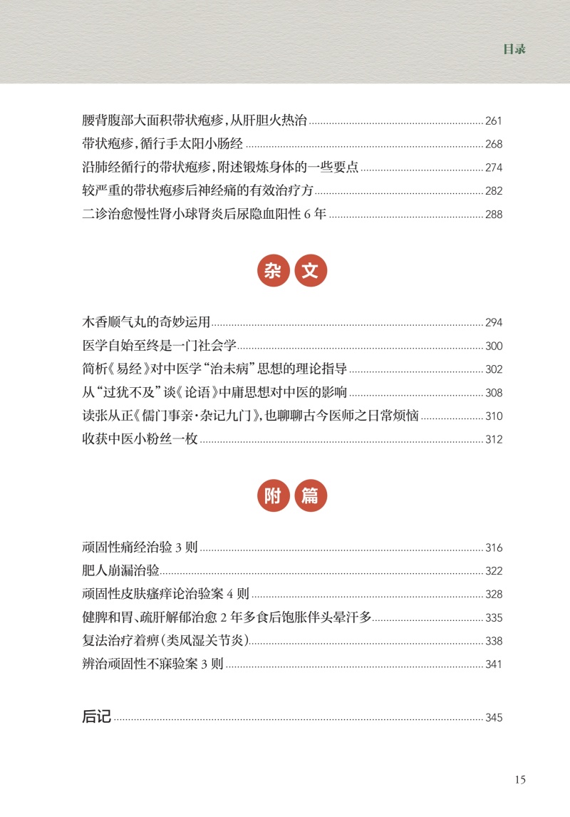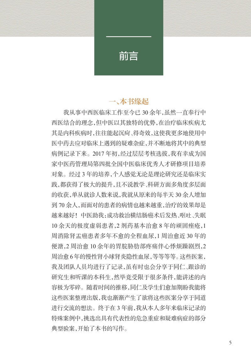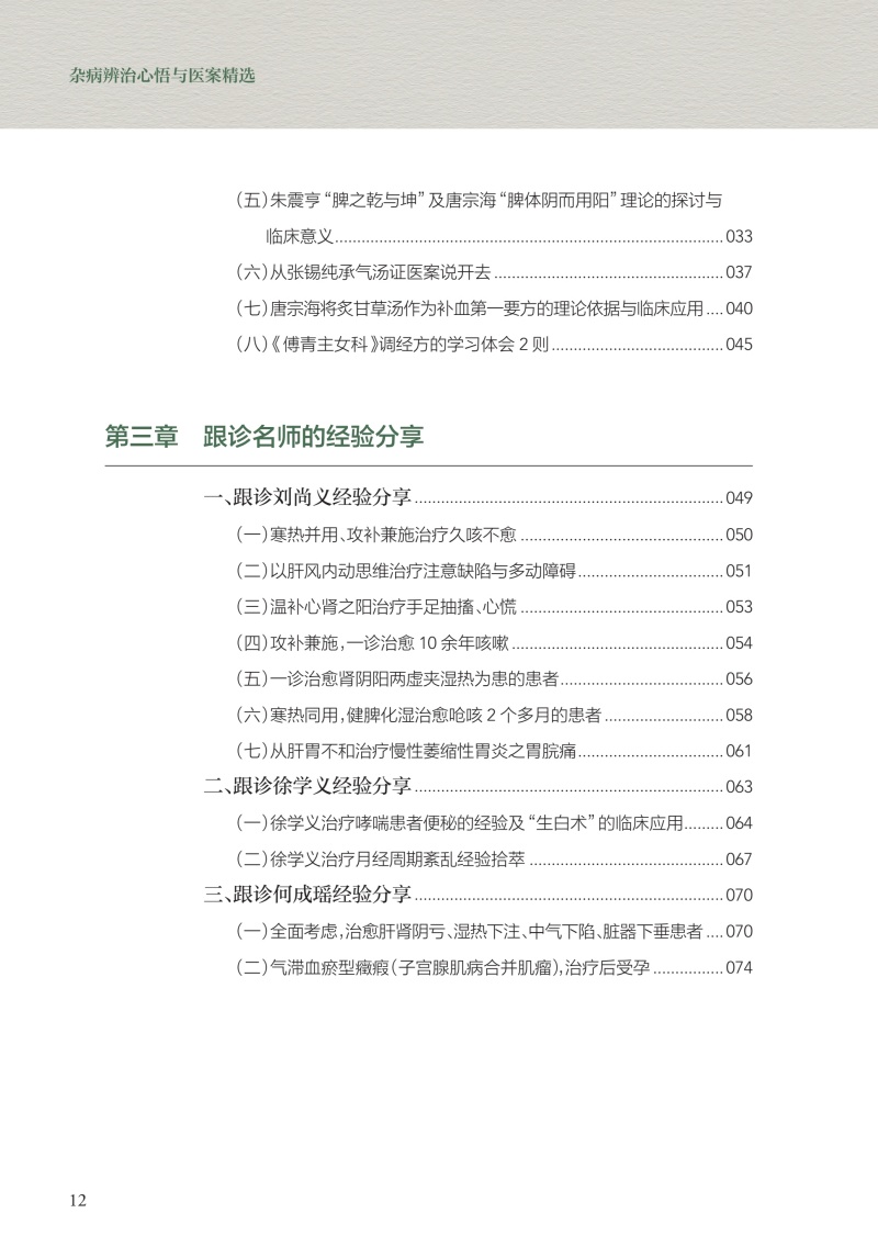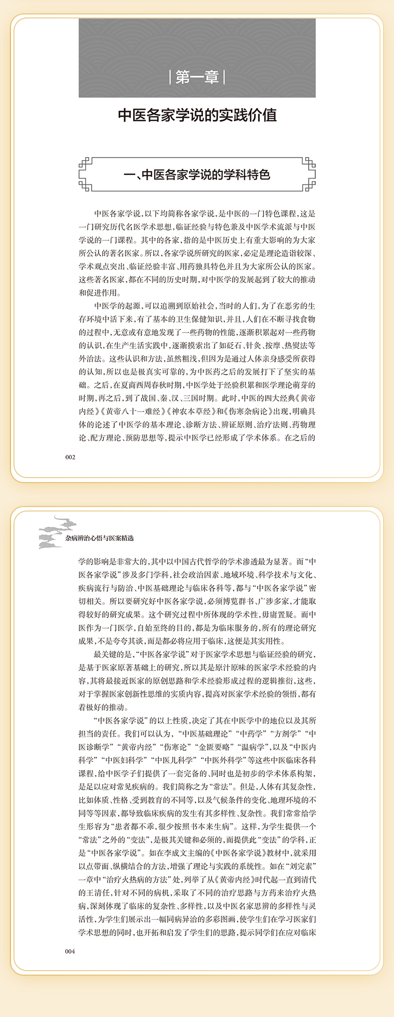 本书主要分总论、上篇、下篇、附篇及杂文五个部分。总论部分阐述了中医各家学说的实践价值、对四大经典以及各家学术精髓的再挖掘、跟诊名师的经验分享。上篇与下篇主要收集整理门诊医案并进行解析,上篇编入的,主要是做相关检查时无明显异常的阳性结果,但经中西医多方治疗无效的病例;下篇编入的,是患者前来时,即是以西医检查发现的病名前来就诊的,或者是西医病名更能体现其特色的,则以西医病名加上治疗特点冠名。杂文部分主要收录平时临证或教学过程中的一些片断或随想。附篇部分收载弟子跟诊时的医案及分析。