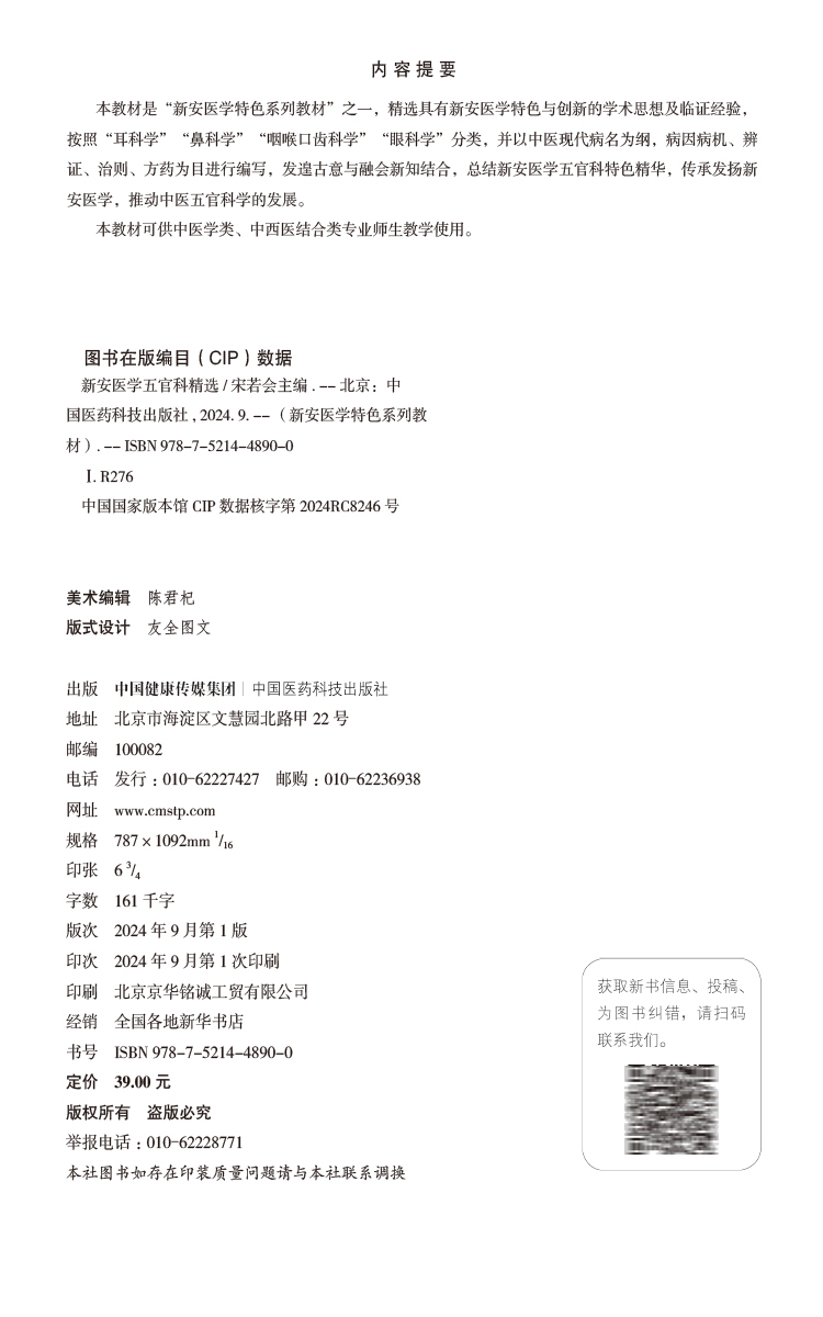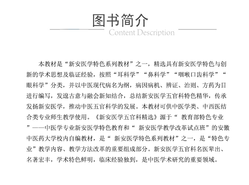 本教材是“新安医学特色系列教材”之一,精选具有新安医学特色与创新的学术思想及临证经验,按照“耳科学”“鼻科学”“咽喉口齿科学”“眼科学”分类,并以中医现代病名为纲,病因病机、辨证、治则、方药为目进行编写,发遑古意与融会新知结合,总结新安医学五官科特色精华,传承发扬新安医学,推动中医五官科学的发展。本教材可供中医学类、中西医结合类专业师生教学使用。《新安医学五官科精选》源于“ 教育部特色专业”——中医学专业新安医学特色教育和“ 新安医学教学改革试点班”的安徽中医药大学校内自编教材,是“ 新安医学特色系列教材”之一,是“特色专业”教学内容、教学方法改革的重要组成部分。新安医学五官科名医辈出、名著宏丰,学术特色鲜明,临床经验独到,是中医学术研究的重要领域。《新安医学五官科精选》是在阅读大量新安医学原著的基础上编写而成,教材中以中医现代病名为纲,病因病机、辨证、治则、方药为目,进行归类;对归类后的文献按新安医学著作时间先后进行纵向分析,理清学术源流;最后,与非新安的中医文献进行横向比较研究,总结出新安医学五官科学术精华与临床经验的创新之处、独到之处、特色之处。研究以新安医学文献为依据,采用传统方法和现代方法结合,回顾性研究和前瞻性研究结合,发遑古意与融会新知结合,总结出新安医学五官科特色精华。研究成果以特色教材的特点和体例进行编撰。