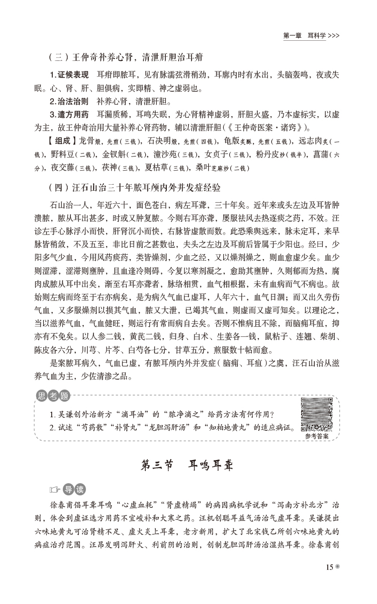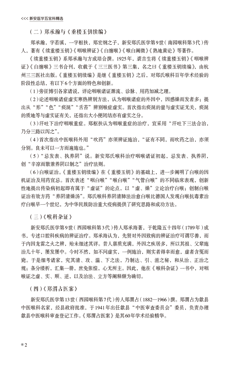 《新安医学五官科精选》分为“ 耳科学”“ 鼻科学”“ 咽喉口齿科学”“ 眼科学”四章,涉及28 个疾病,每个疾病为一节,分别从“ 病因病机认识”“ 病证诊断鉴别”“ 治法方药发挥”和“临床证治经验举例”四个方面阐述新安医学五官科的学术精华。本教材的编写过程中,新安医学郑氏喉科代表性传承人郑日新教授,在文献查阅解读、编排以及最后审订等方面等做了大量的工作,在此表示诚挚的感谢!