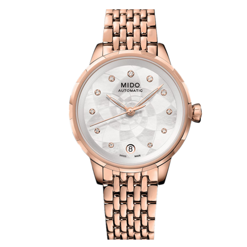镜面 材质 | 蓝宝石水晶玻璃 | 表盘 | PVD镀玫瑰金不锈钢表壳 白色珍珠贝母表盘,花淅系列专属图案花纹刻饰,同色调珠光盘圈,11颗真钻(共0.062克拉)作为刻度装饰,从6点钟位置到12点钟位置逐渐变大;白色珍珠贝母表盘,花淅系列专属图案花纹刻饰,同色调珠光盘圈,11颗真钻(共0.062克拉)作为刻度装饰,从6点钟位置到12点钟位置逐渐变大。 日期显示 密底 |