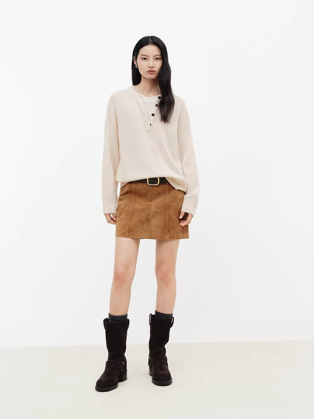 纽扣装饰更是点睛之笔,简约又不失设计感。搭配深棕阔腿牛仔裤 + 中筒鞋,利用同色系大地色延伸,打造干练知性的职场氛围,羊毛的柔和感中和裤装的硬朗。