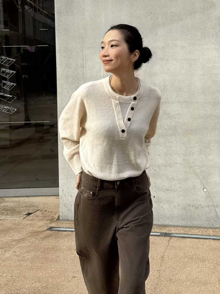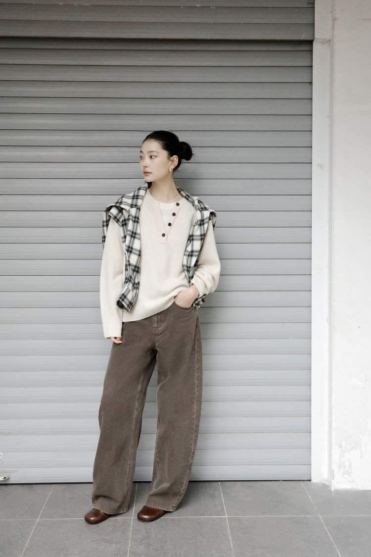 搭配咖色阔腿牛仔裤,复古色调 + 垂坠版型,中和了上衣的柔和,增添了复古沉稳感,和米白针织形成温柔的大地色系对比,温柔耐看又日常。