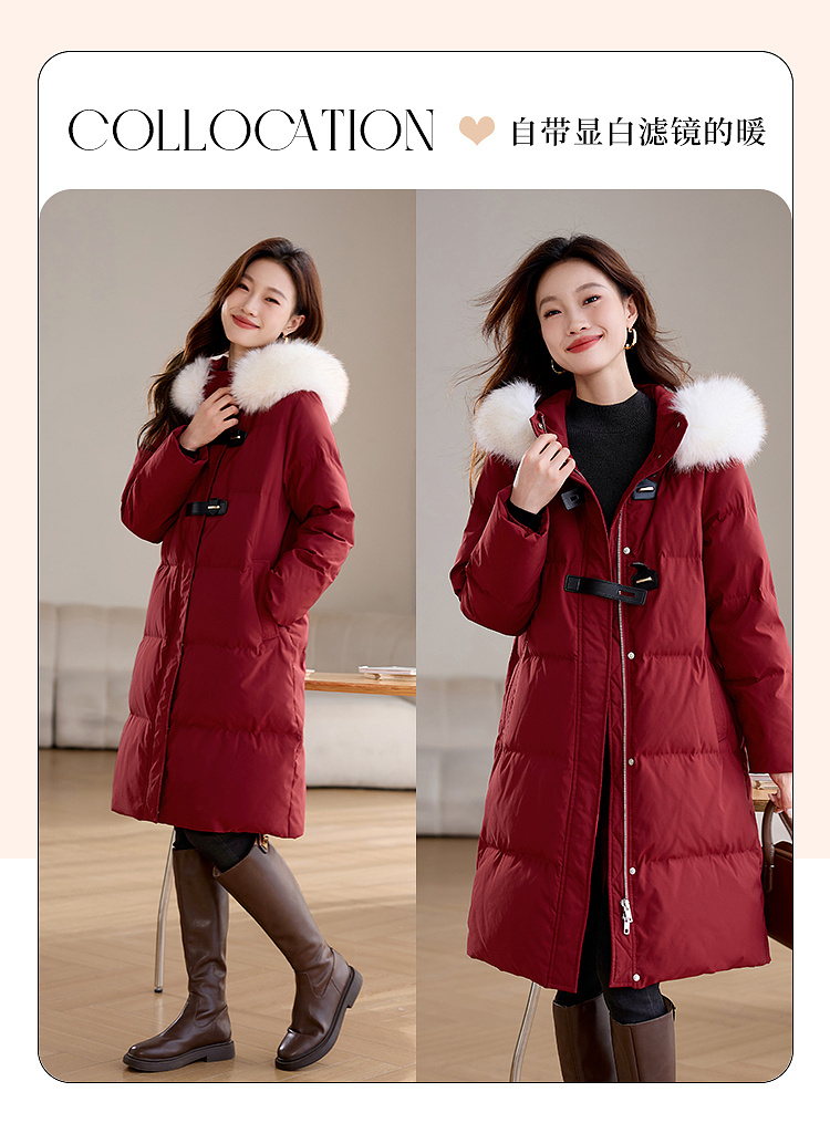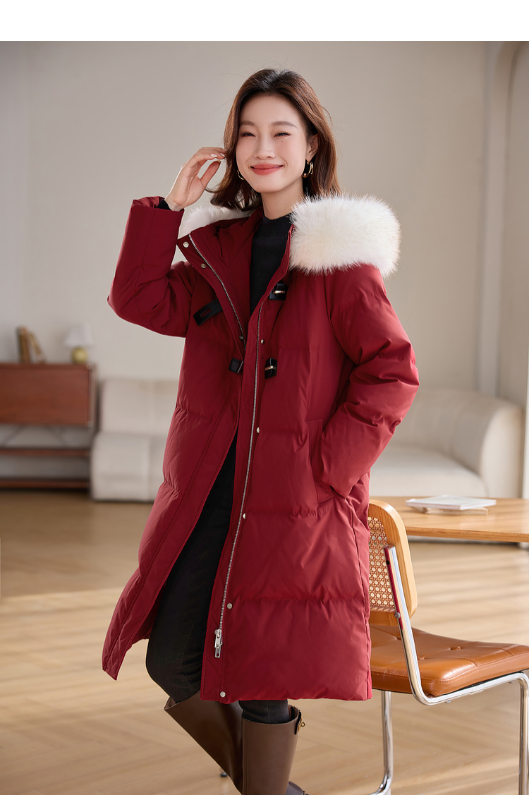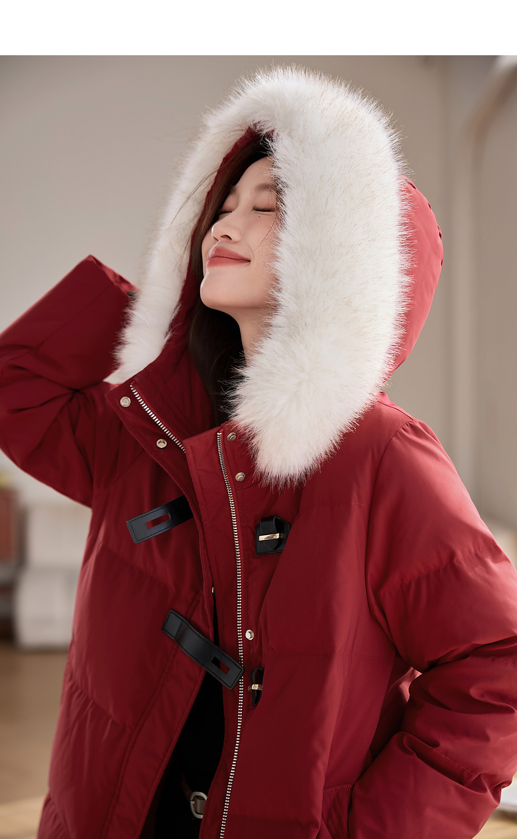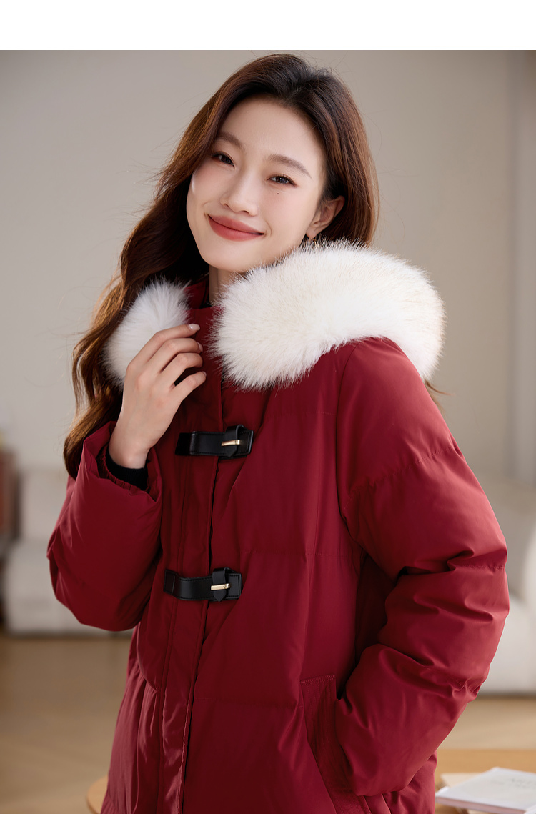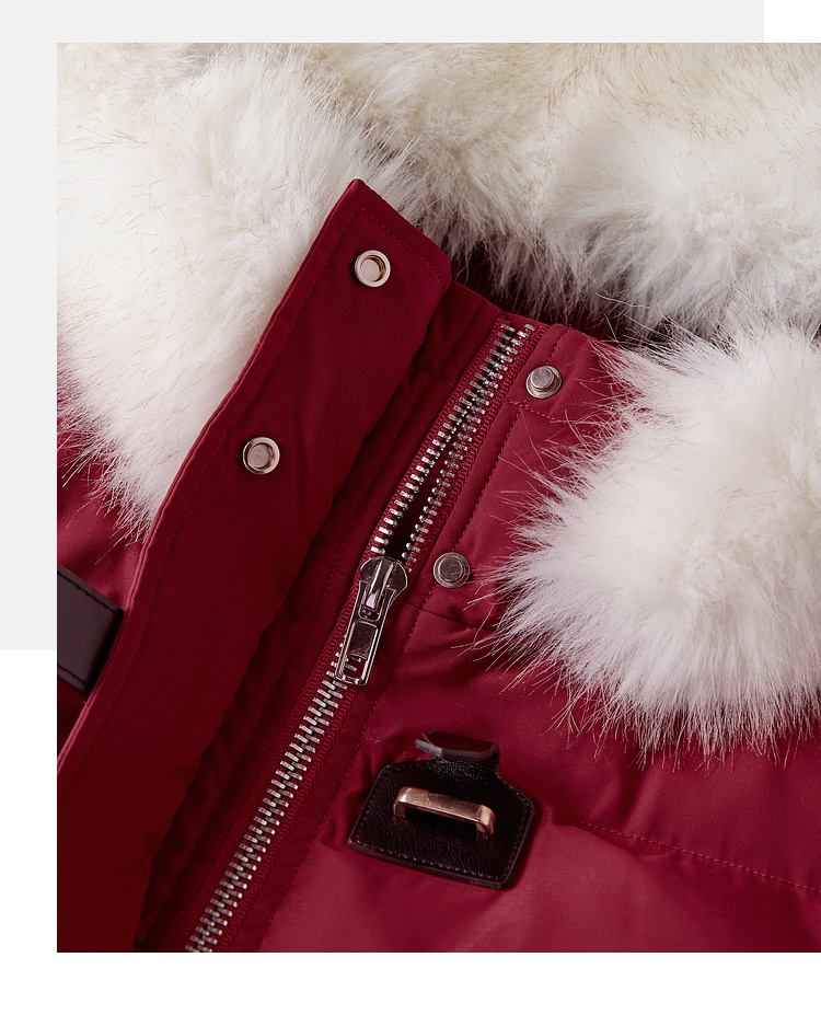 【年货节】熙世界90白鸭绒羽绒服中长款酒红色连帽外套冬季保暖可拆卸毛领