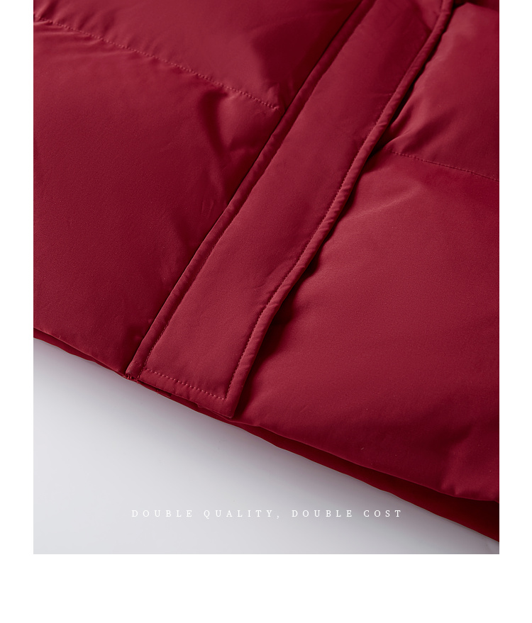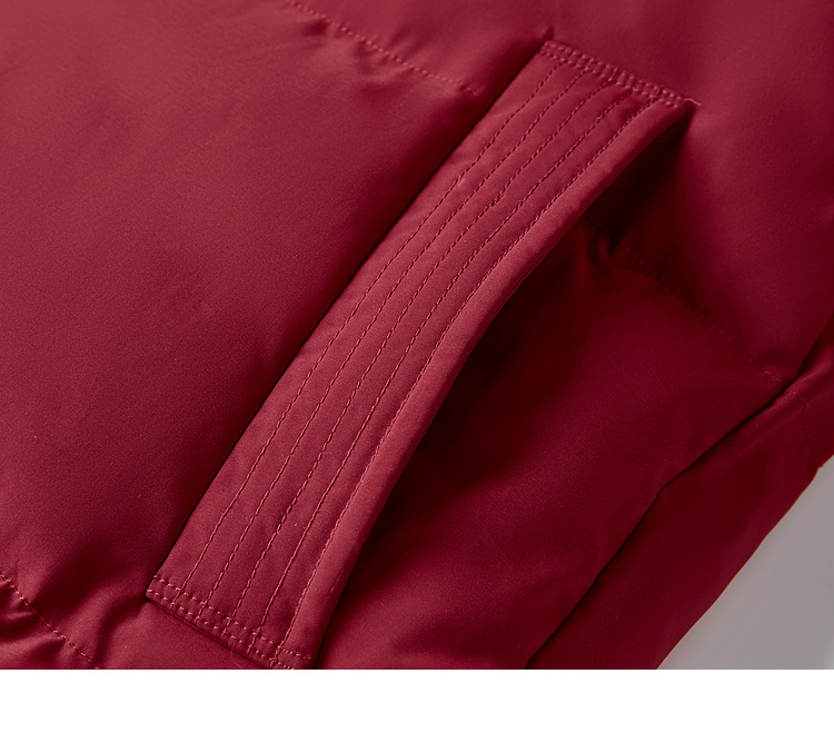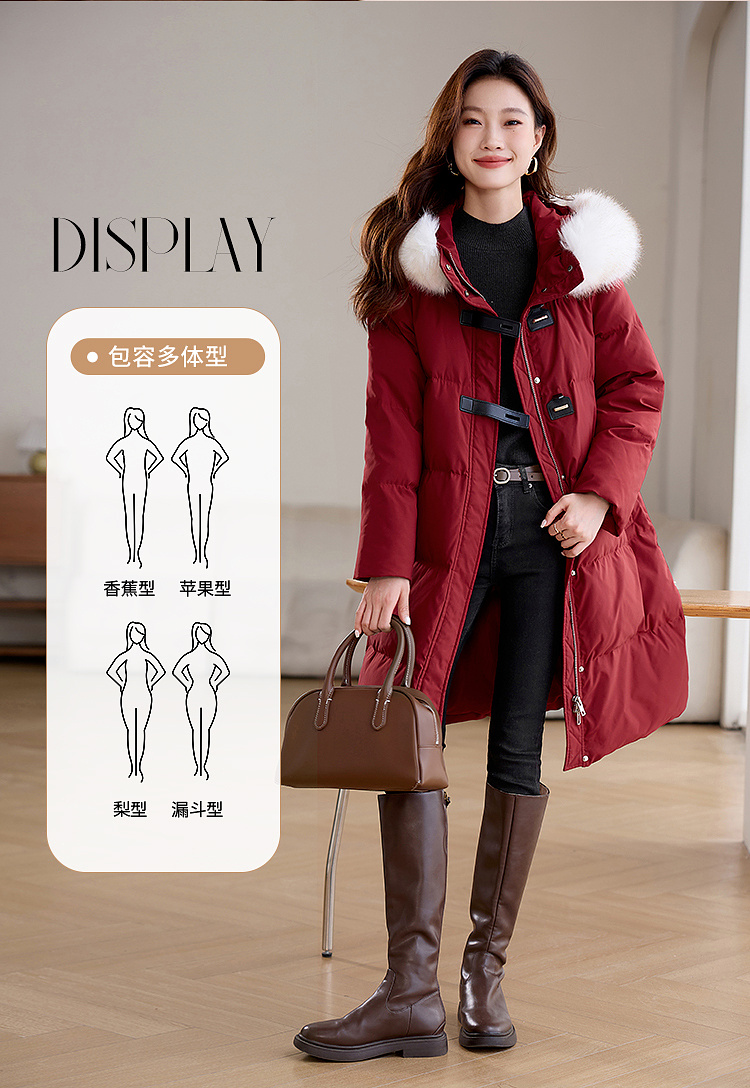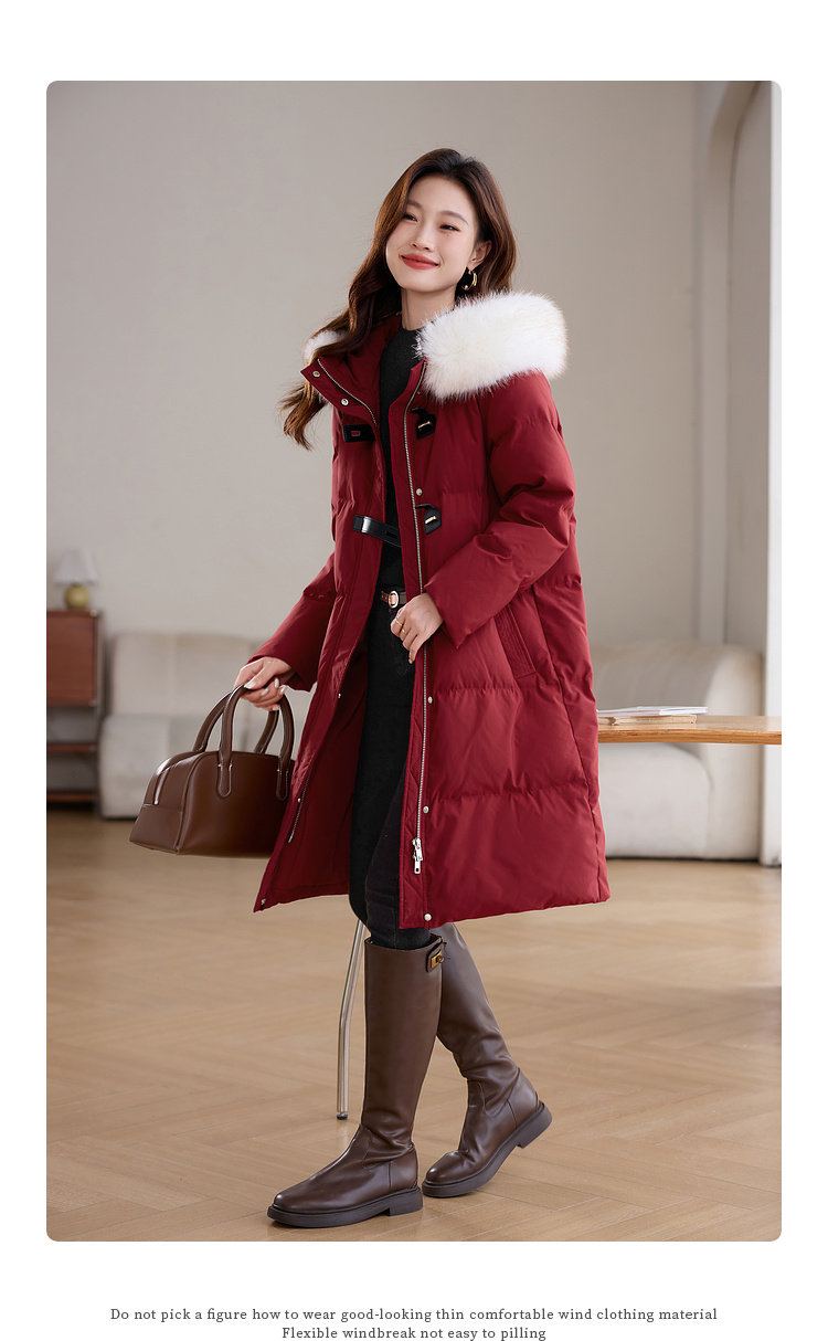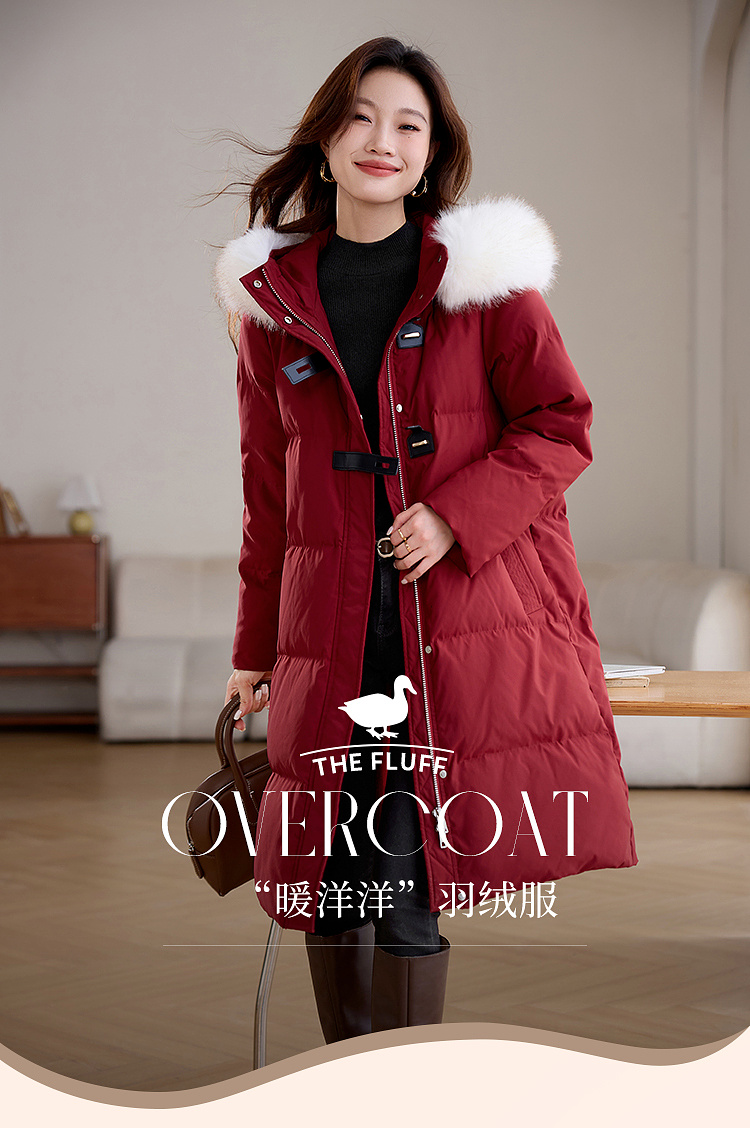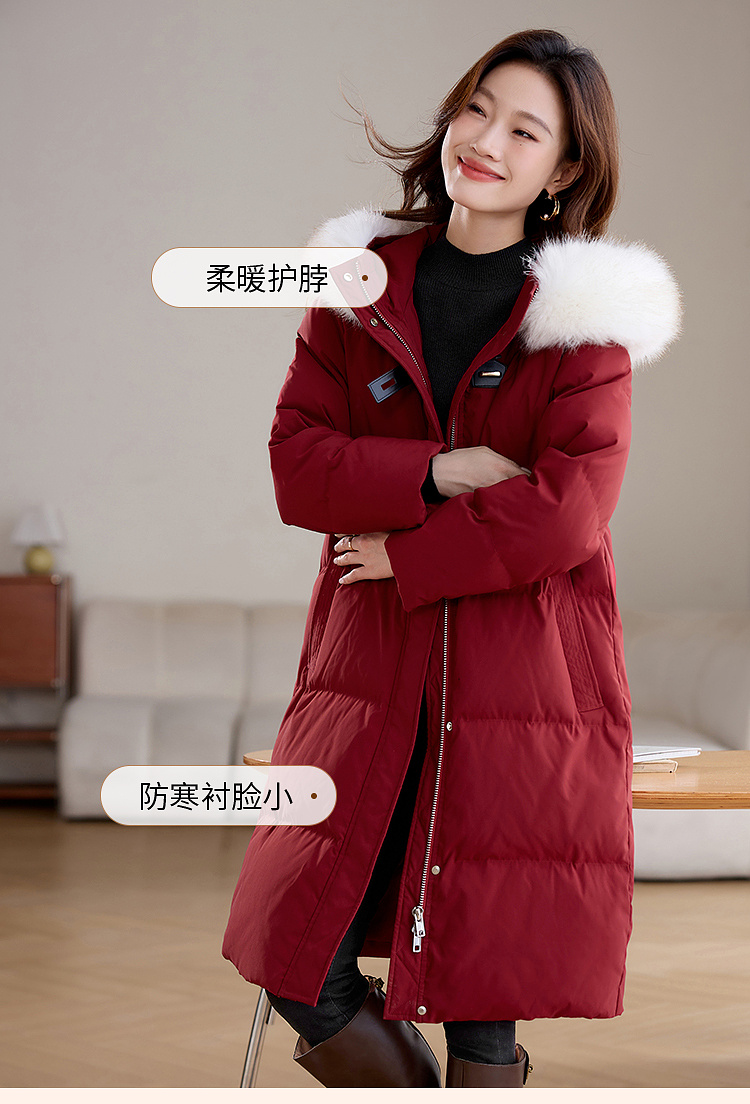 【年货节】熙世界90白鸭绒羽绒服中长款酒红色连帽外套冬季保暖可拆卸毛领