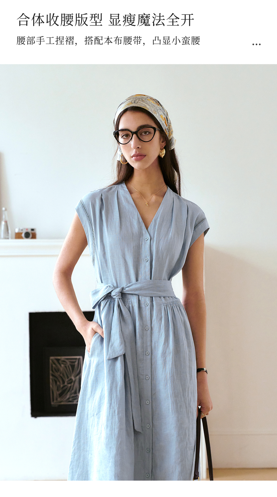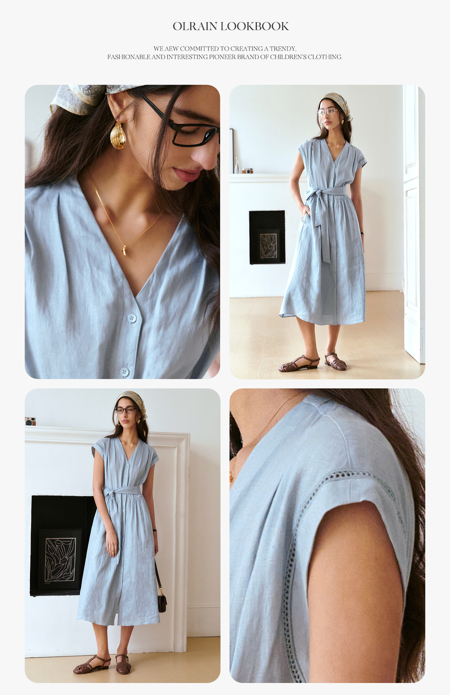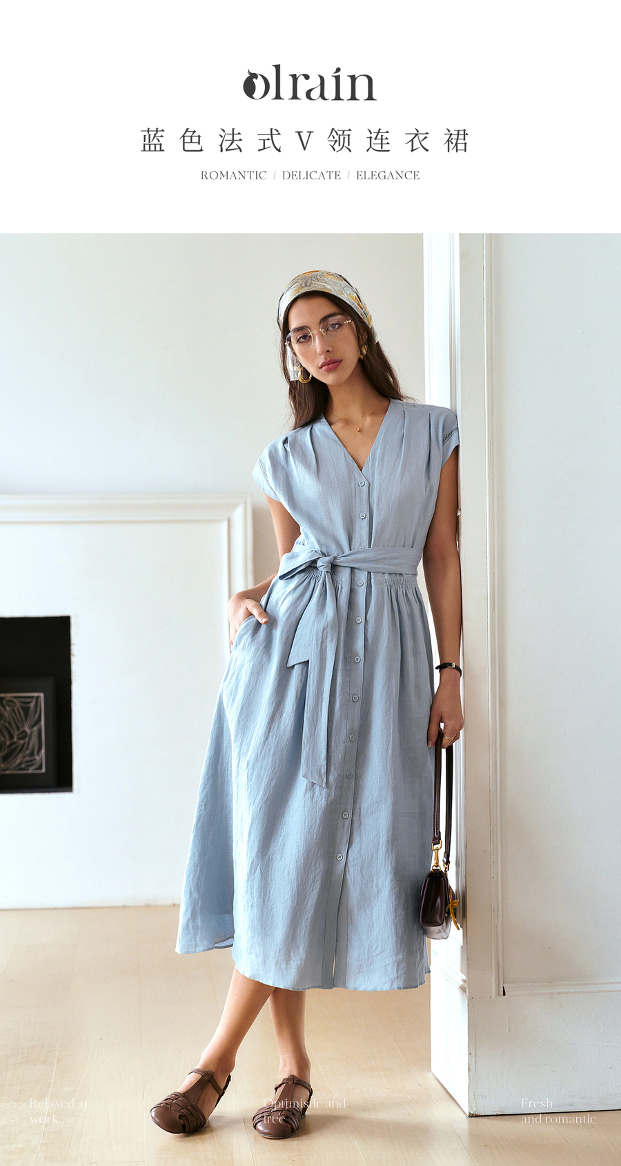 OLrain欧芮儿蓝色法式V领连衣裙女夏季2025新款精致御姐风长裙子