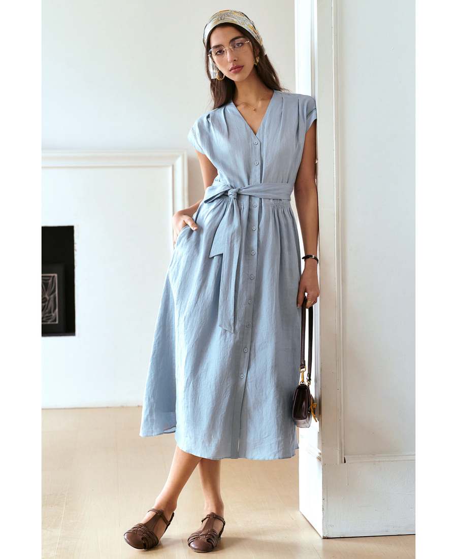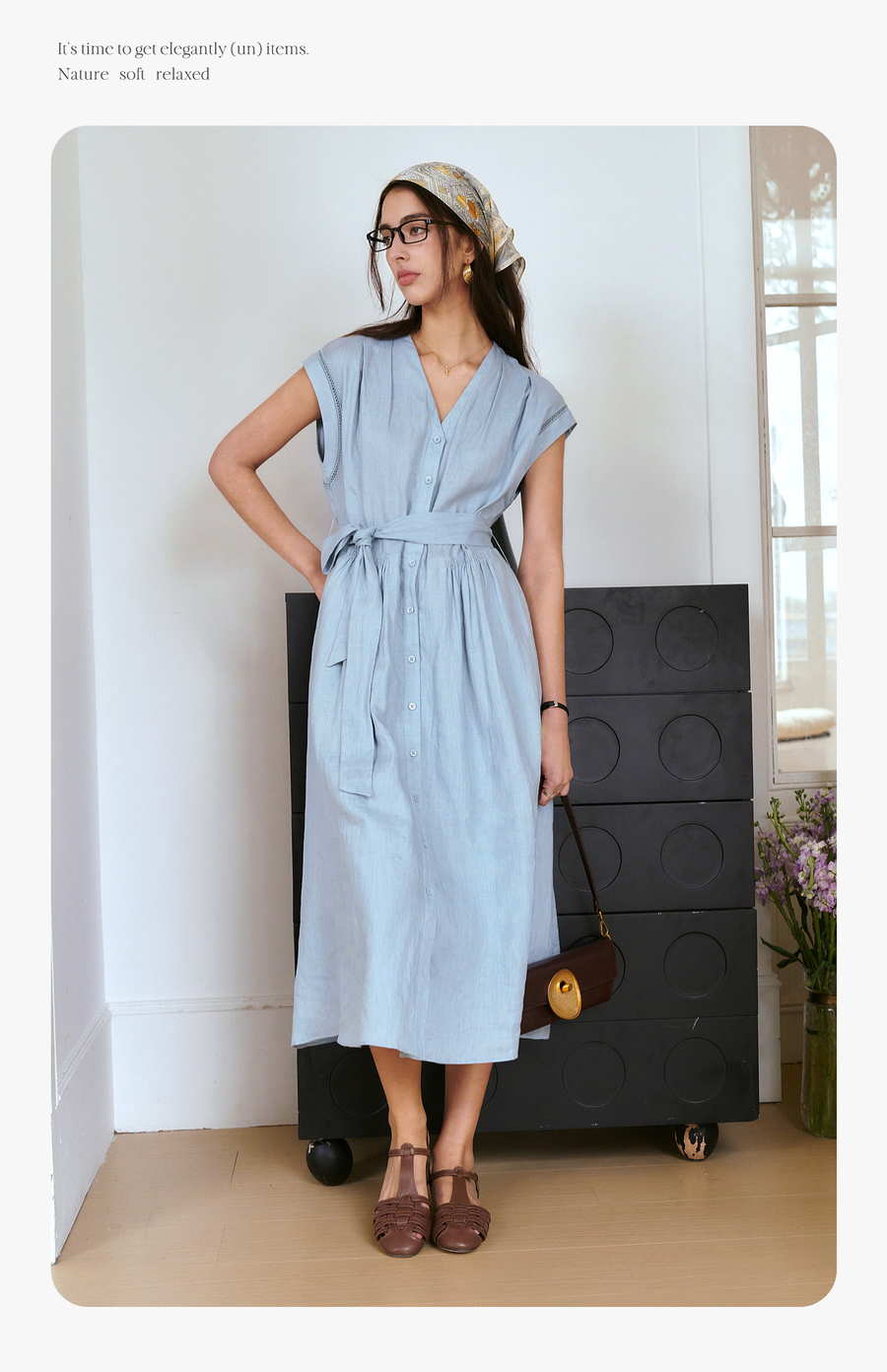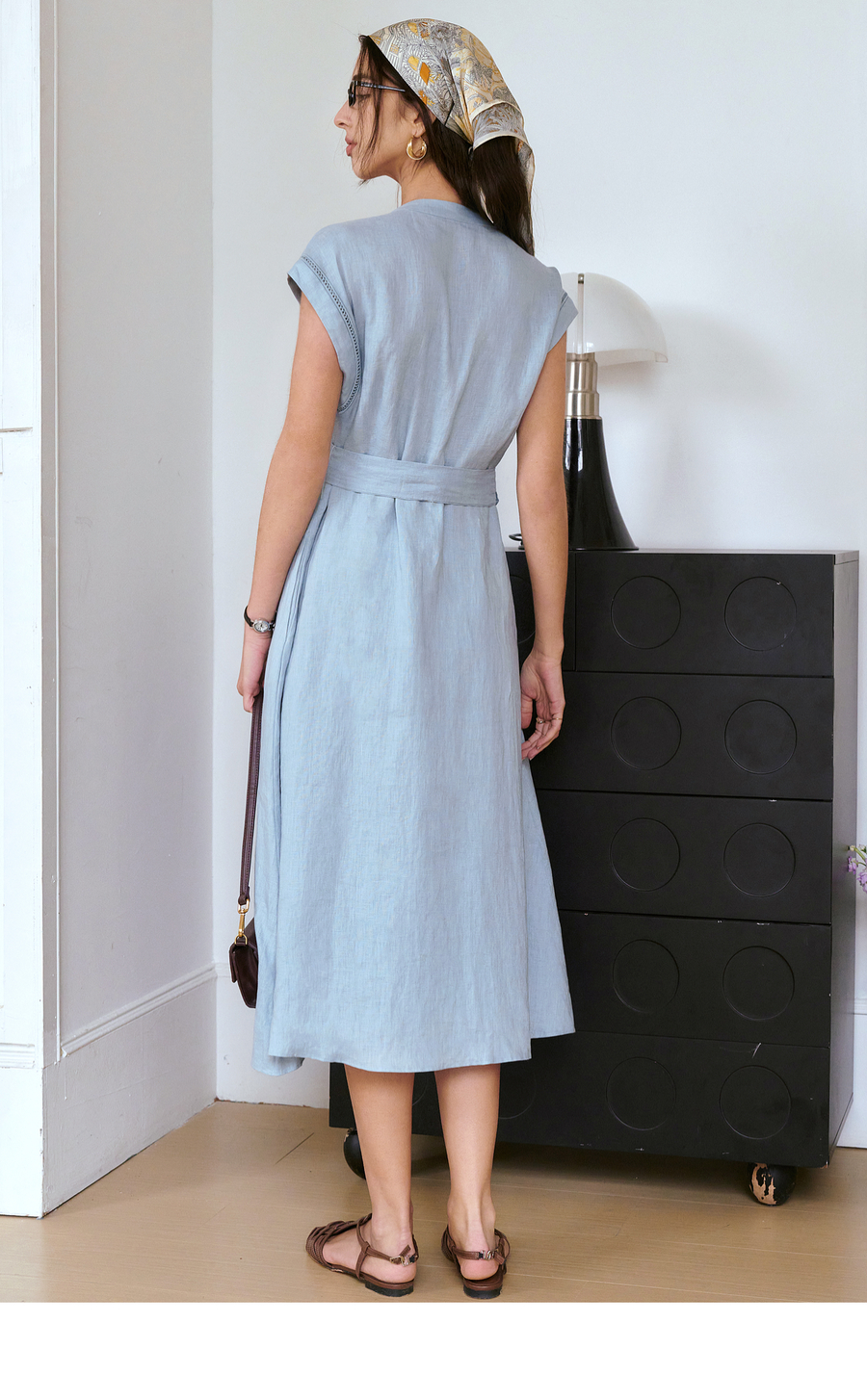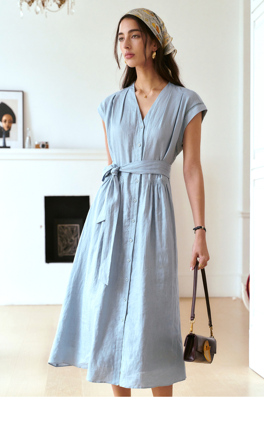 OLrain欧芮儿蓝色法式V领连衣裙女夏季2025新款精致御姐风长裙子