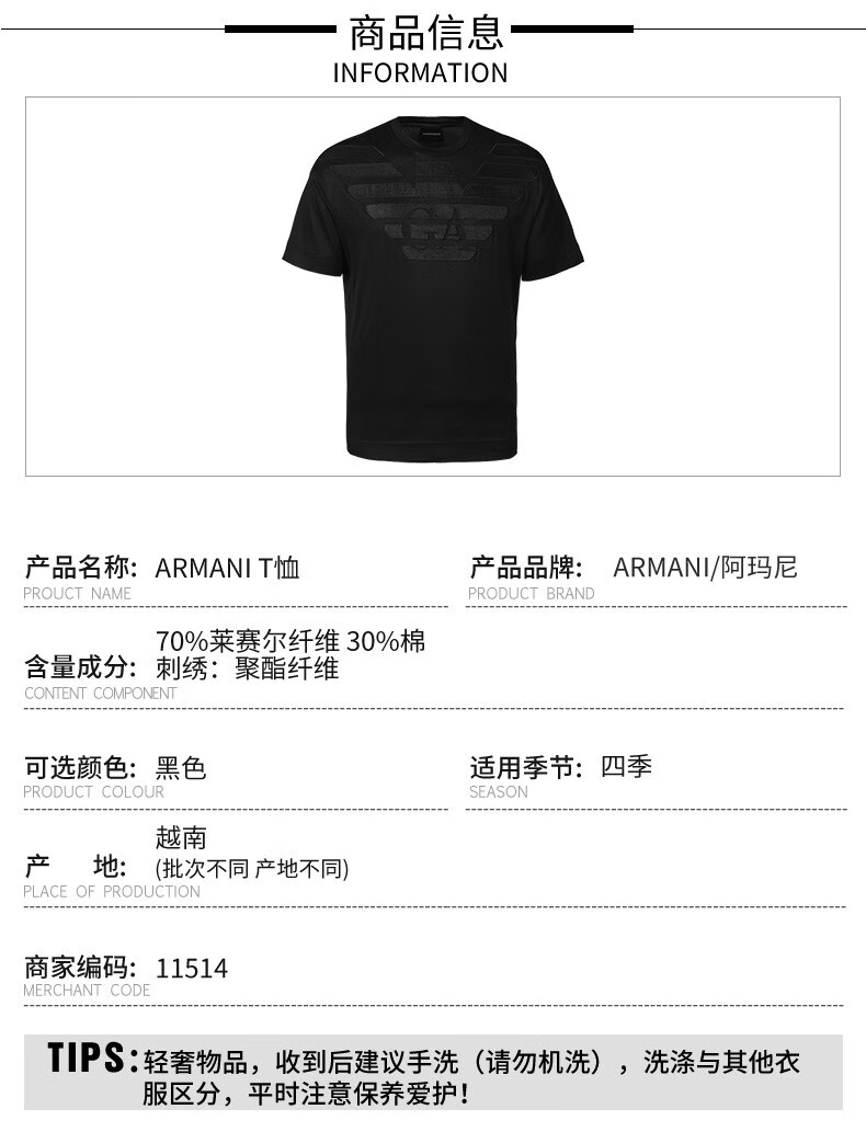 阿玛尼(ARMANI)男士贯肩飞鹰logo百搭时尚休闲短袖T恤 11514