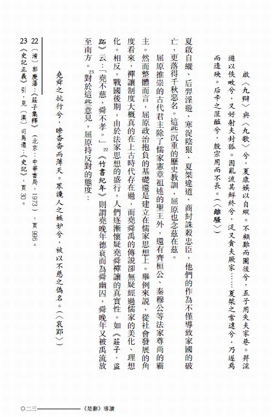 近代大學者梁啟超說:「吾以為凡為中國人者,須獲有欣賞《楚辭》之能力,乃為不虛生此國。」《楚辭》作為中國詩歌兩大源頭之一,與《詩經》齊名。《楚辭》產生的年代晚於《詩經》,是先秦南方文學的代表,體現了獨特的審美精神。東周以降,楚國長期吸收北方中原的文化,並將之結合本土文化,到戰國時代乃逐漸擺脫蠻夷之邦的形象。《楚辭》,就是兩種文化成功結合後的產物。《楚辭》和唐詩、宋詞一樣,具有高度的文學性,能使當代讀者滋生永恆不變的審美愉悅。