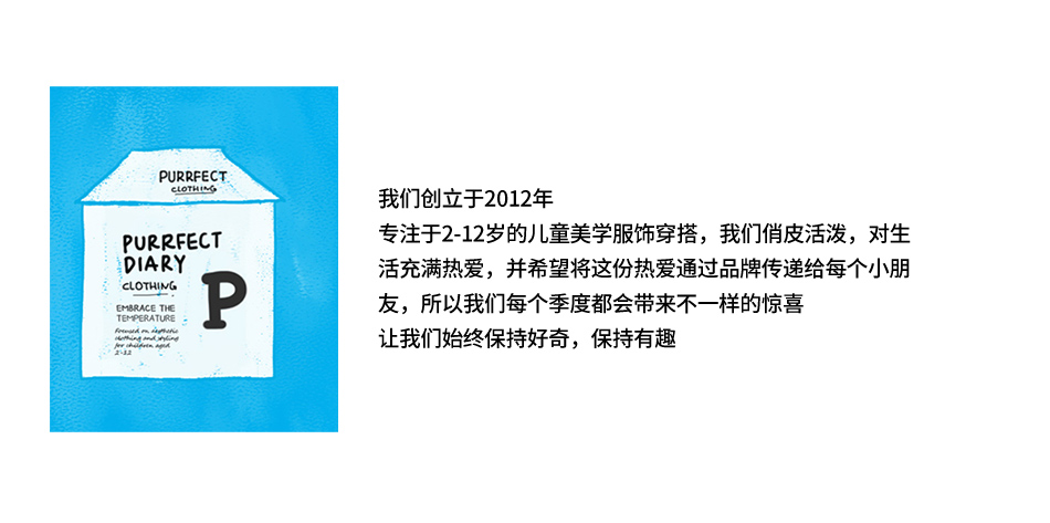 - Purrfect-Diary专注于贴近自然随性的穿着概念,轻奢平价的童装文化传播,在产品设计上更加注重婴童穿着的舒适性、安全性、更出众的国际化品牌,将欧美的育婴文化在中国进行深入的传播与推广。