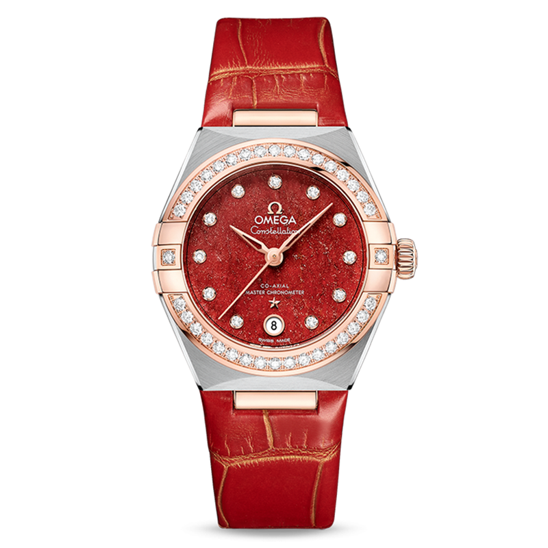 镜面材质 | 蓝宝石水晶玻璃 | 表盘 | 精钢‑Sedna 18K金表壳 搭配红色砂金石表盘,表圈铺镶钻石,6点位设有日历窗。指针、小时刻度、欧米茄品牌标识以及星徽标志以Sedna 18K金制成。 透底 |