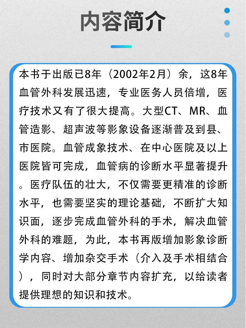 本书于出版已8年(2002年2月)余,这8年血管外科发展迅速,专业医务人员倍增,医疗技术又有了很大提高。大型CT、MR、血管造影、超声波等影象设备逐渐普及到县、市医院。血管成象技术、在中心医院及以上医院皆可完成,血管病的诊断水平显著提升。医疗队伍的壮大,不仅需要更精准的诊断水平,也需要坚实的理论基础,不断扩大知识面,逐步完成血管外科的手术,解决血管外科的难题,为此,本书再版增加影象诊断学内容、增加杂交手术(介入及手术相结合),同时对大部分章节内容扩充,以给读者提供理想的知识和技术。