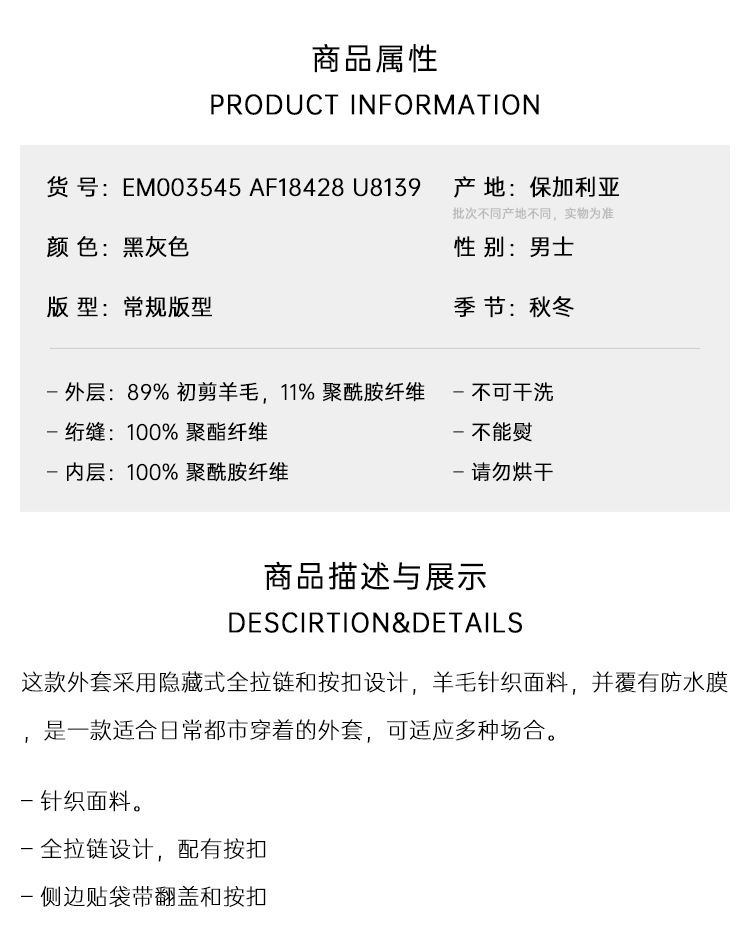 EMPORIO ARMANI 阿玛尼 男士全拉链羊毛针织外套 黑灰色 EM003545 AF18428 U8139