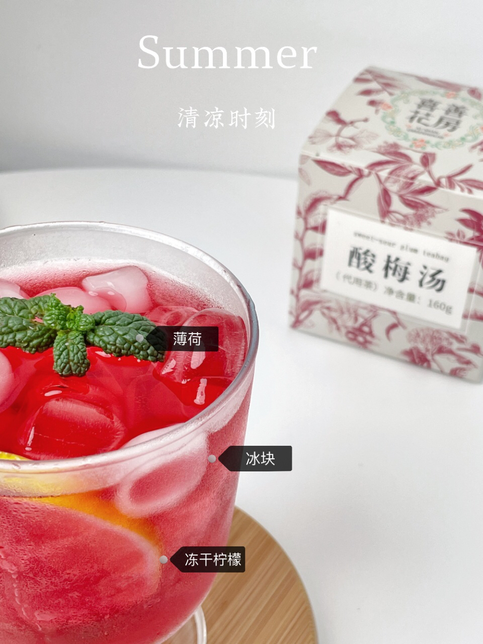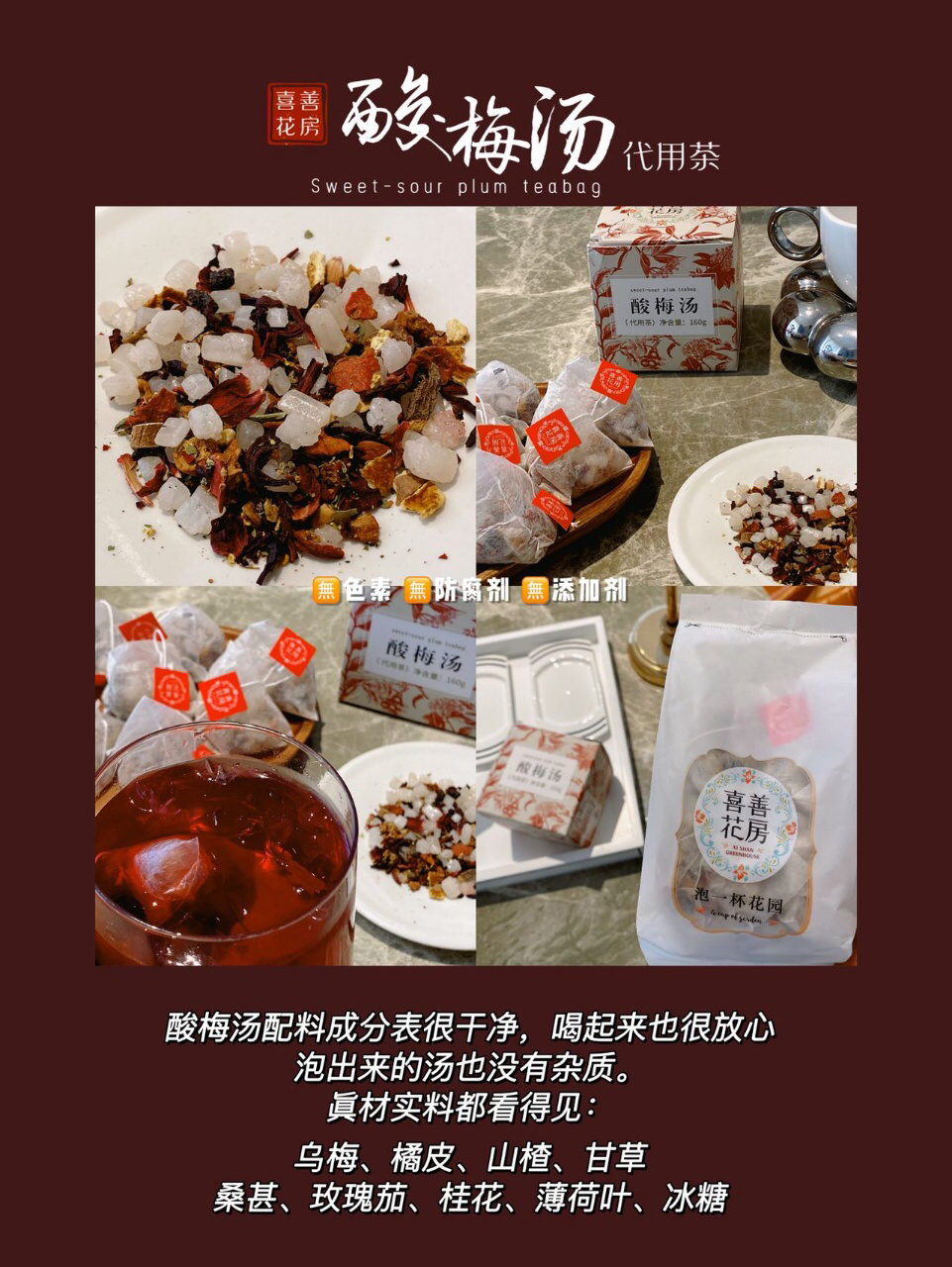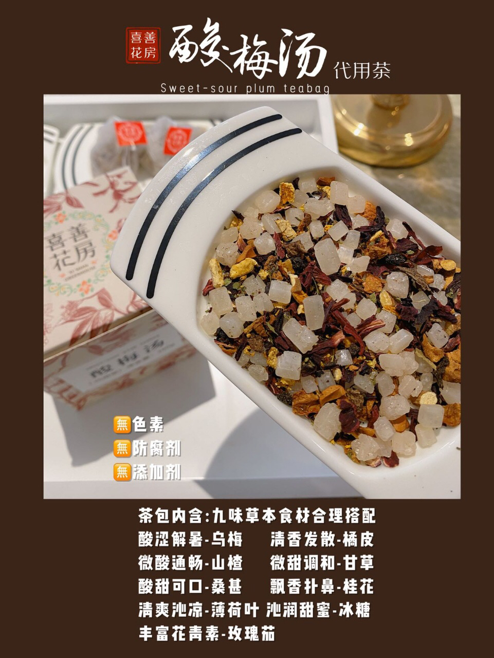 原料:乌梅、橘皮、山楂、甘草、桑葚、玫瑰茄、桂花,薄荷叶、冰糖