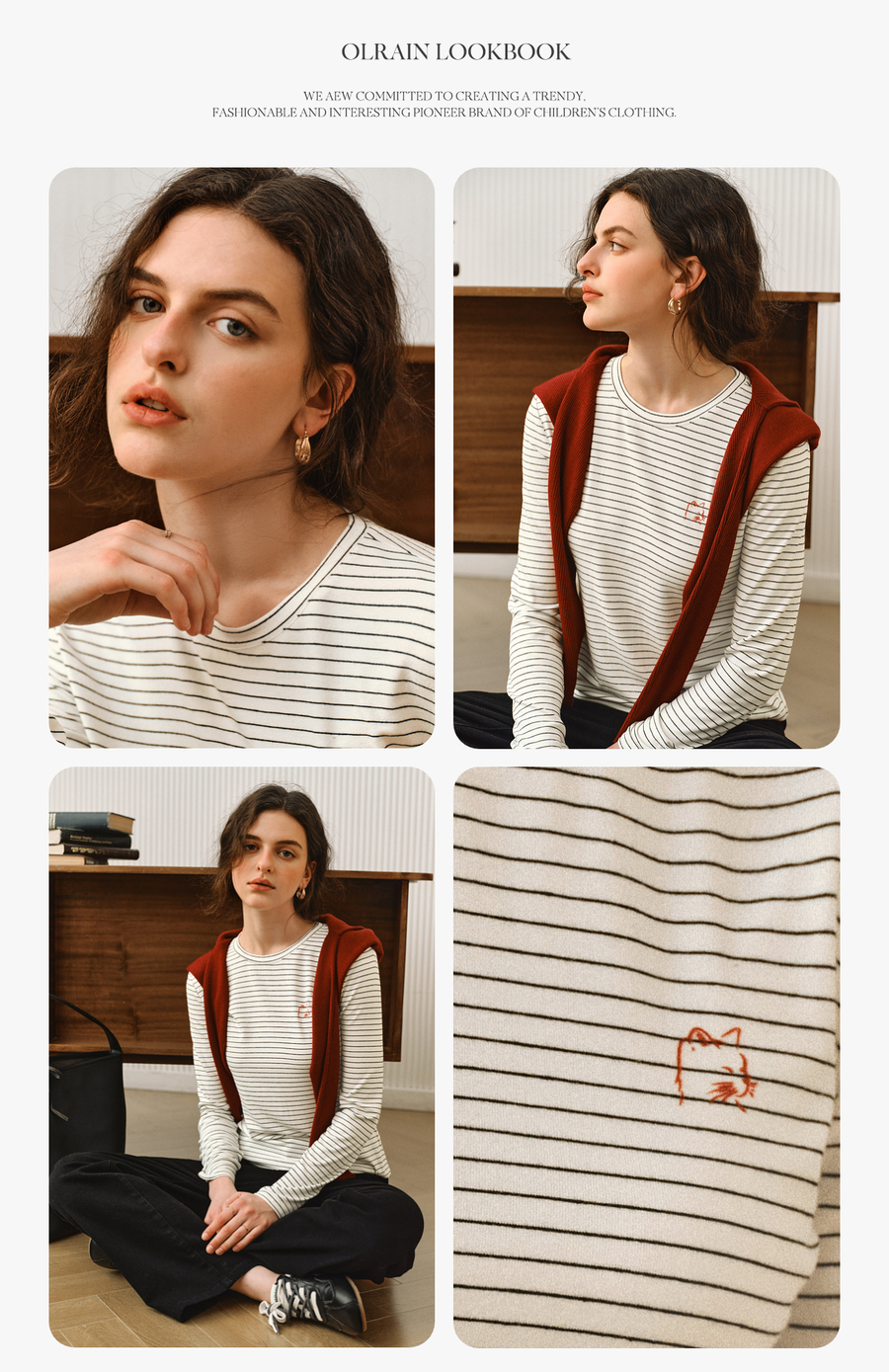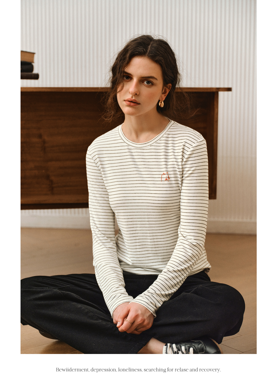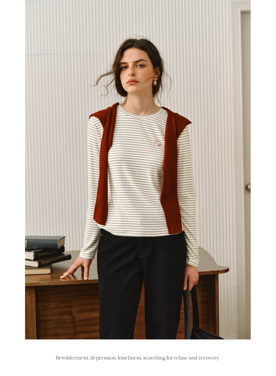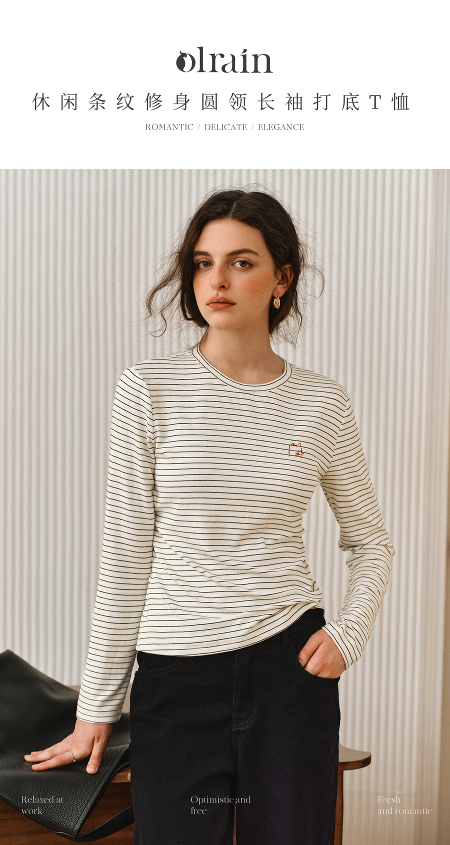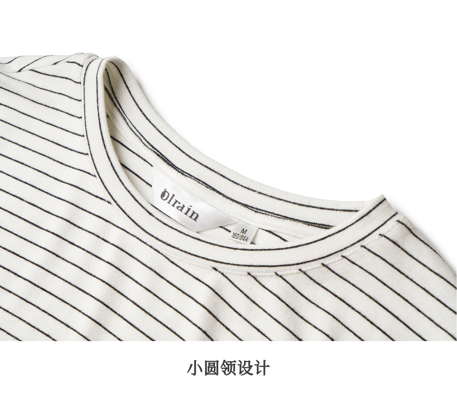 OLrain欧芮儿2025新款女秋季休闲慵懒条纹修身圆领长袖打底T恤