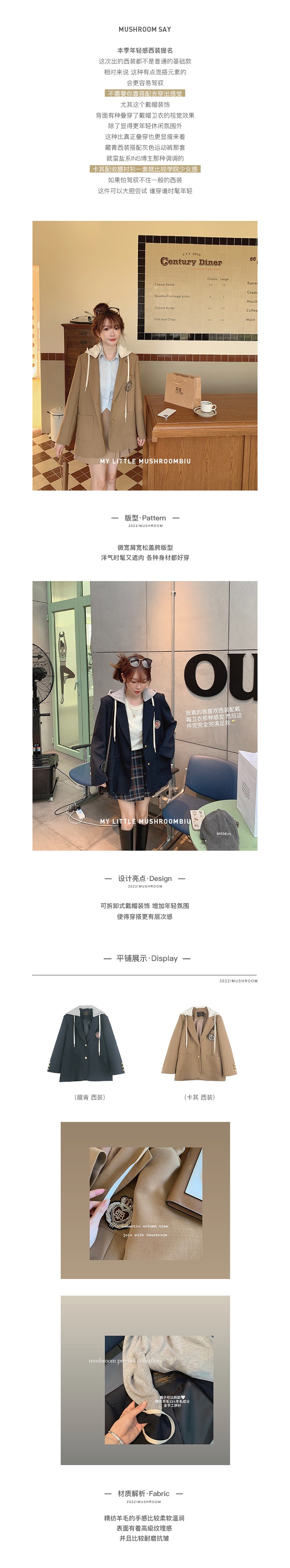 金蘑菇菇 纽约故事 / 2WAYs!假两件连帽短外套洋气学院小西装
