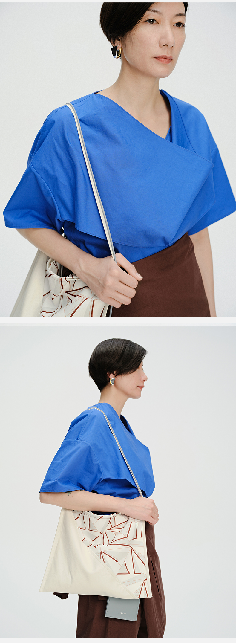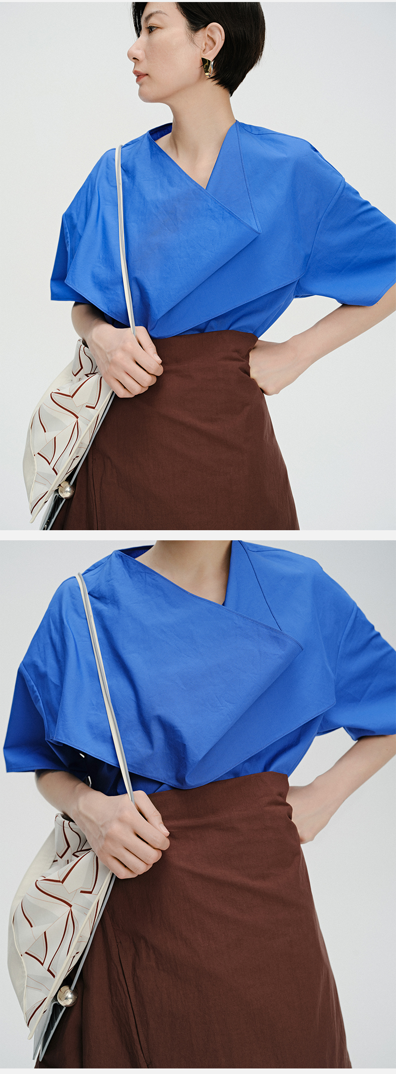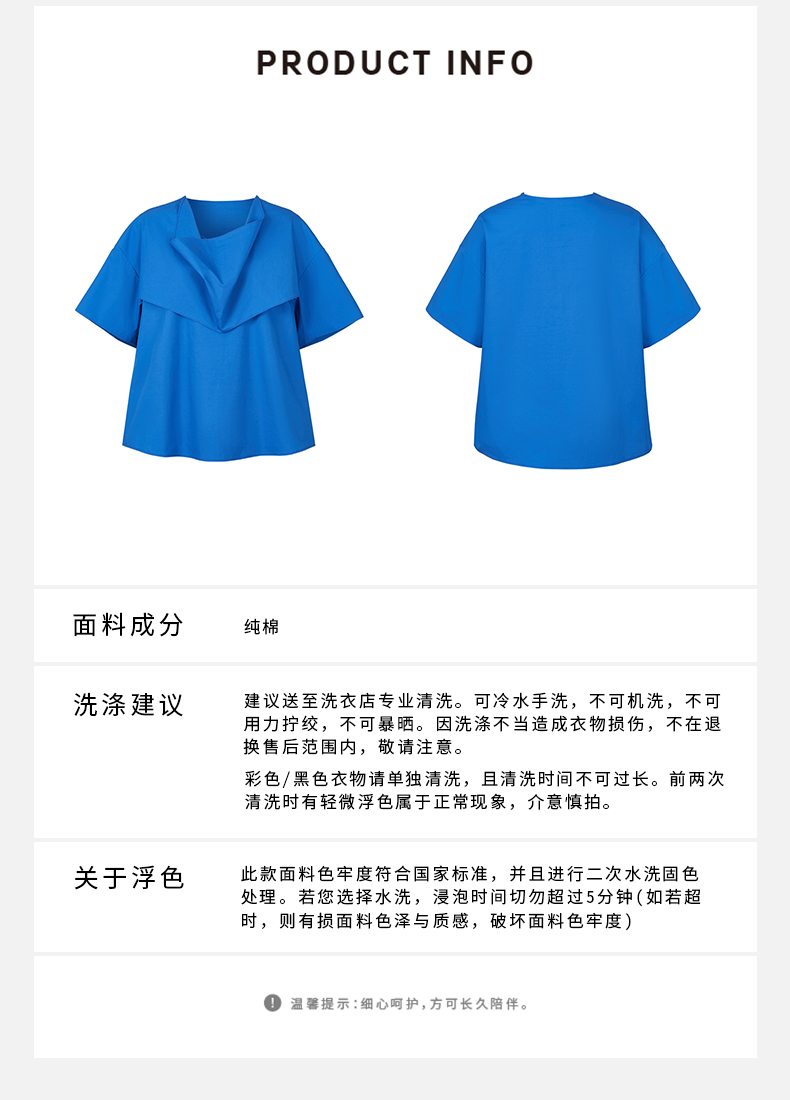 HIDEMI 克莱因蓝简约堆叠门襟双片式剪裁设计感自然棉质短袖衬衫