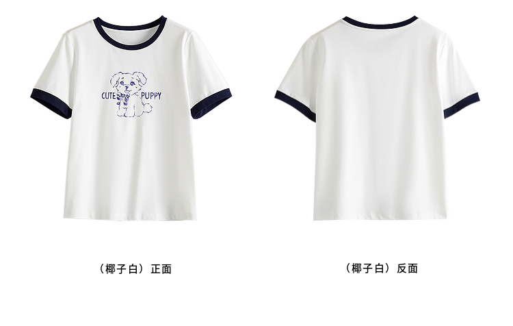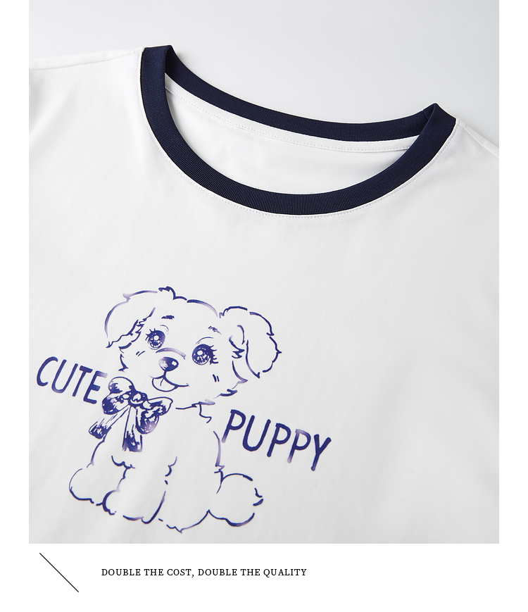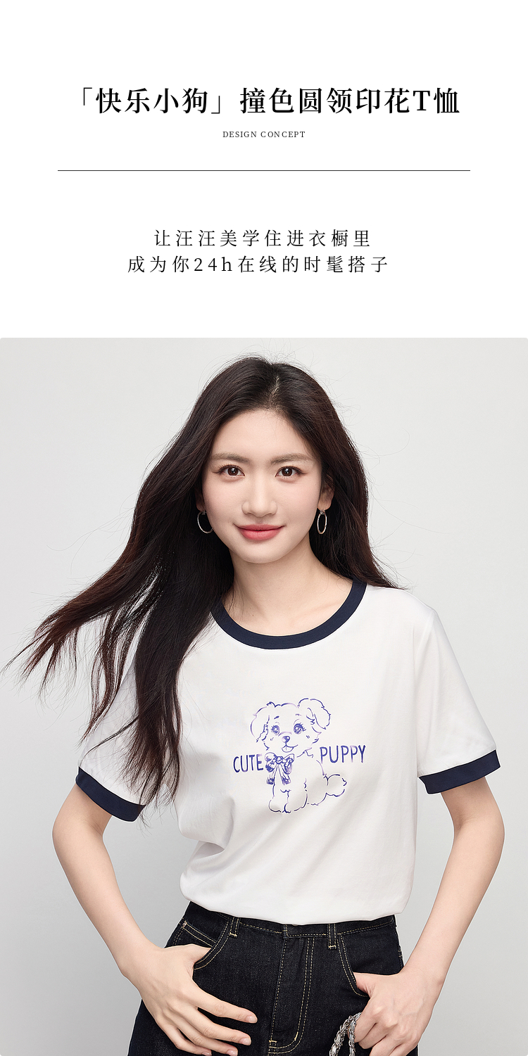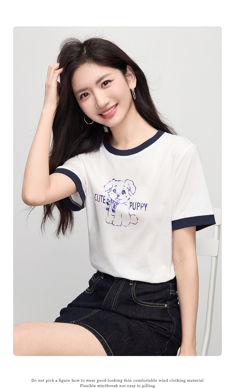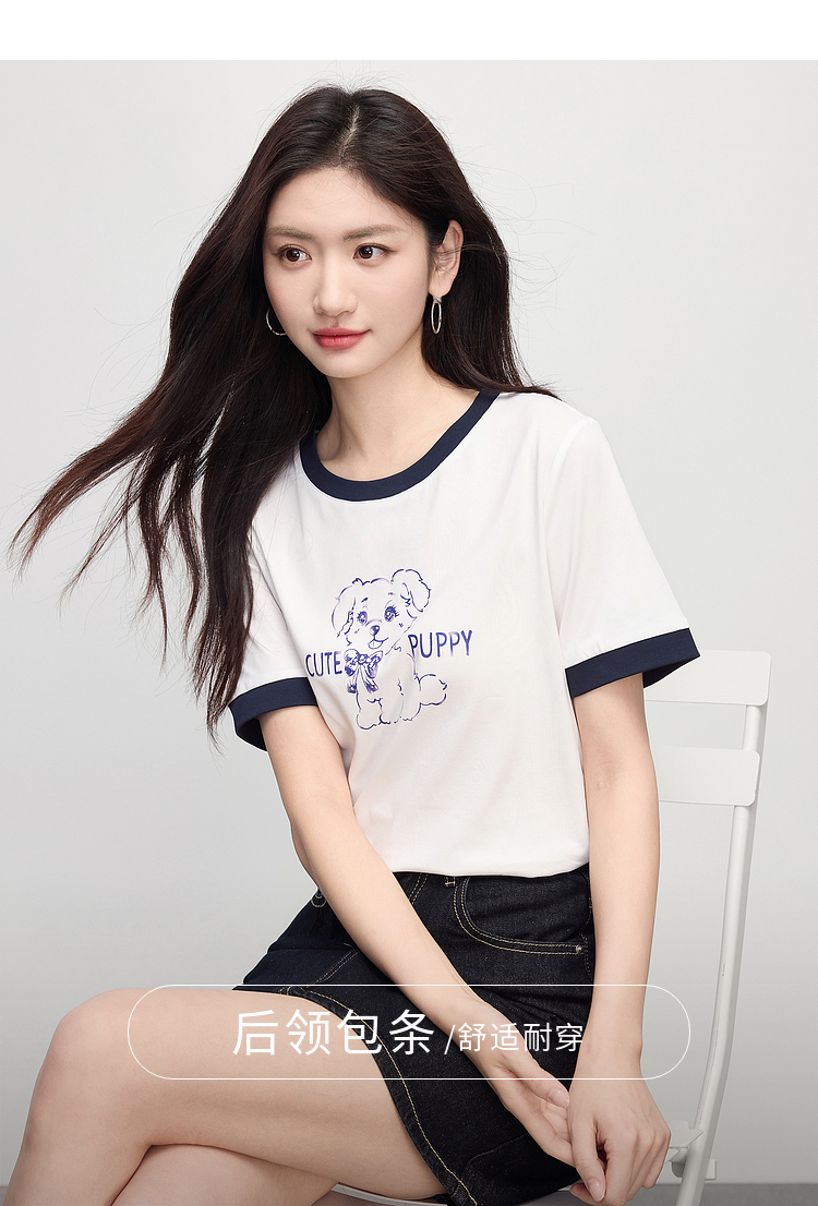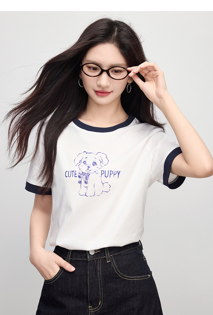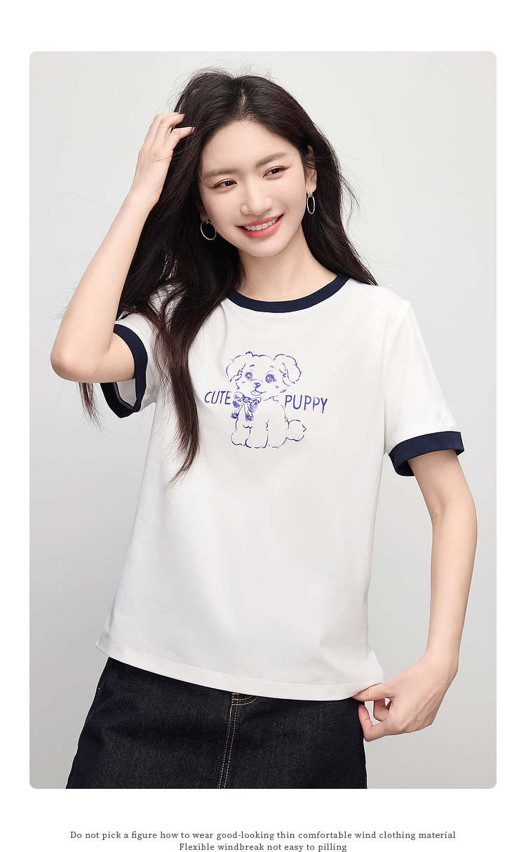 【专属特价】熙世界小狗印花T恤短袖女2025夏季新款减龄撞色圆领正肩体恤上衣