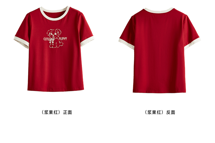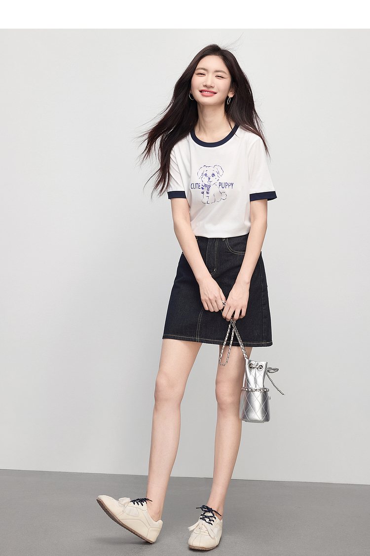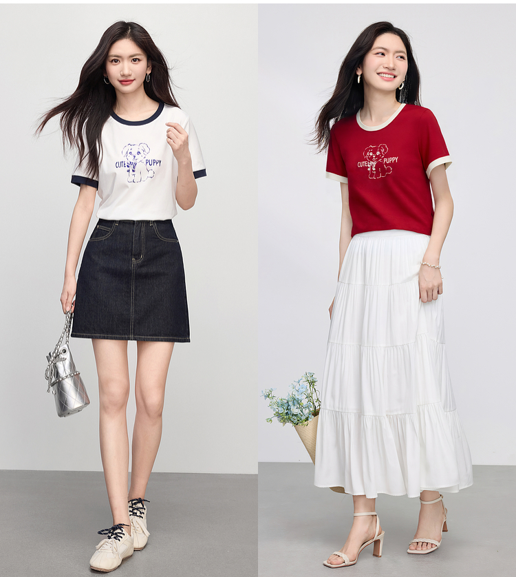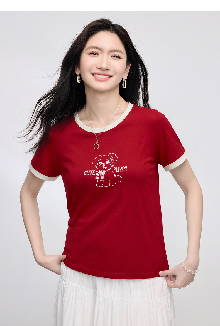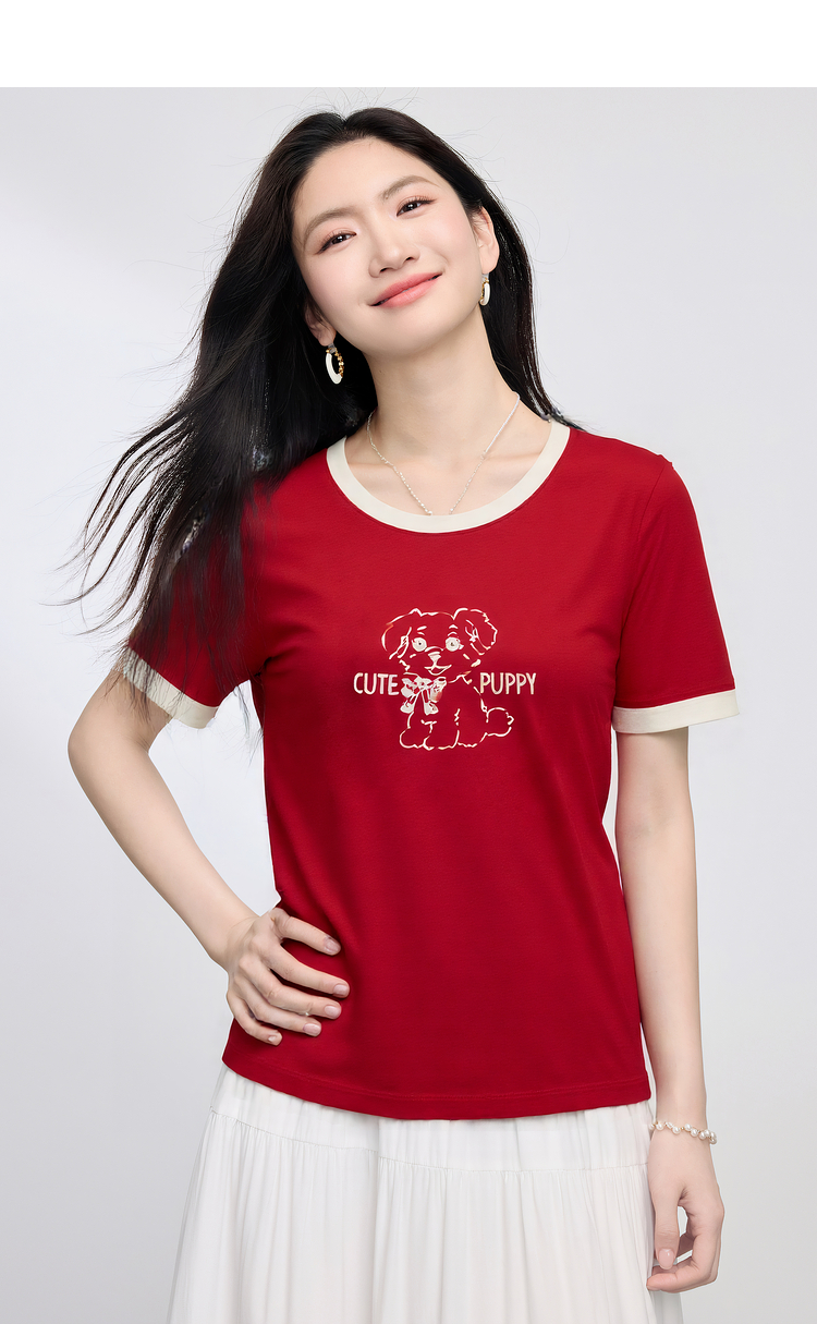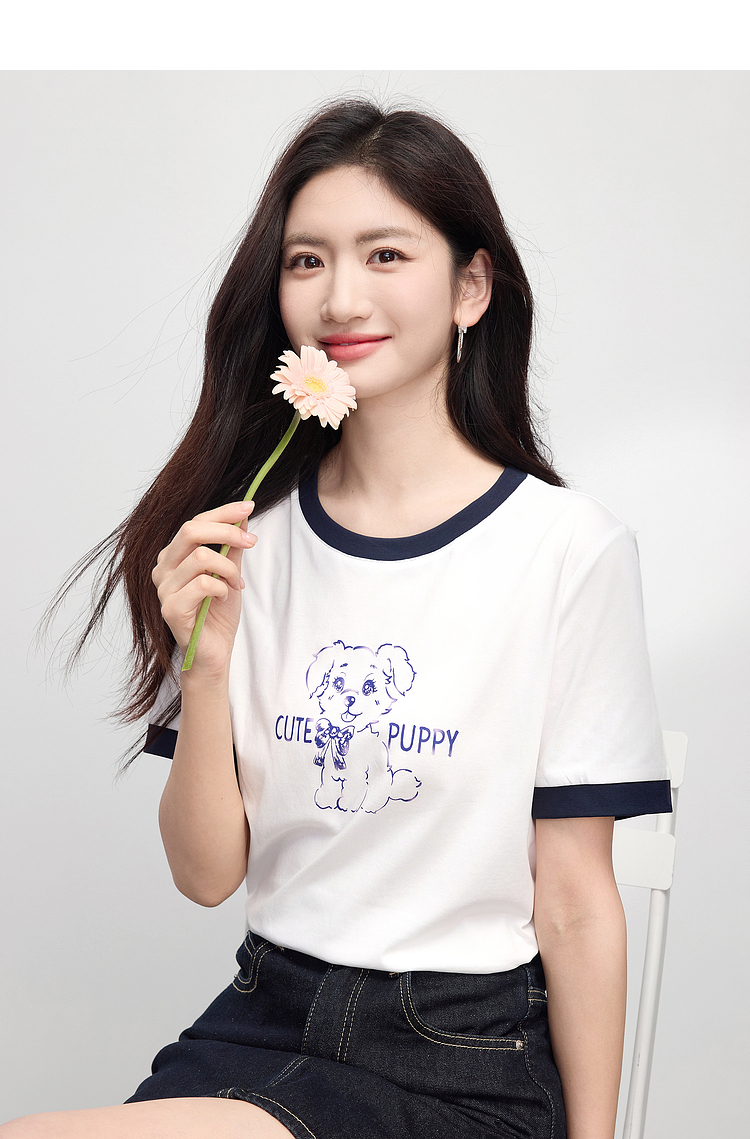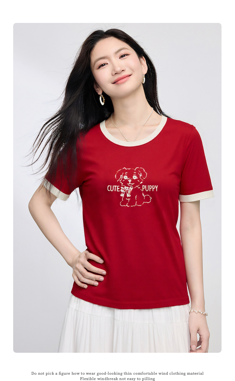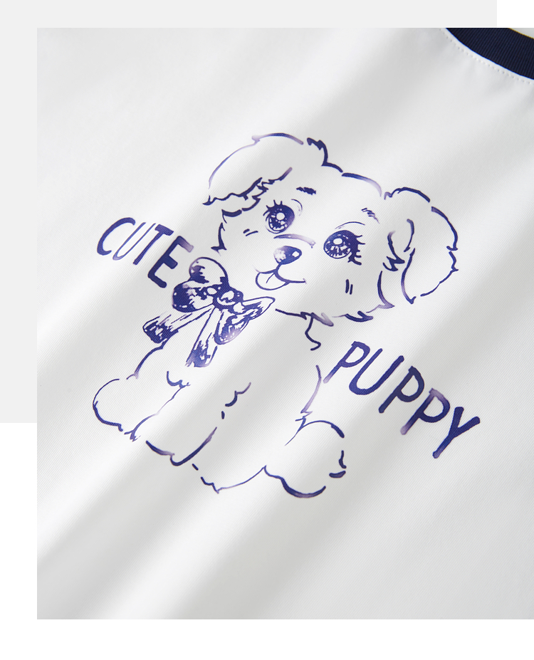 【专属特价】熙世界小狗印花T恤短袖女2025夏季新款减龄撞色圆领正肩体恤上衣