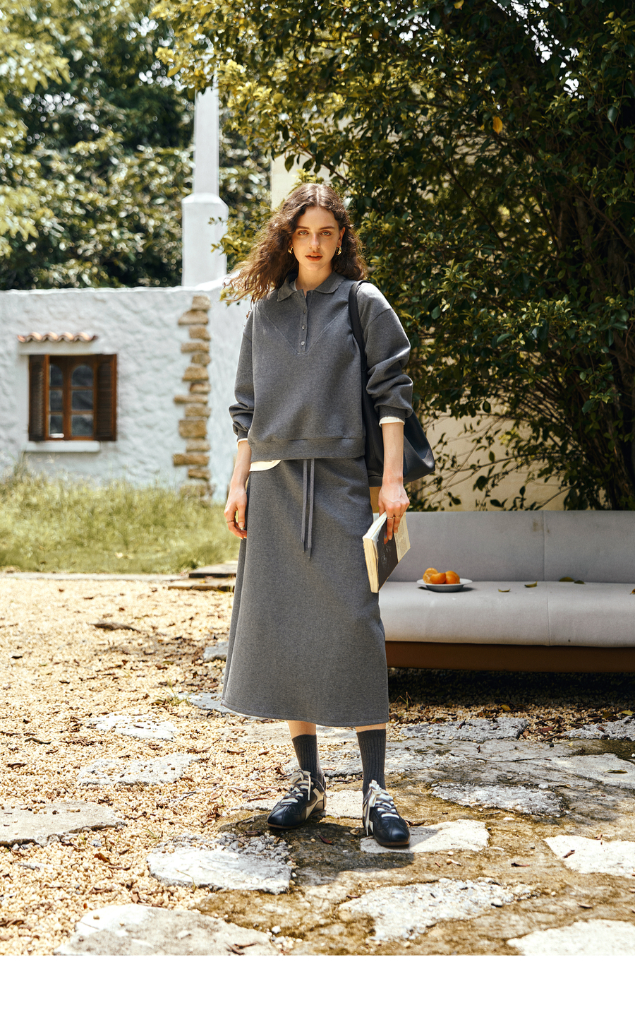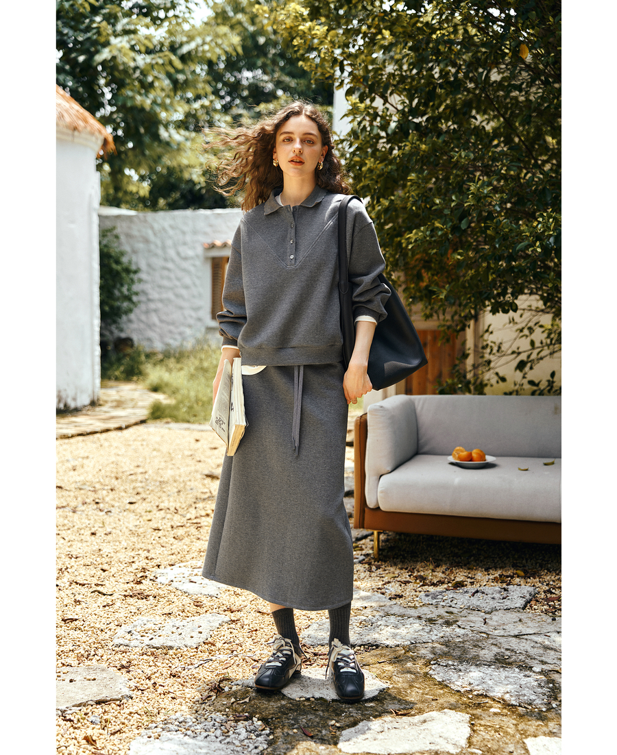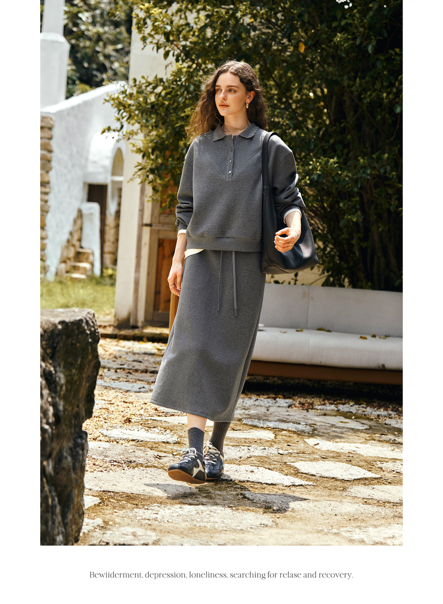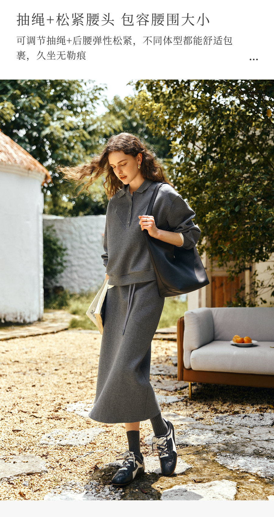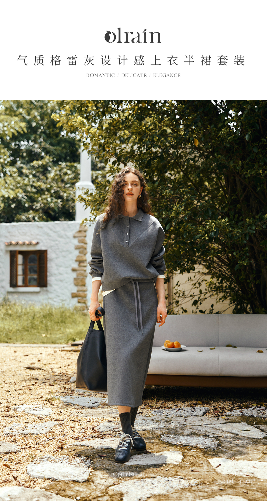 OLrain欧芮儿2025秋季新款女气质格雷系设计感深灰色上衣半裙套装